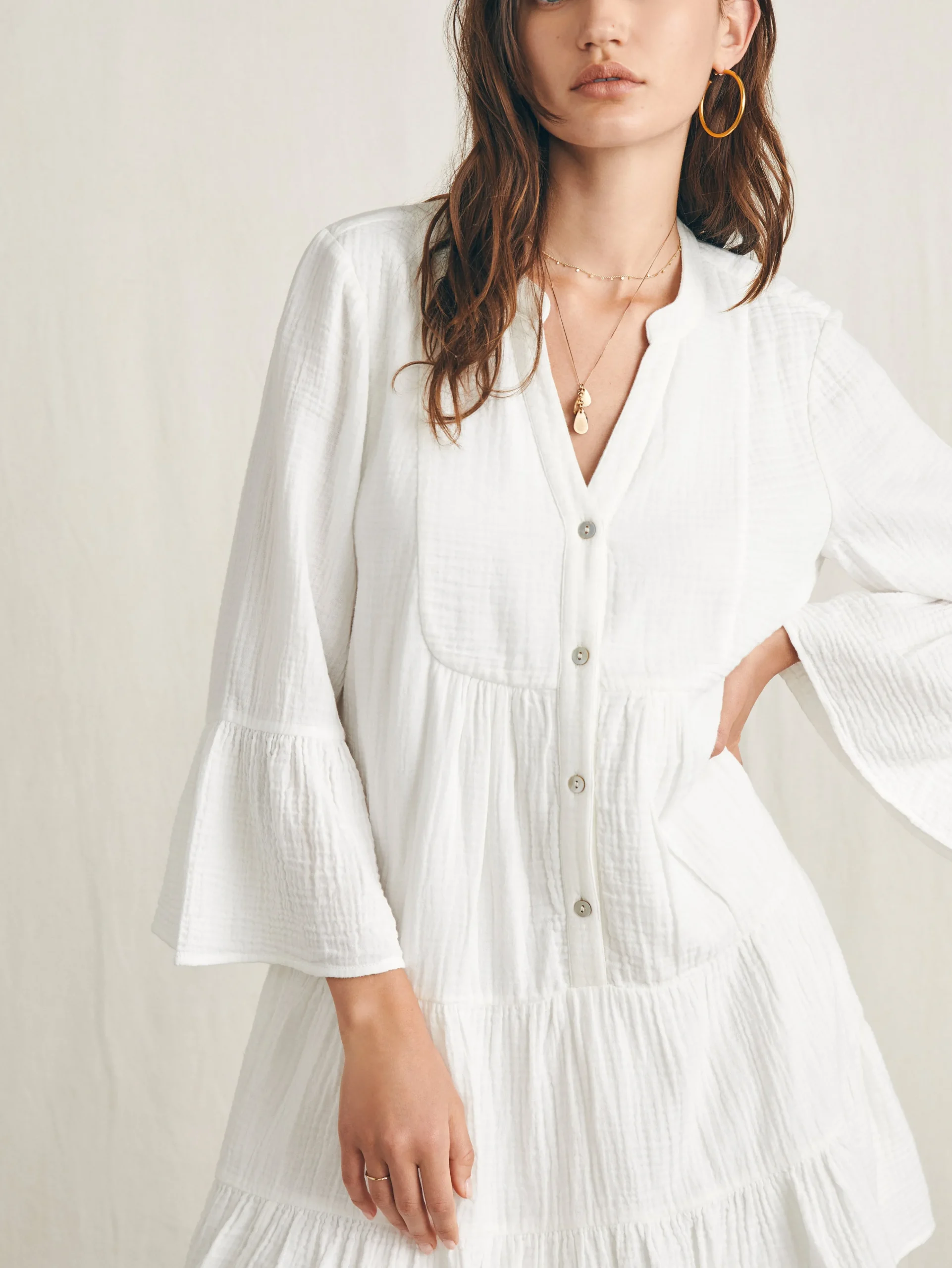 - Detail: Slightly elliptical high-low hemline, Tiered skirt with light shirring, Contoured collar band neckline with overlapping front button placket, Front bib.