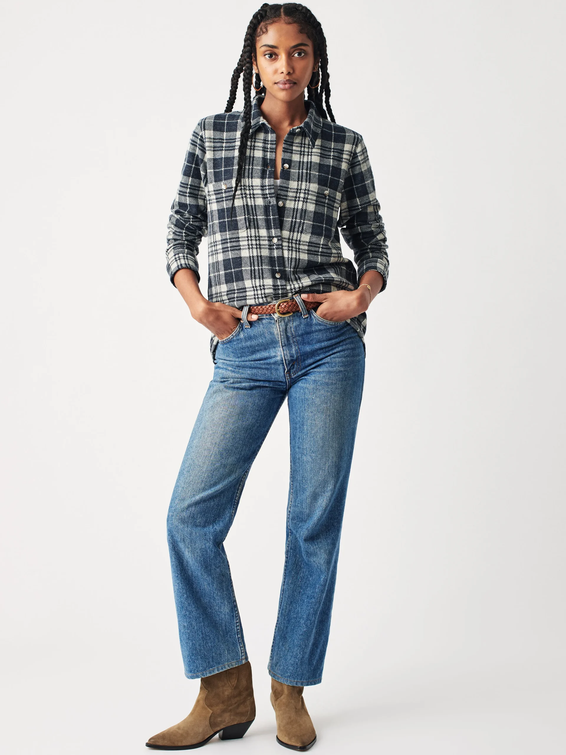 - Detail: Spread collar, button front. Long sleeves with button cuffs. Chest patch pockets, topstitch detailing. Shirttail hem.