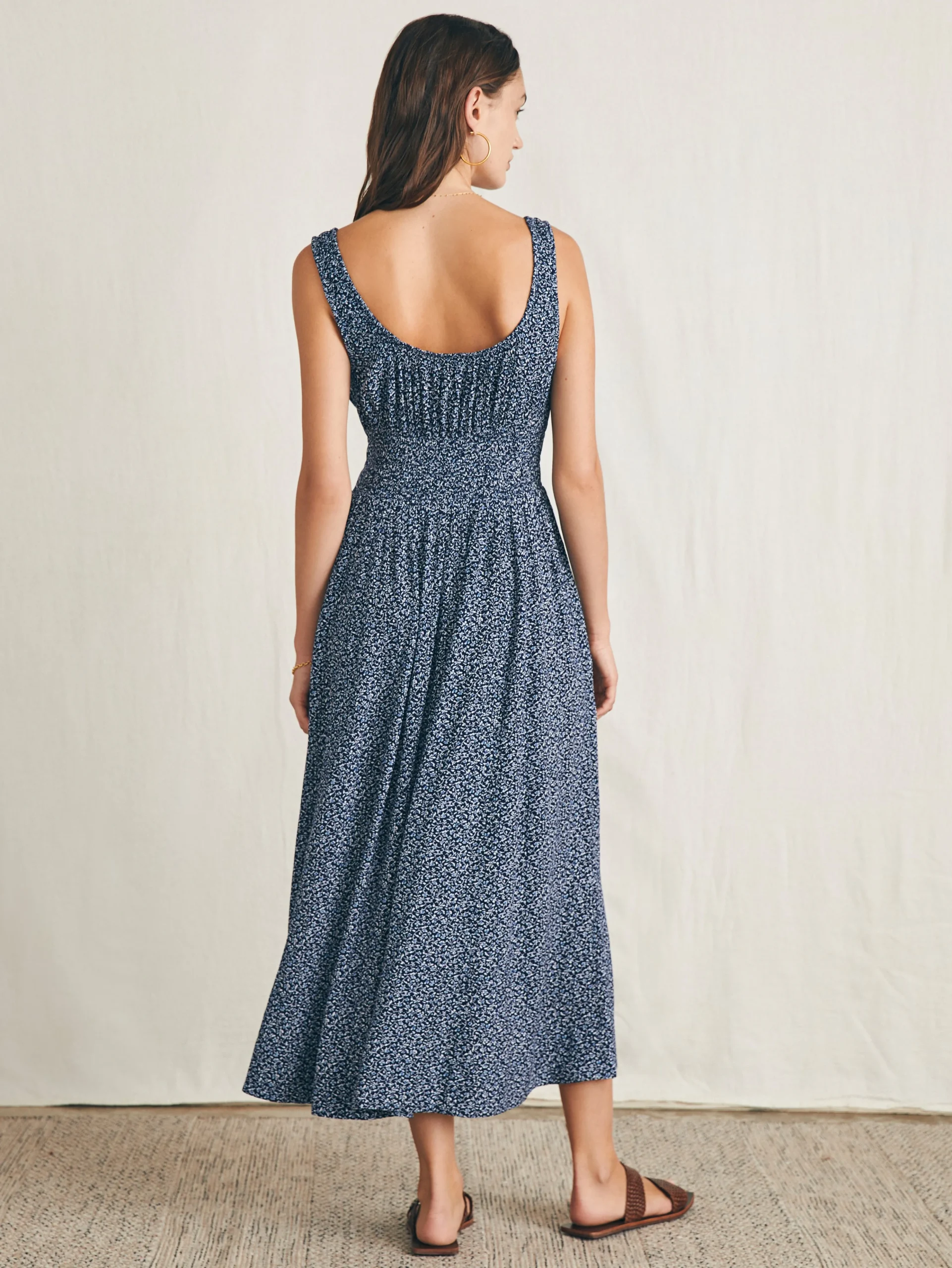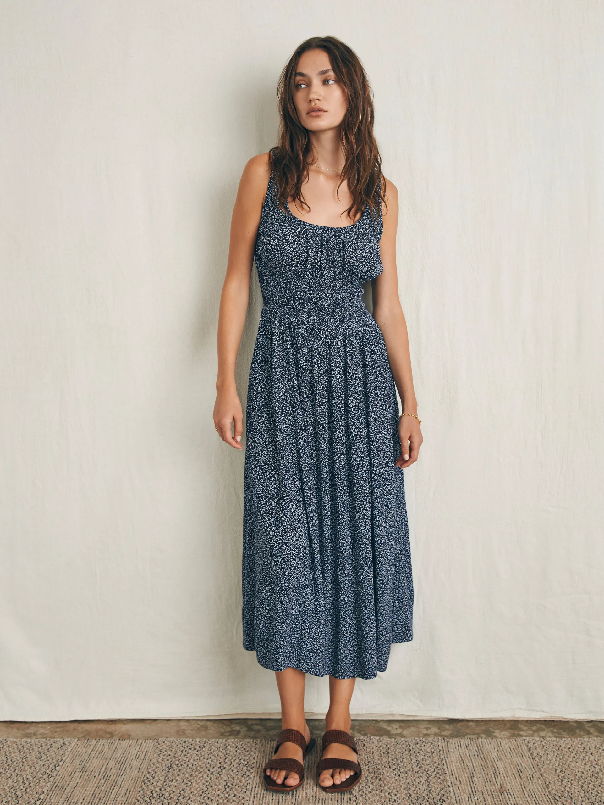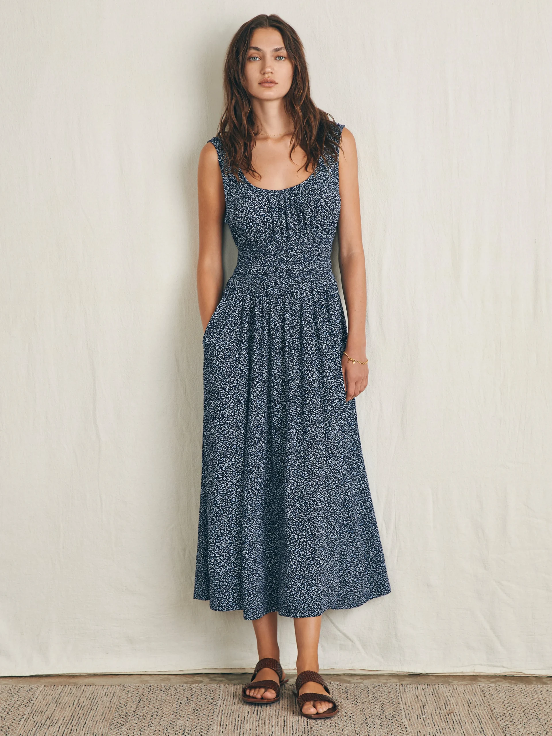 Introducing our newest midi-dress designed to go from day to night in a silky crinkle fabric that looks effortlessly luxe. The smocked elastic at the waist fits and flatters and falls to a full skirt (with pockets!) that feels relaxed and elegant all at once.