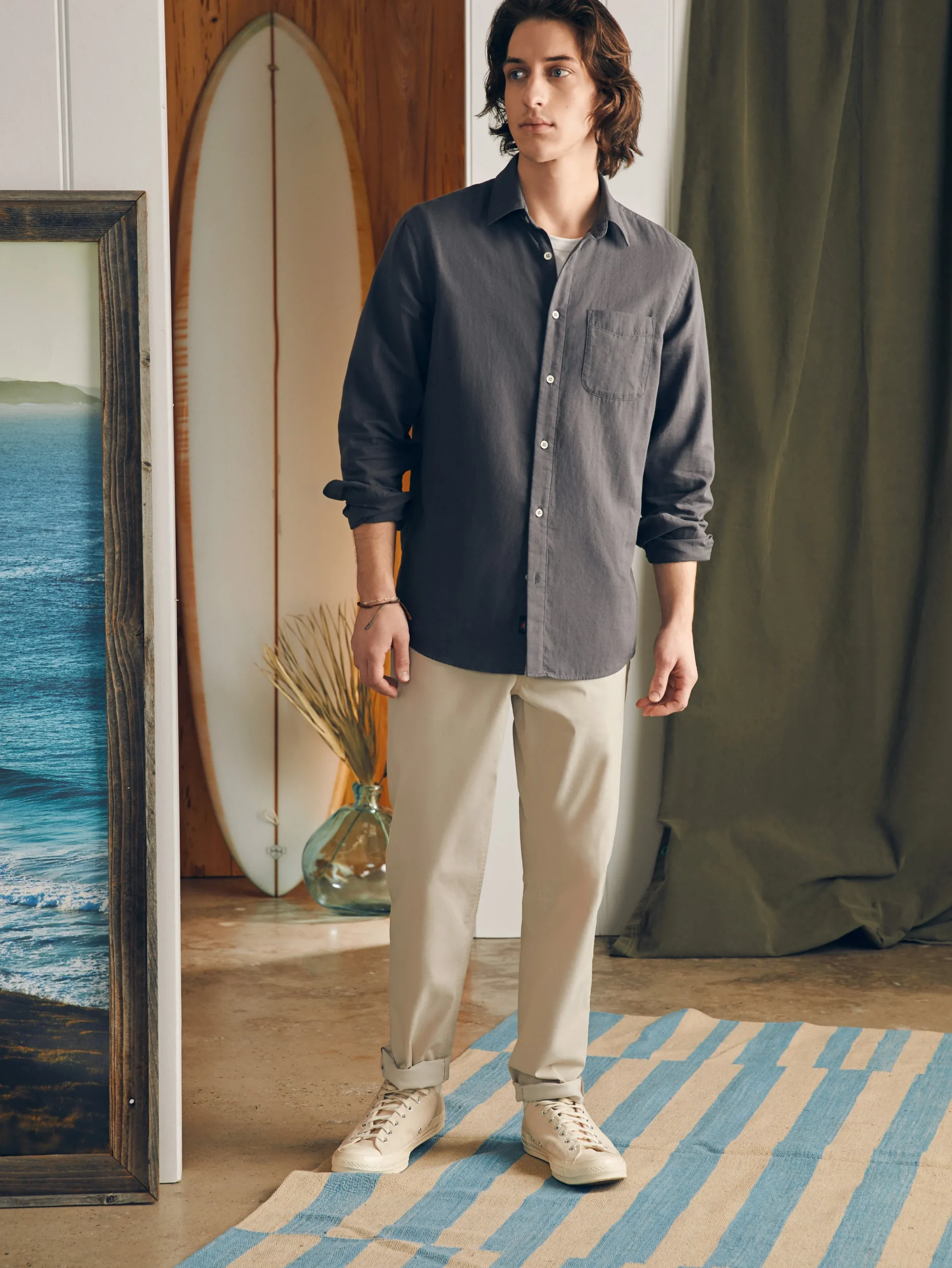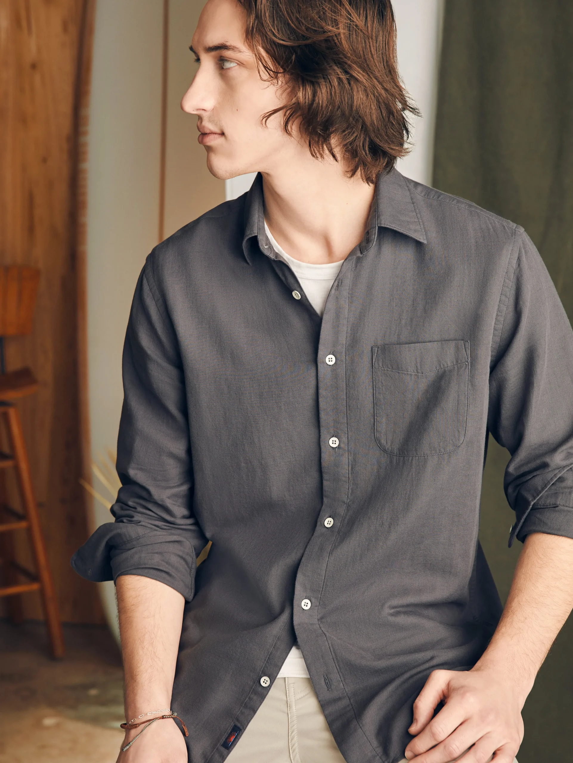 The key callout on this laid-back button-up is its incredibly soft double cloth fabric. With an airy, homespun nature, the weave has a subtle dotted texture for extra character. If you’re looking for a button-up to wear with shorts and flip-flops or even on a casual evening out, this is it.