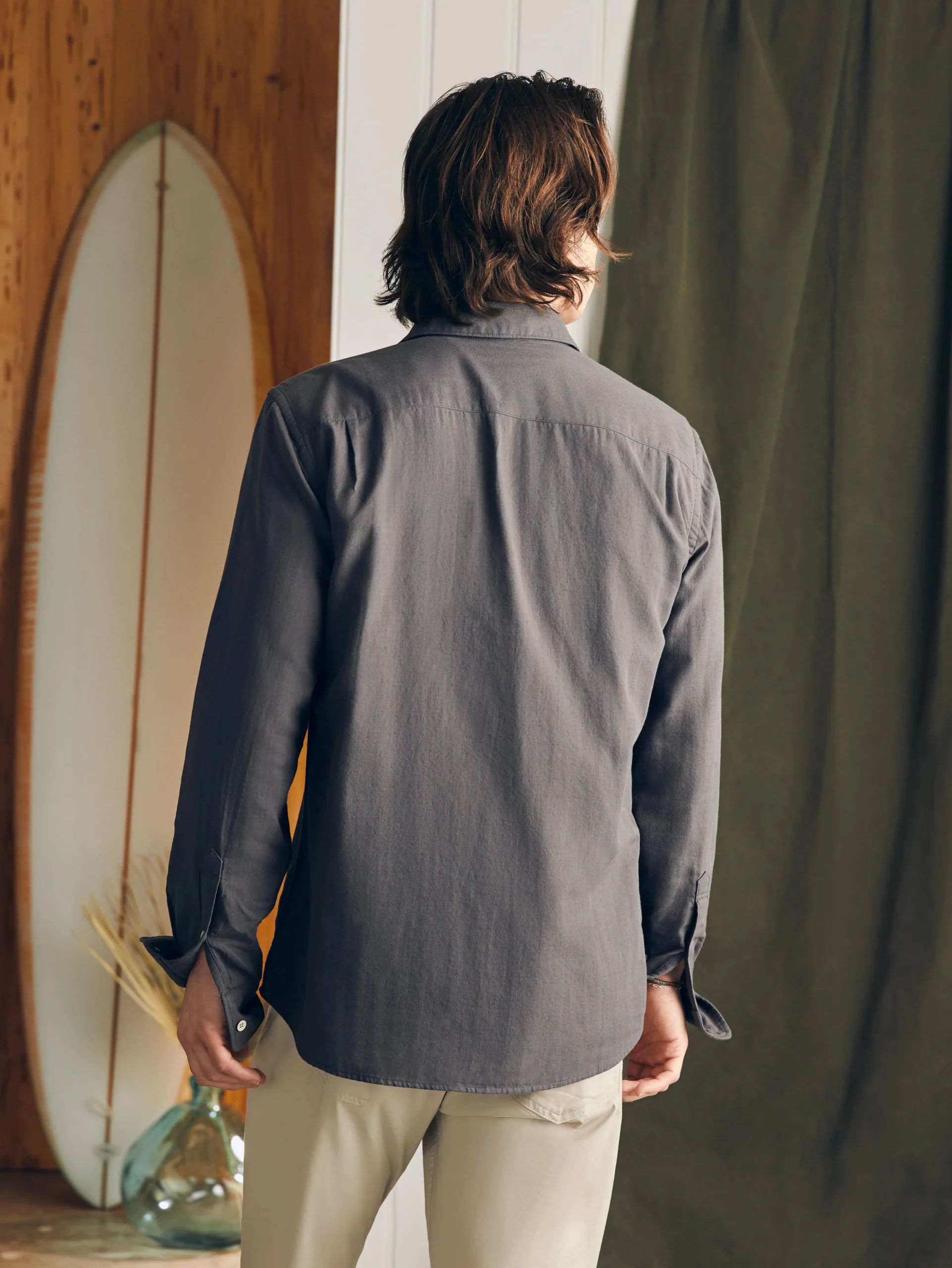 - Fit: An easy button-up silhouette. Relaxed through the chest with a slight taper at the waist. Relaxed, tapered sleeves.