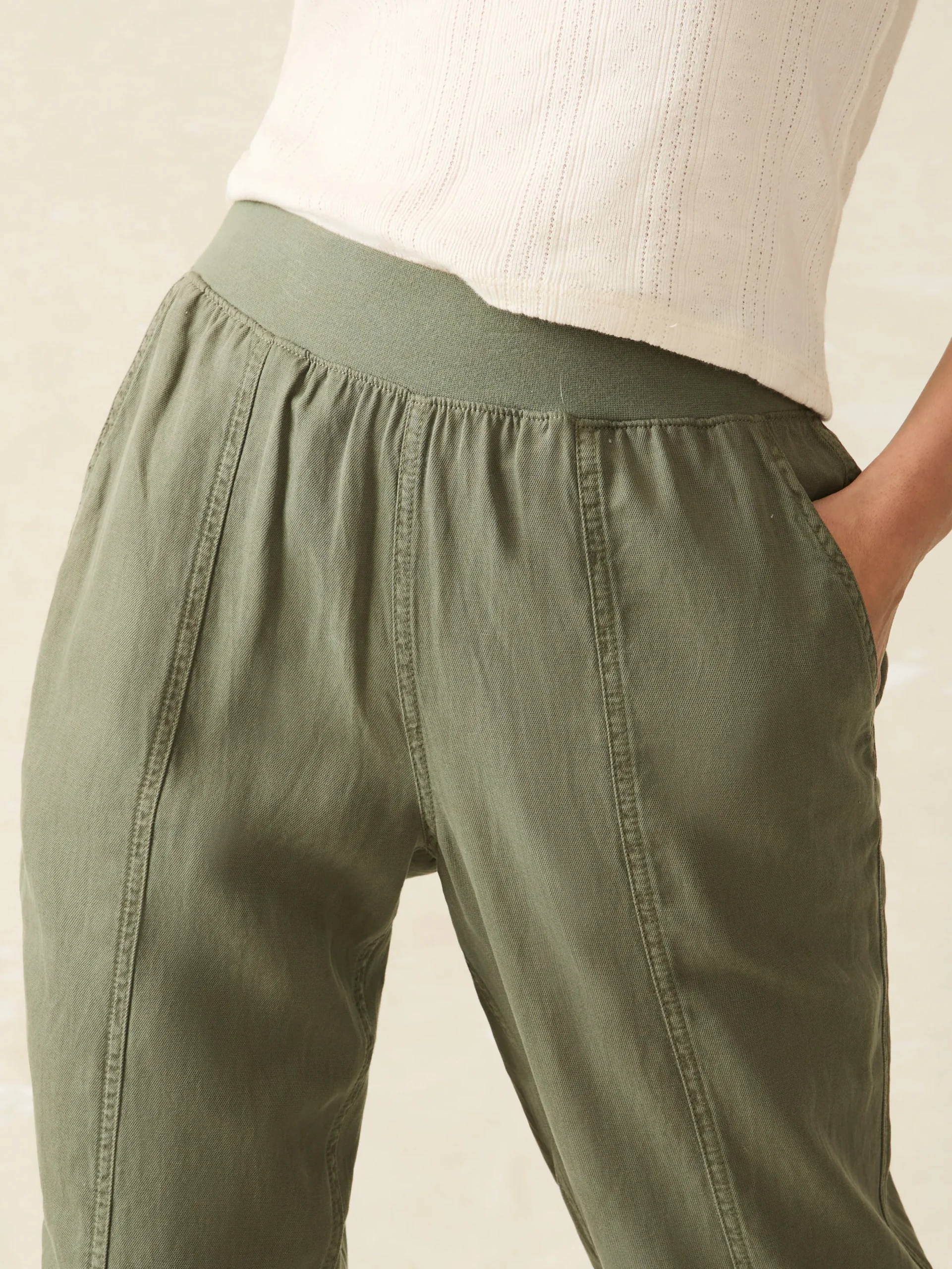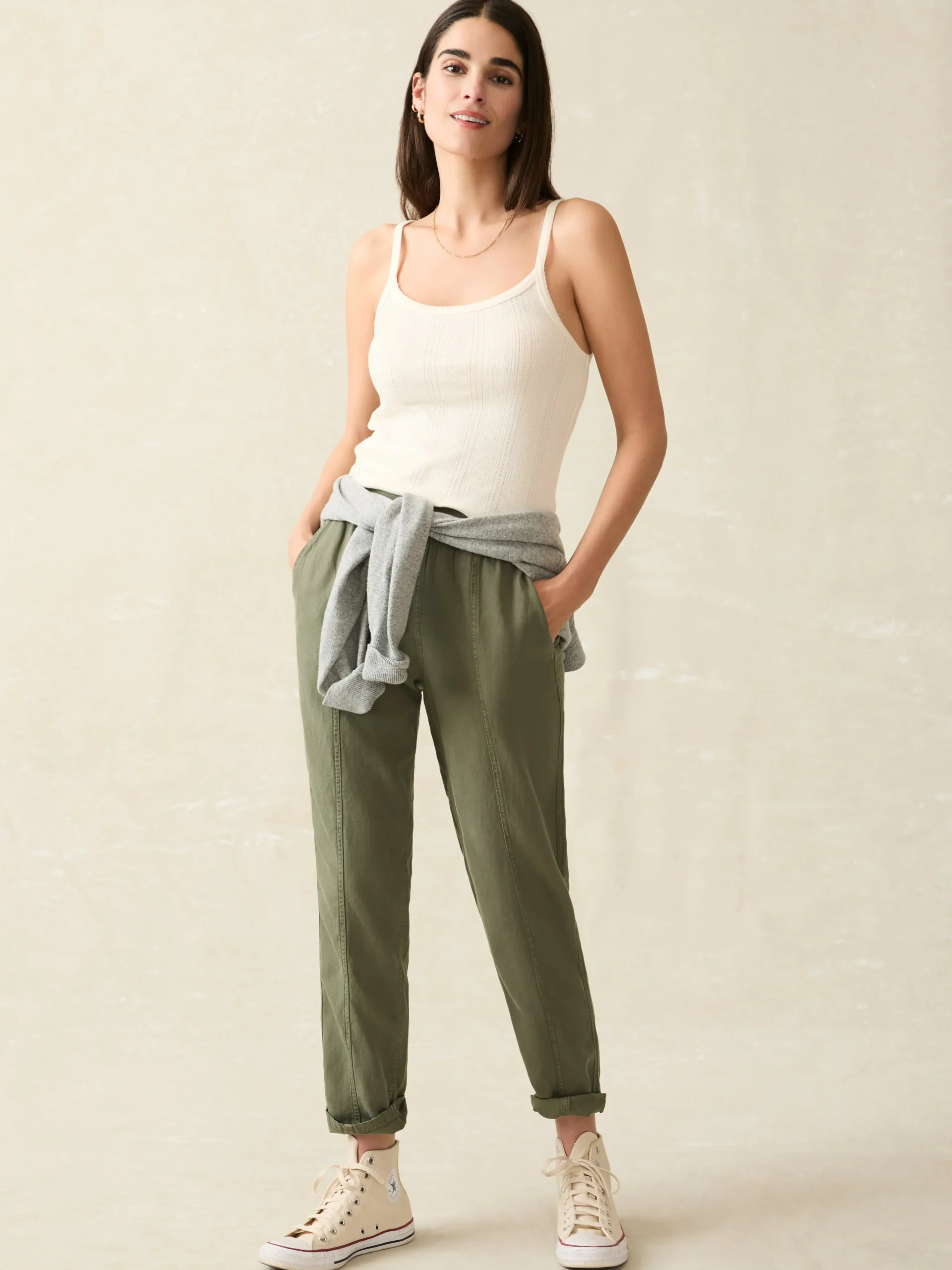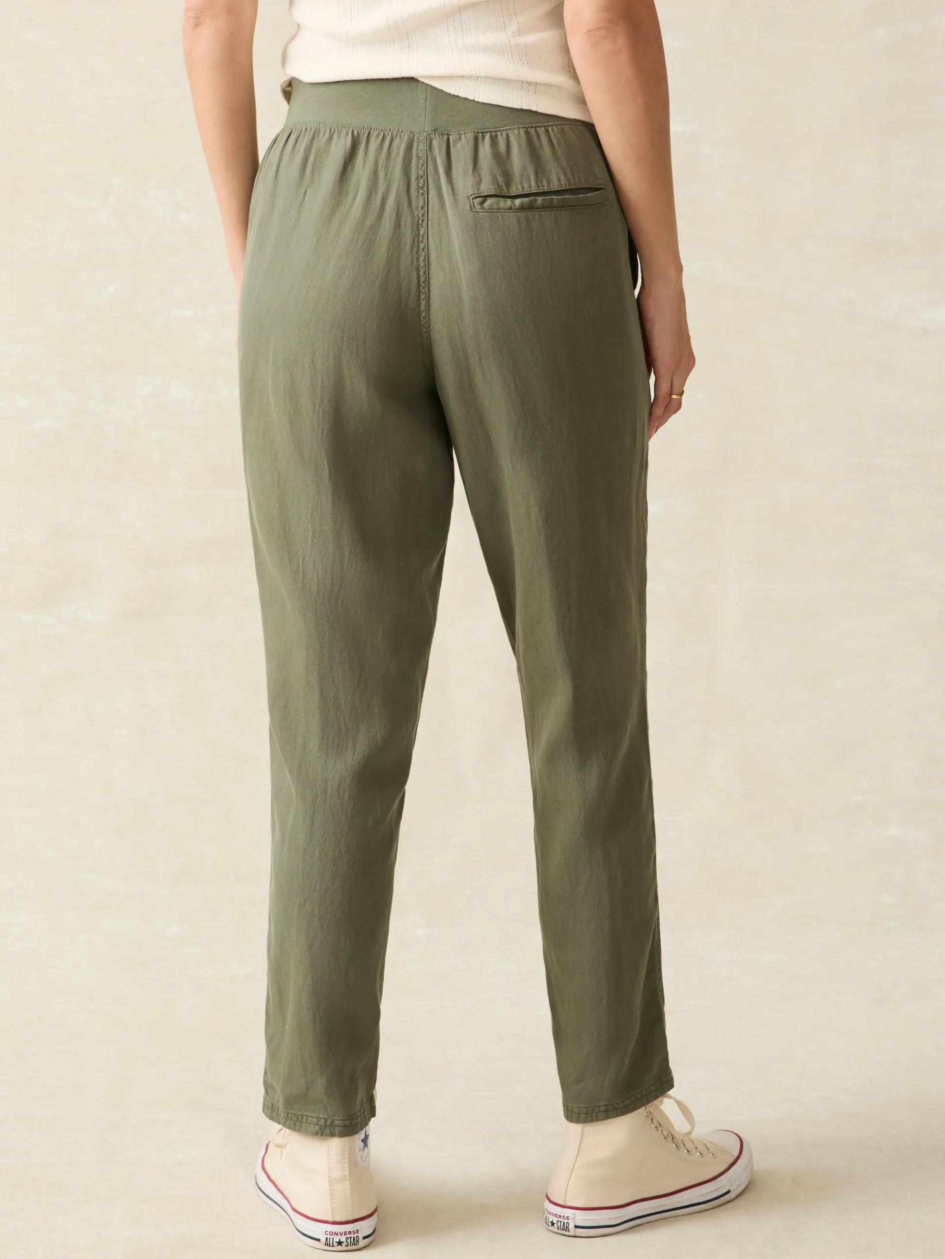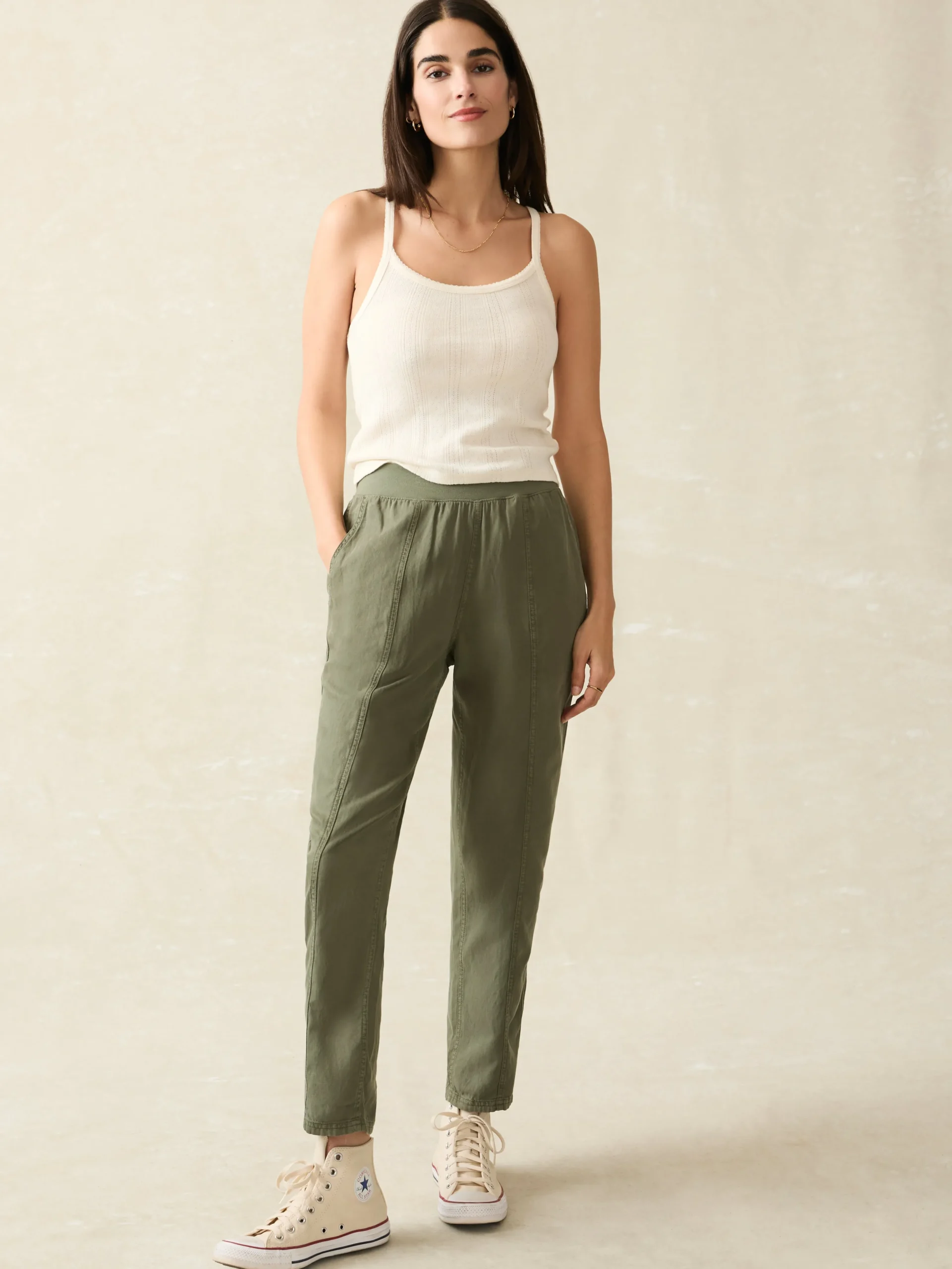 We took your tried-and-true Faherty favorite – the Arlie Pant, and finished it with front seams and a tapered leg for a more polished, streamlined look. Featuring the same soft, just-stretchy-enough blend of linen, cotton, and other fibers, it’s then specially dyed and washed for a vintage-inspired, lived-in vibe. The pull-on waistband gives you all day comfort but it’s elevated enough to wear to work or out to dinner.