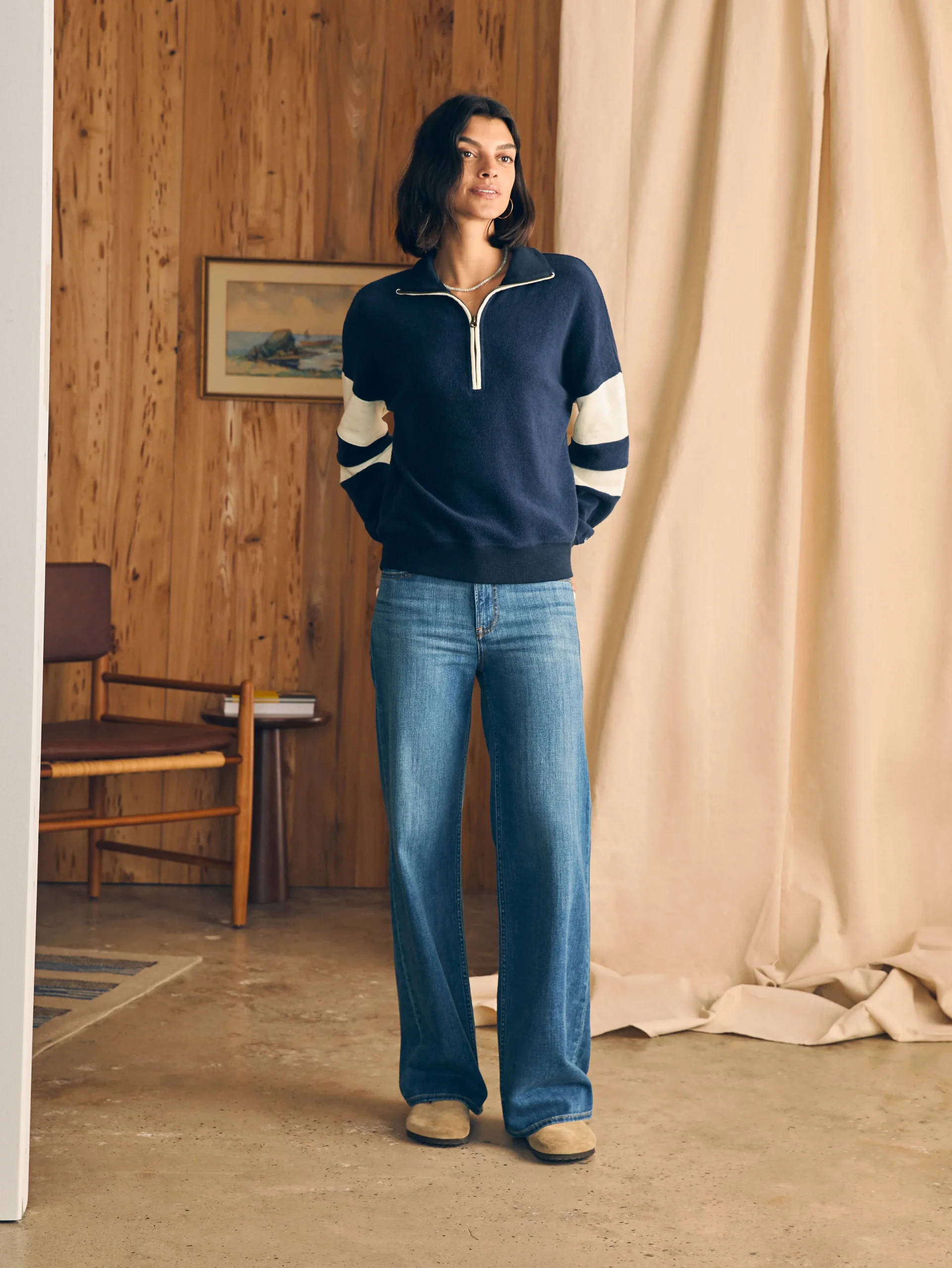 We took our favorite sweatshirt, flipped it inside out and never looked back. Made from an irresistibly soft and textured brushed terry, this relaxed quarter zip sports a washed vintage graphic inspired by the surf towns we grew up visiting with our family and friends. It’s our go-to layer post waves.