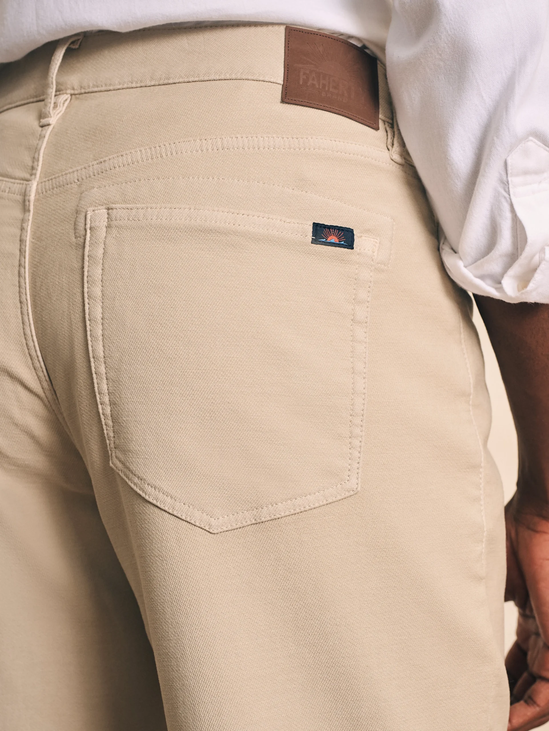 - Detail: Belt loops. Classic 5-pocket styling. Metal Rivets for pocket reinforcements. Metal fly zipper. Faherty logo back patch at wearer’s right.