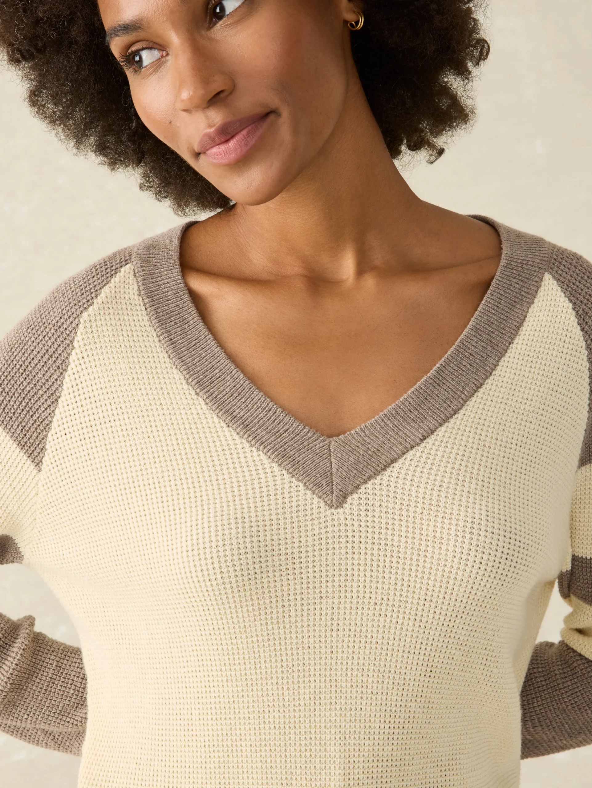 With a nod to nostalgic collegiate sportswear, this classic V-neck gets an elevated update in the softest organic cotton and cashmere yarn. The wonderfully textured waffle stitch lays with a relaxed, no-fuss fit that keeps you toasty and comfy. Play up the sporty stripes and playful colorblocking with jeans or a corduroy skirt for a quintessential fall look.