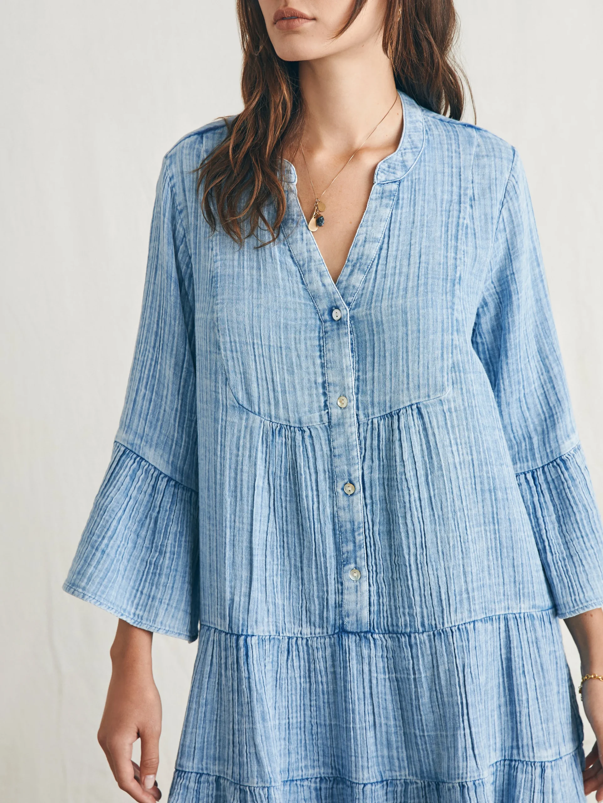 - Detail: Tiered skirt with light shirring. Contoured collar band neckline with overlapping front button placket. Front bib with slight shirring. Bell sleeve with slight shirring.
