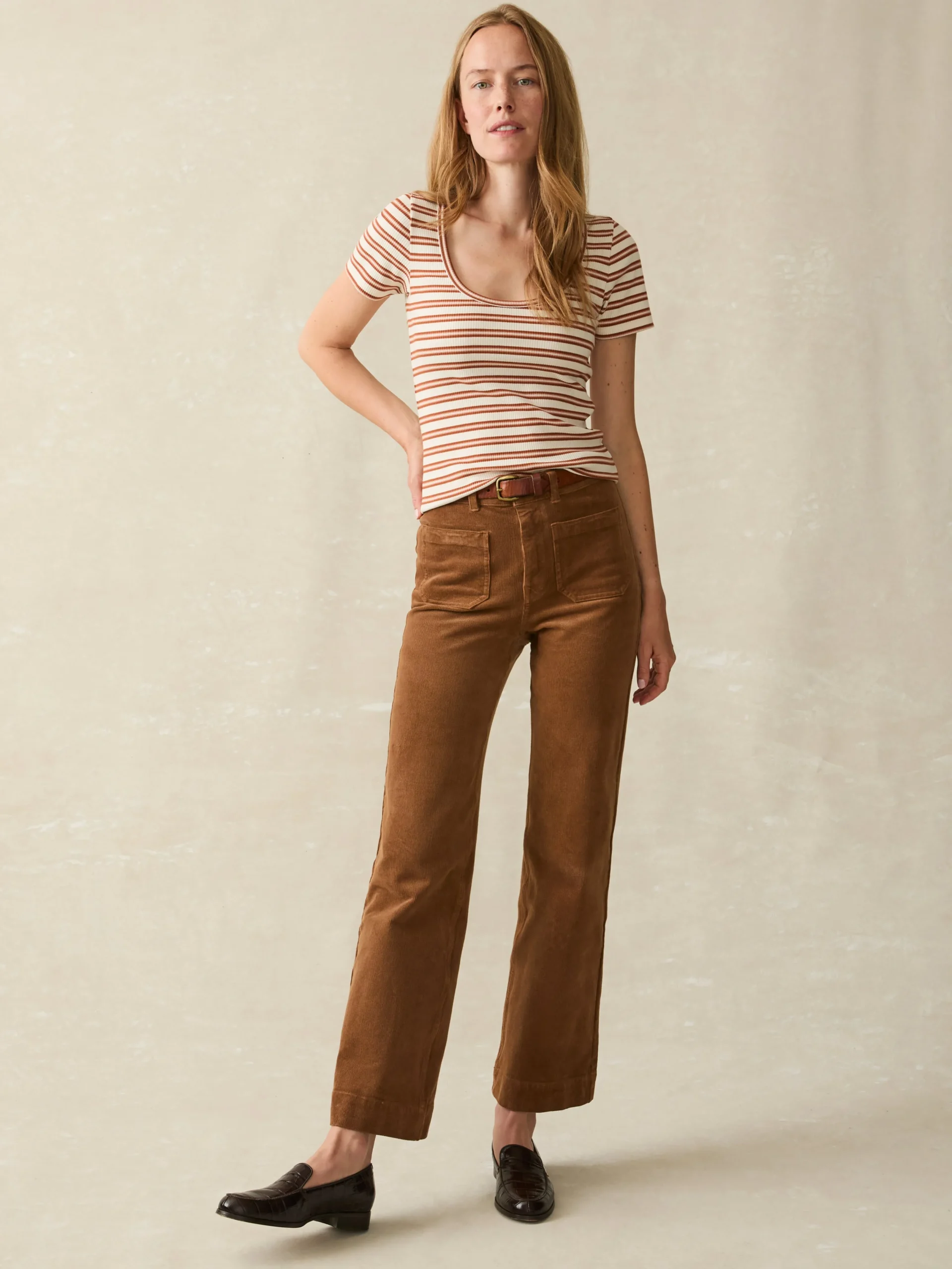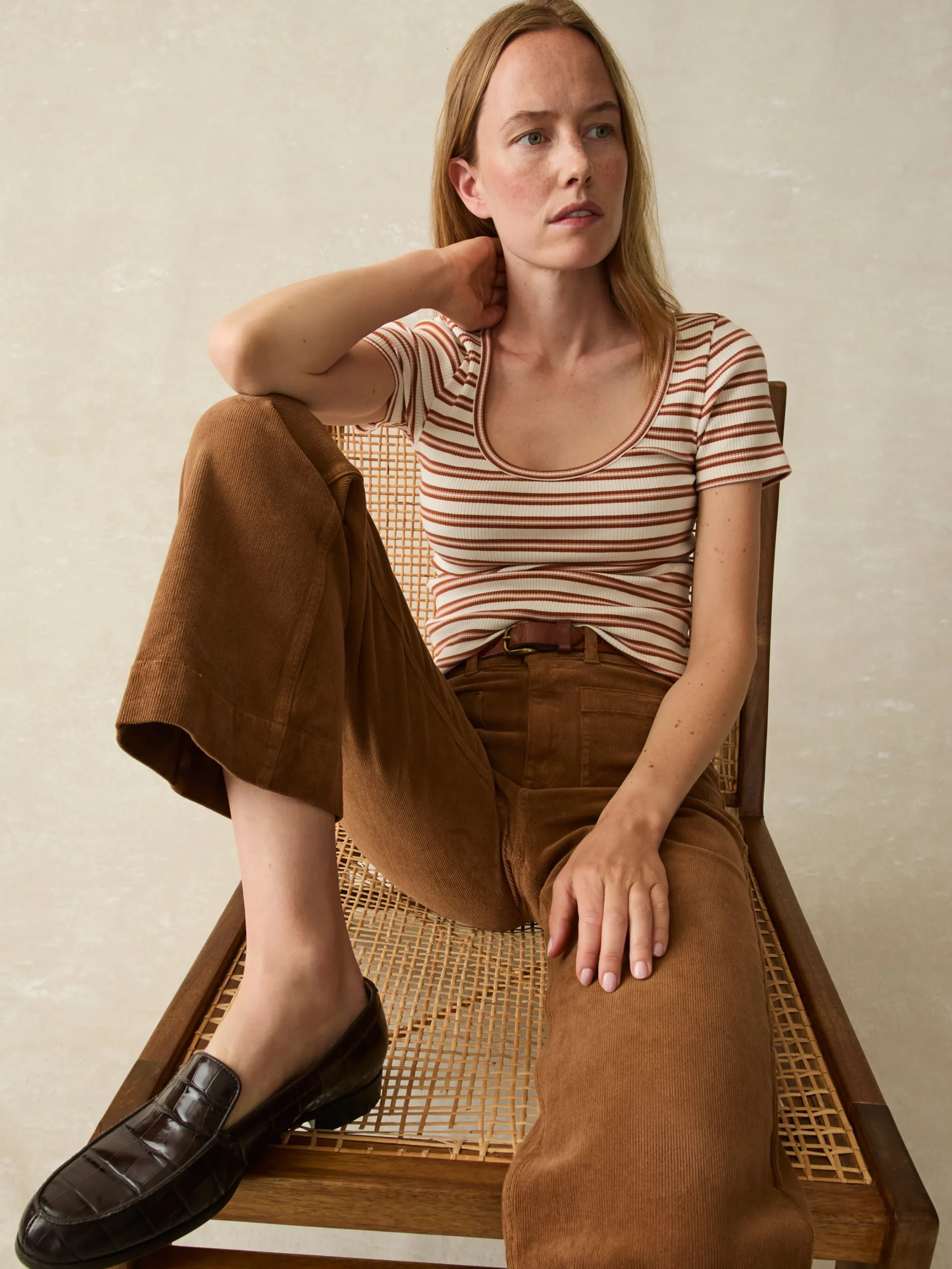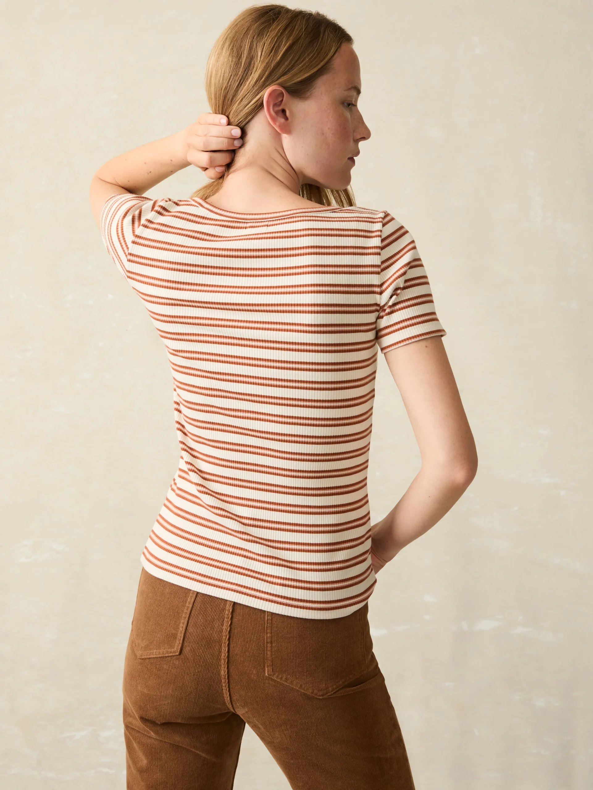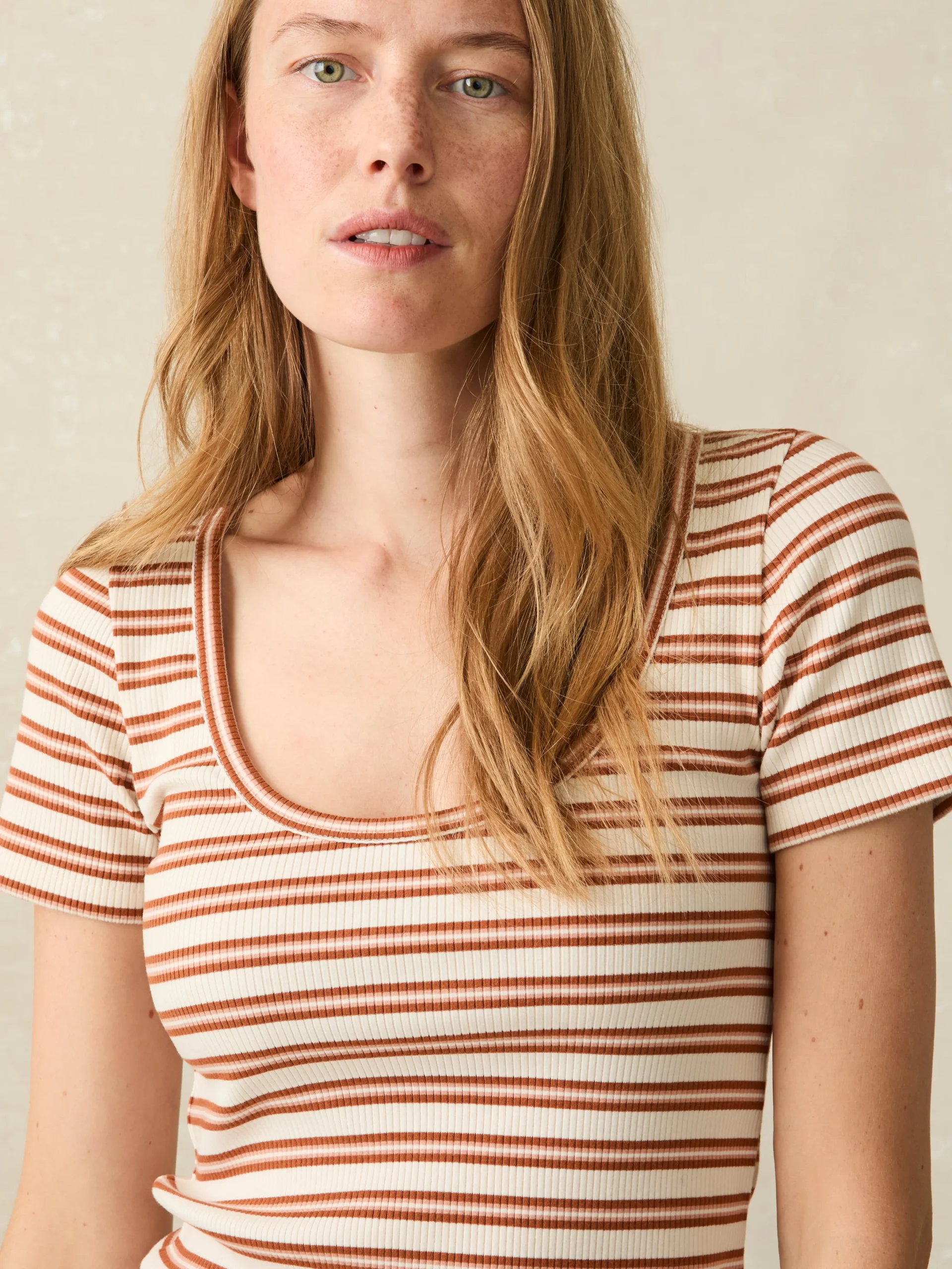 Crafted from our very own premium stretch pima cotton, this tee offers luxurious softness with an effortless fit. The ribbed knit adds subtle texture, transforming a classic wardrobe staple into a stylish piece that works for laid-back outings to more polished occasions all year-round. This is our go-to top for balancing out flowy, maxi skirts and wide-legged pants.