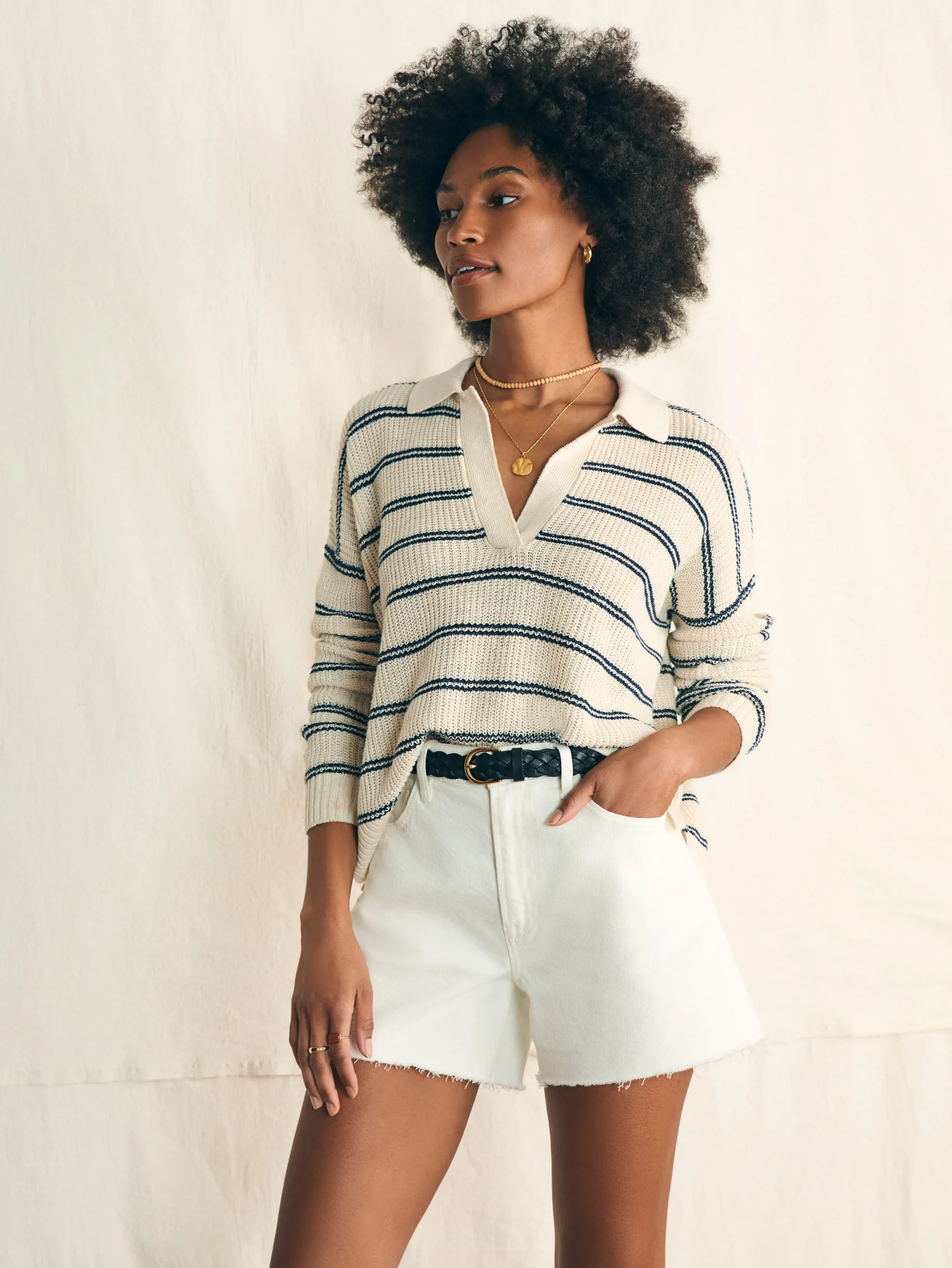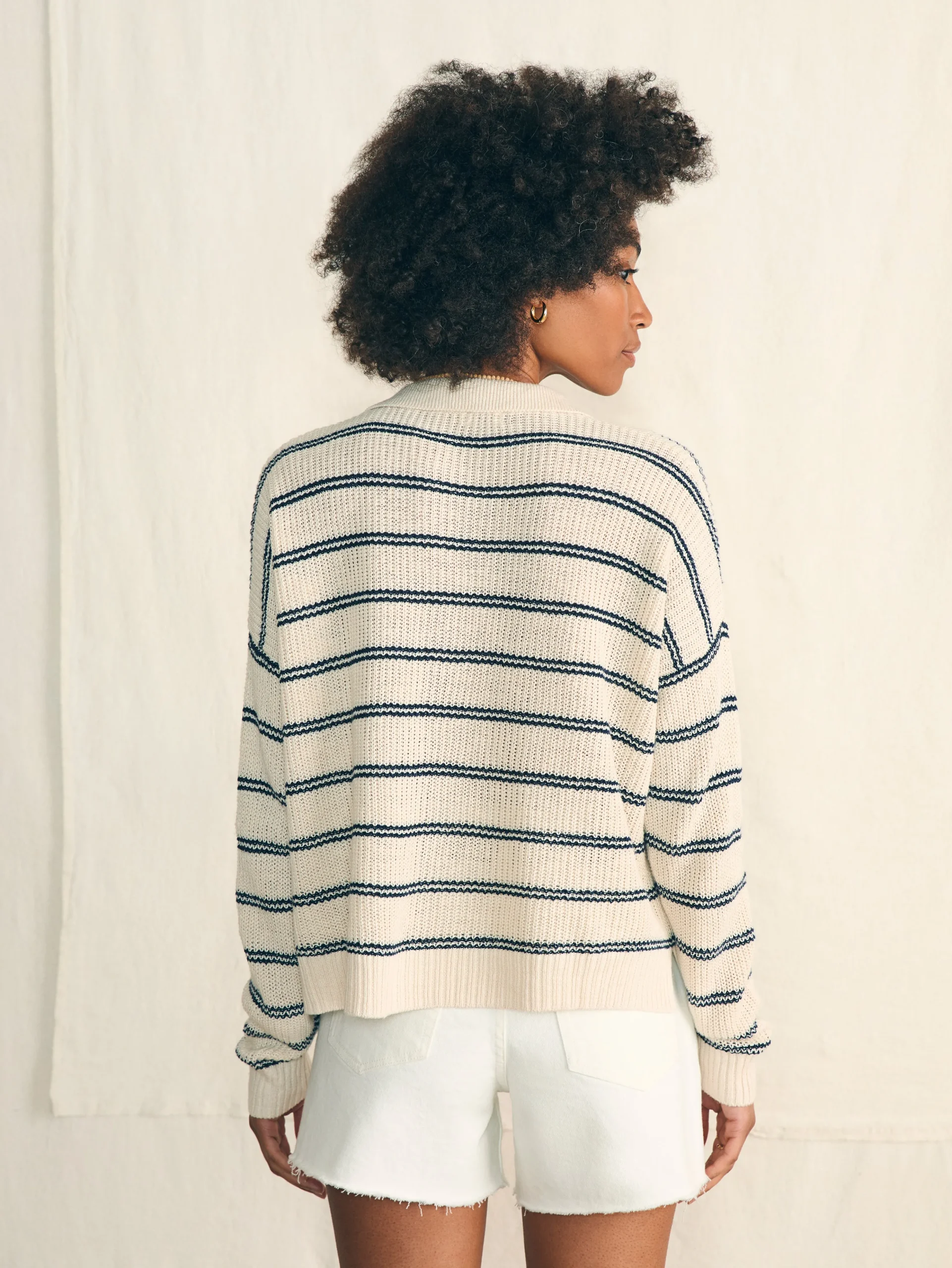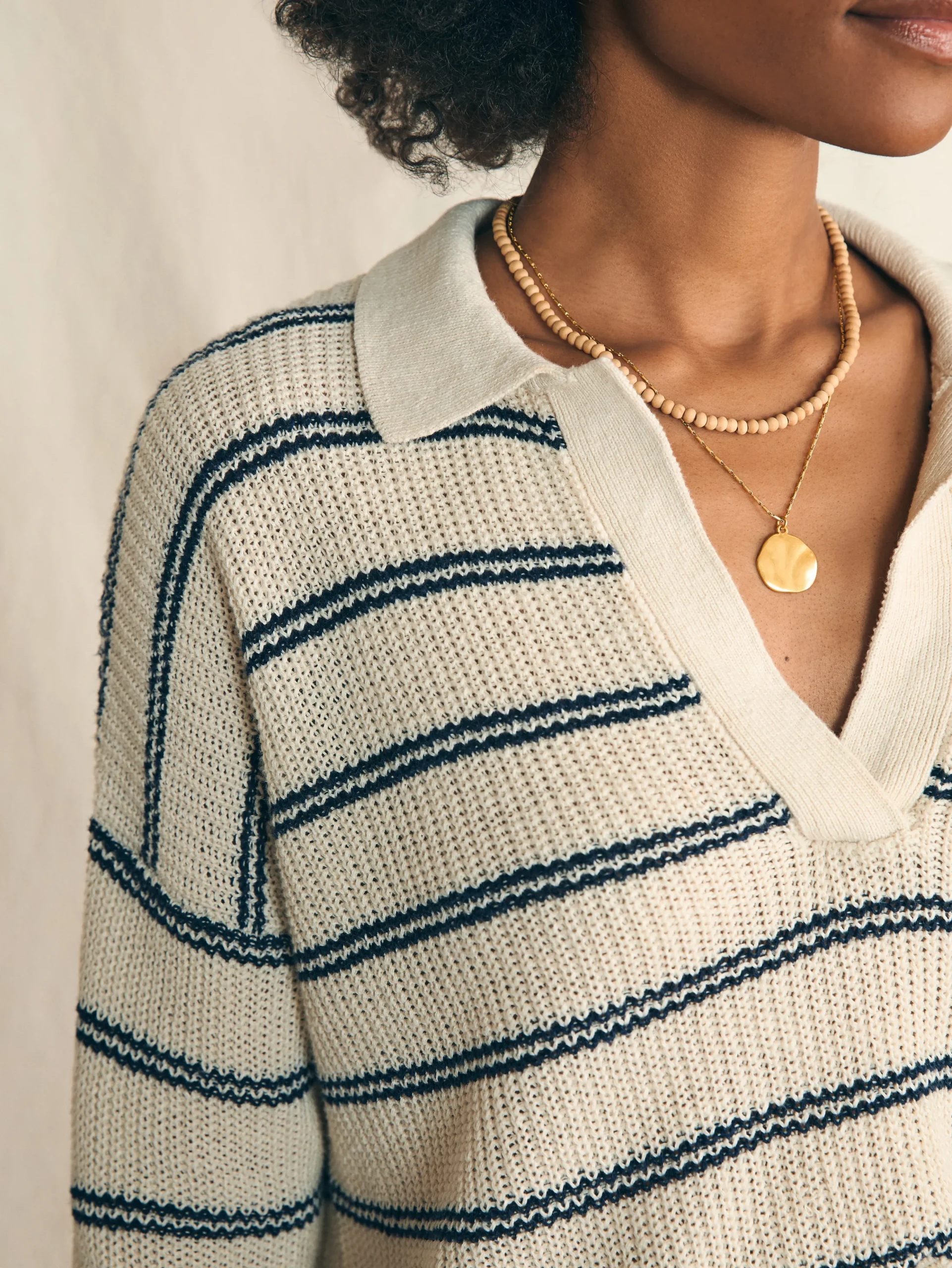 Warm enough for cool spring evenings but still light enough for sunny days, this striped polo is knit in an airy linen cotton blend that makes it the ideal layering piece. The textural, open stitch drapes beautifully with a slouchy, relaxed fit, making it our favorite no-fuss warm weather sweater.