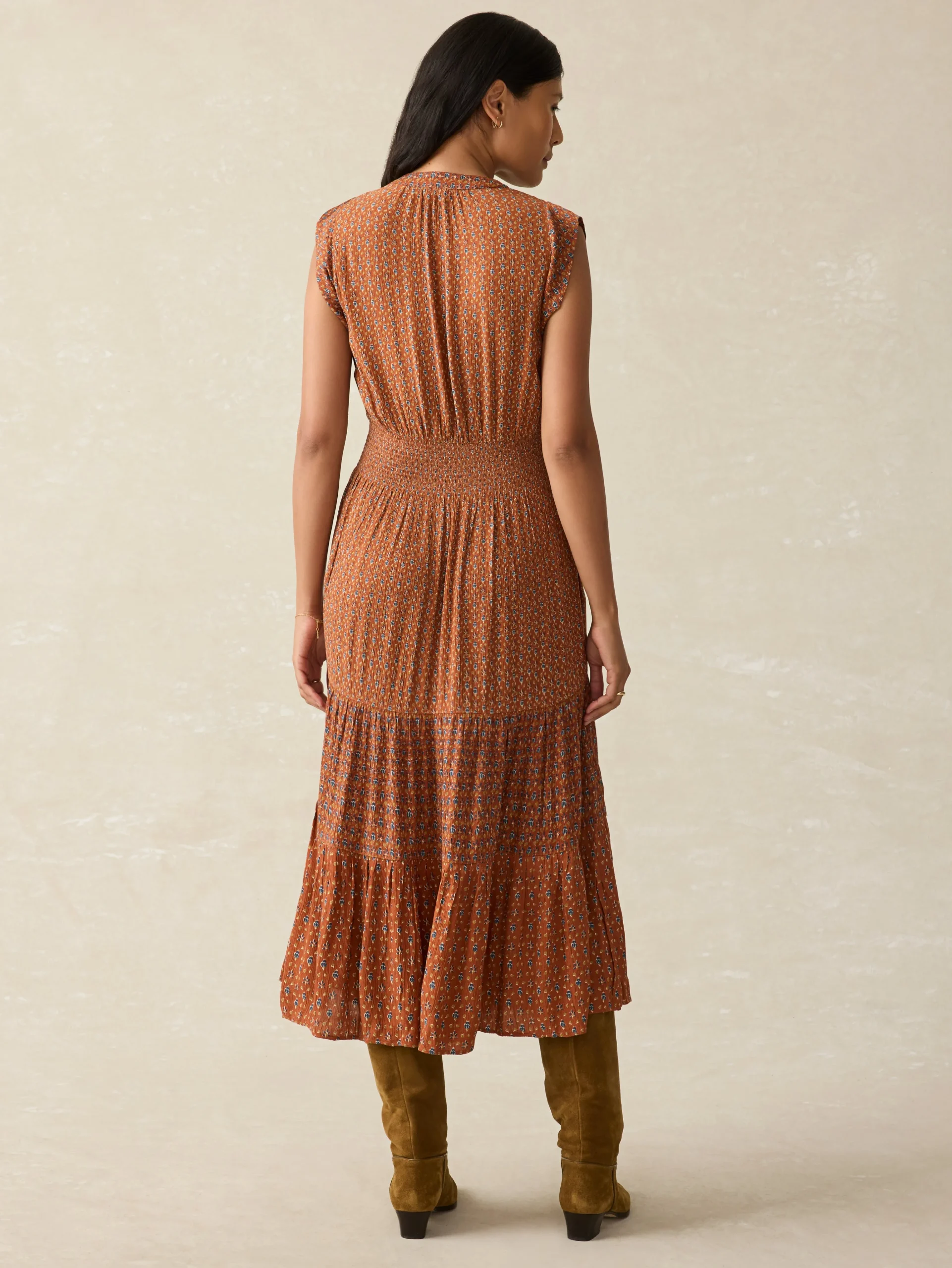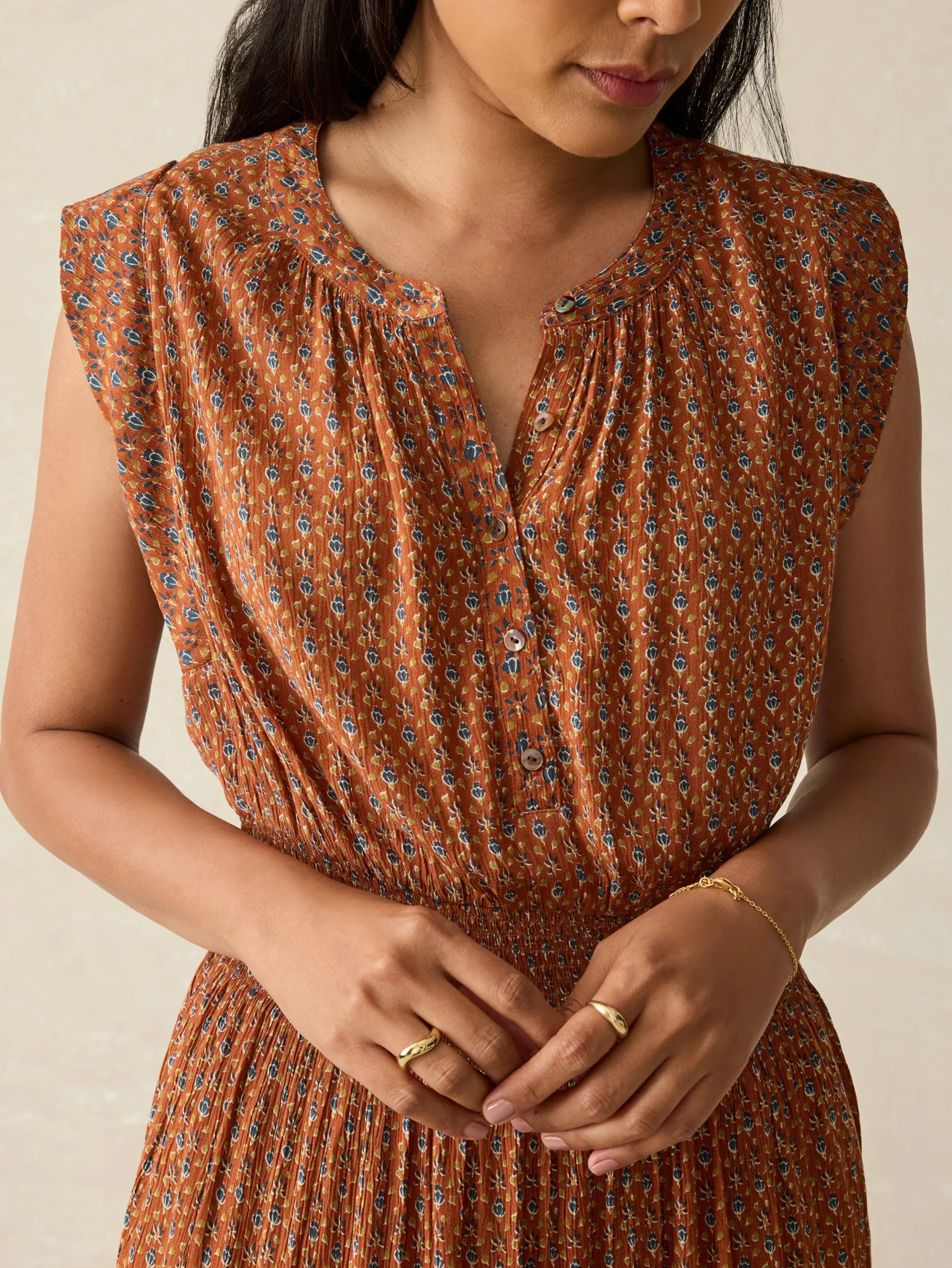 Blending beautiful autumnal hues with a charming vintage-inpsired print, this perfectly flowy dress is a breeze to wear all day. A buttoned bodice and a smocked waistband give you a versatile and forgiving fit – whether you wear it on its own during the warmer months or layered with a turtleneck or cardigan as falls sets in.