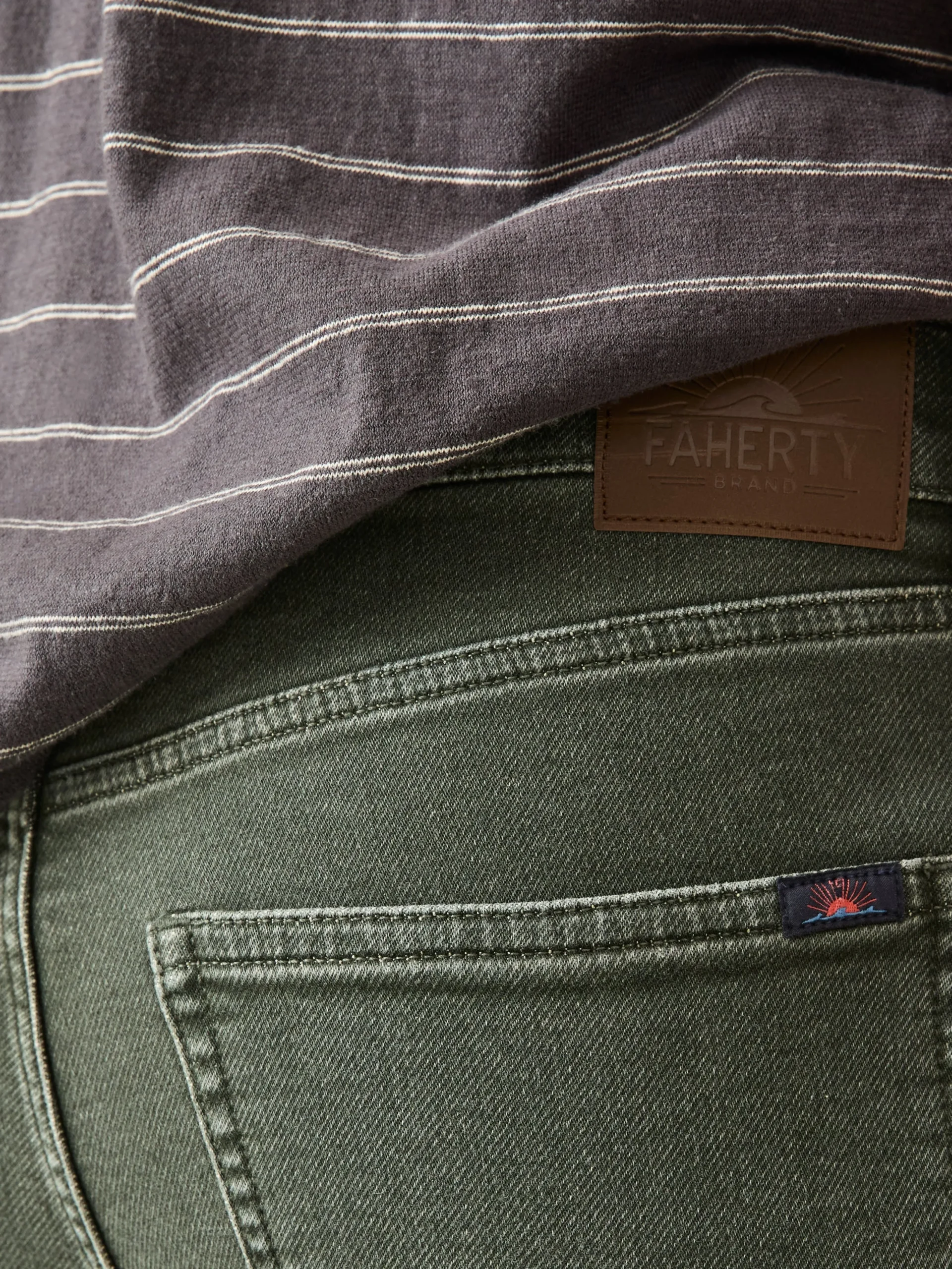- Detail: Belt loops. Classic 5-pocket styling. Metal Rivets for pocket reinforcements. Metal fly zipper. Faherty logo back patch at wearer’s right.