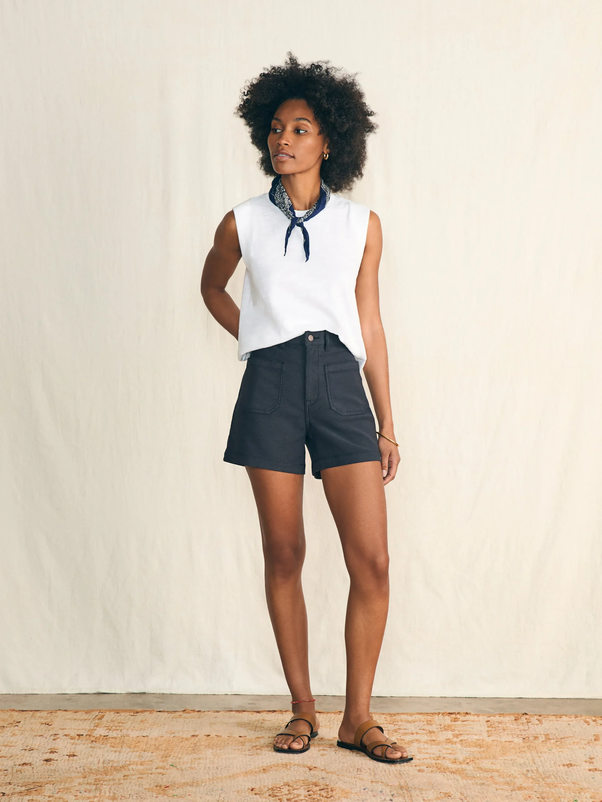 - Detail: garment dyed stretch terry shorts with patched front and back pockets.