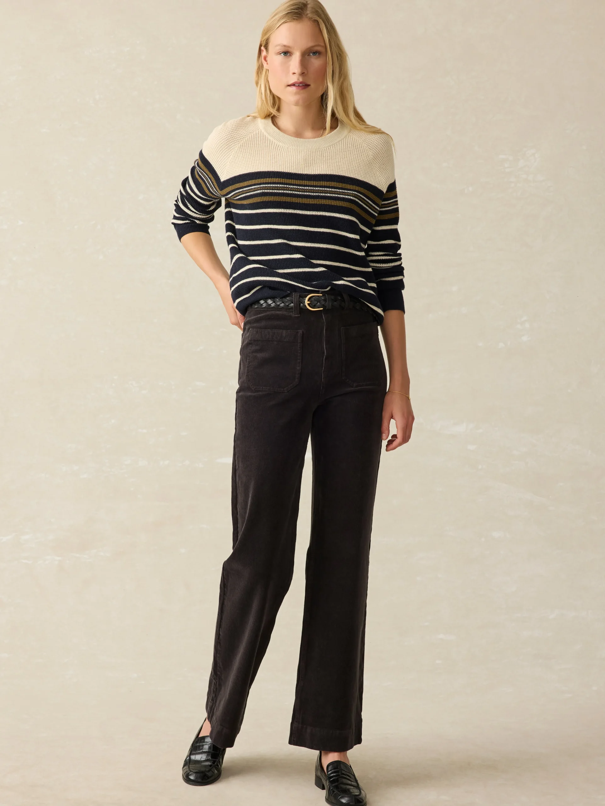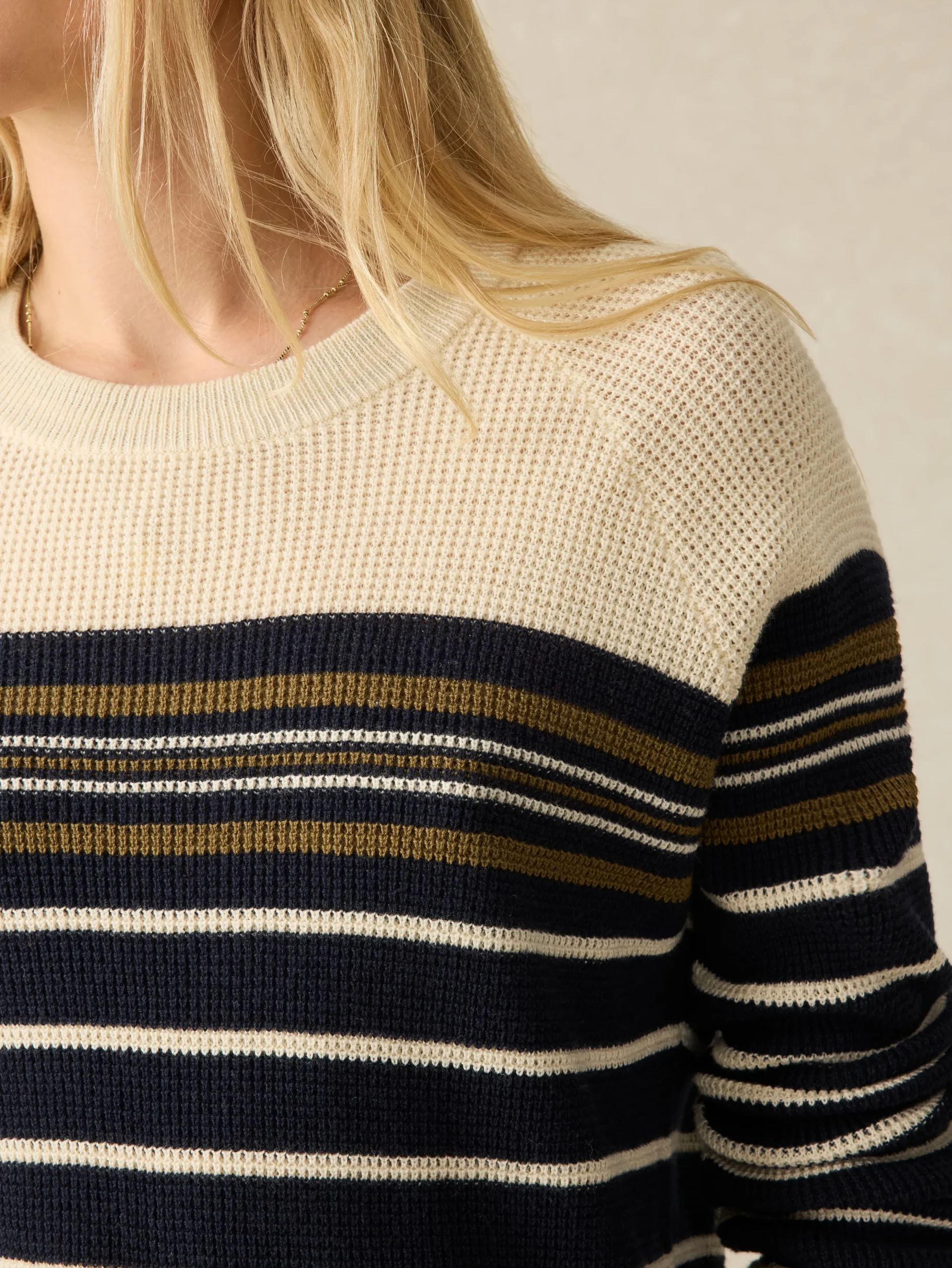 With a nod to nostalgic collegiate sportswear, this classic crewneck gets an elevated update in the softest organic cotton and cashmere yarn. The wonderfully textured waffle stitch lays with a relaxed, no-fuss fit that keeps you toasty and comfy. Play up the sporty stripes and playful colorblocking with jeans or a corduroy skirt for a quintessential fall look.