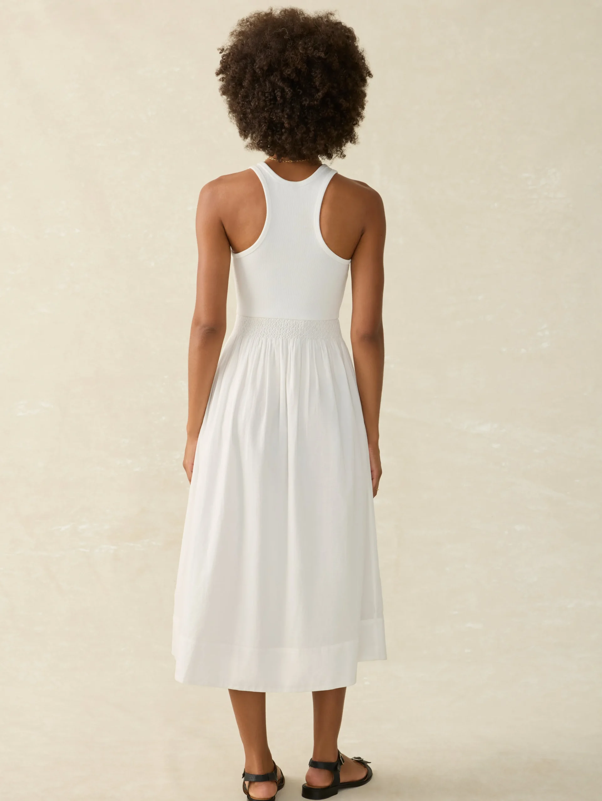 - Detail: Sleeveless, knit/woven fabric mix. Smocking detail at waist, skirt is fully lined.