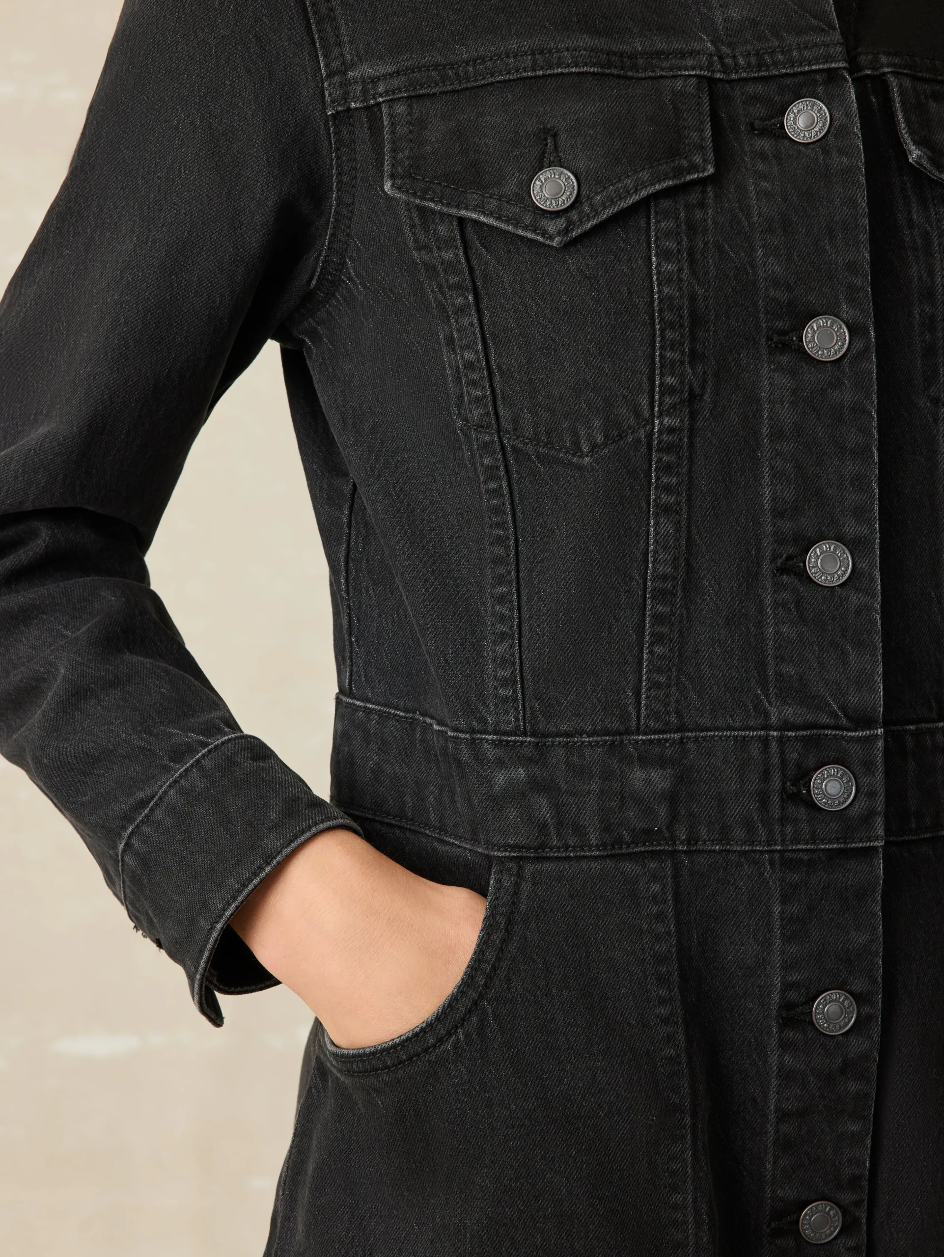 - Detail: Denim dress with trucker jacket detail. metal shank closure. Vintage Black wash. Comfort stretch.