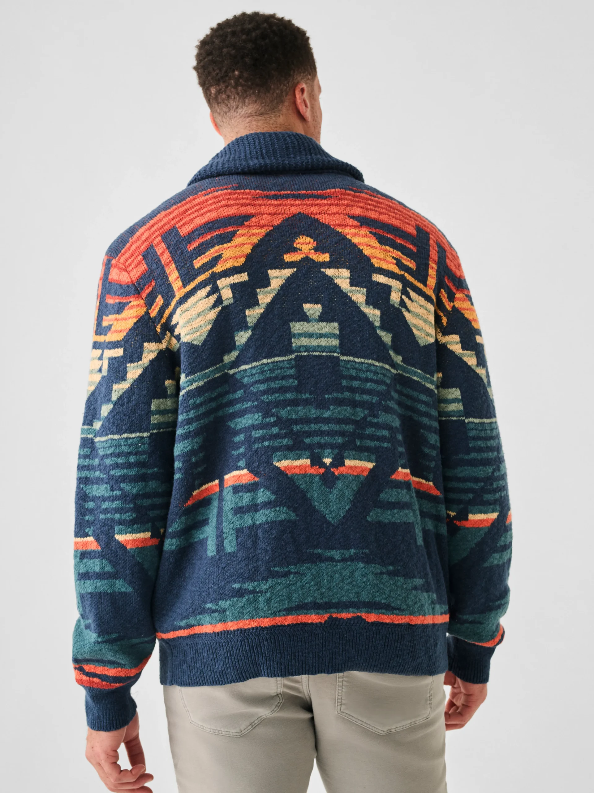 An iconic statement piece for your winter wardrobe, this cardigan was created in collaboration with Native Artist Lehi ThunderVoice Eagle. Crafted of incredibly softorganiccotton, the inspired sunset pattern is woven directly into the sweater. The cardigan’s timeless shawl collar and the surprising heft and weight perfectly work together to ward off winter’s chills.