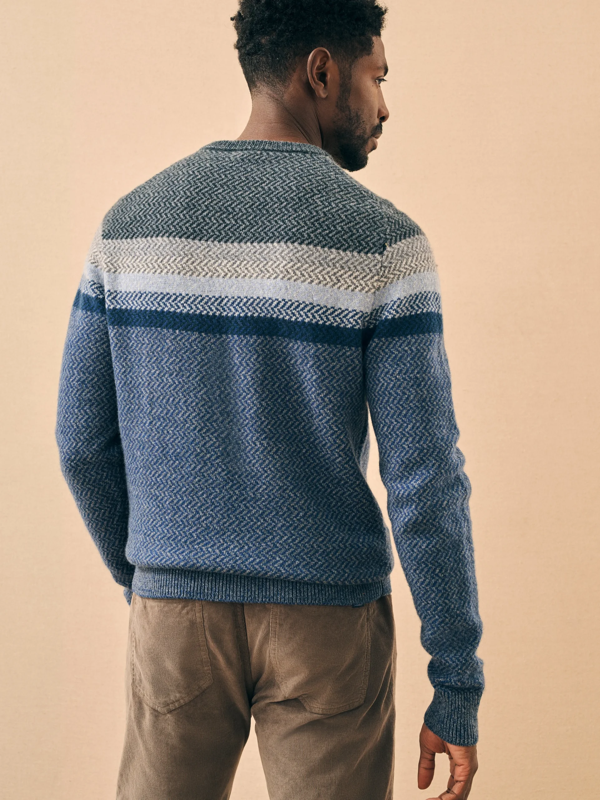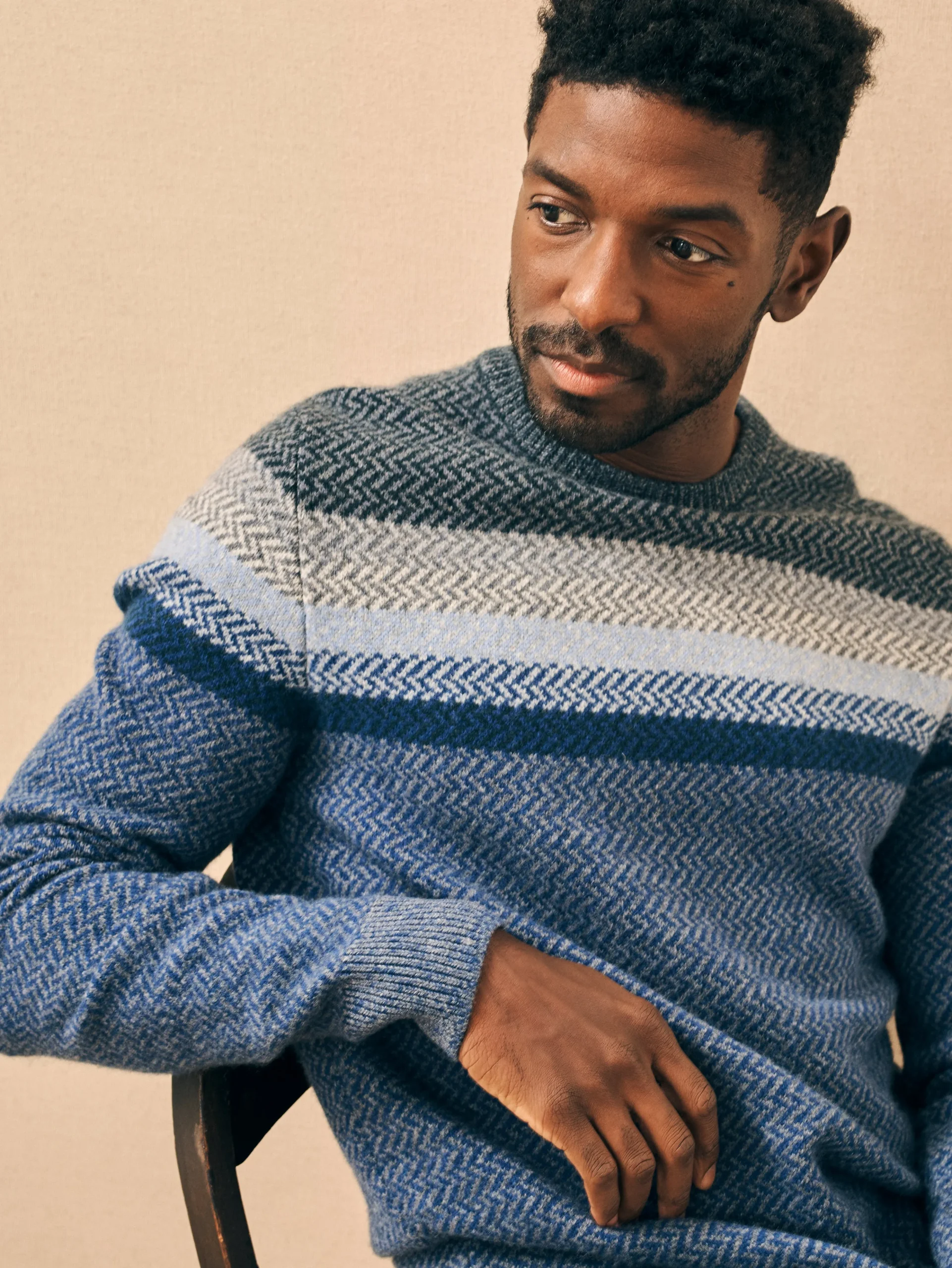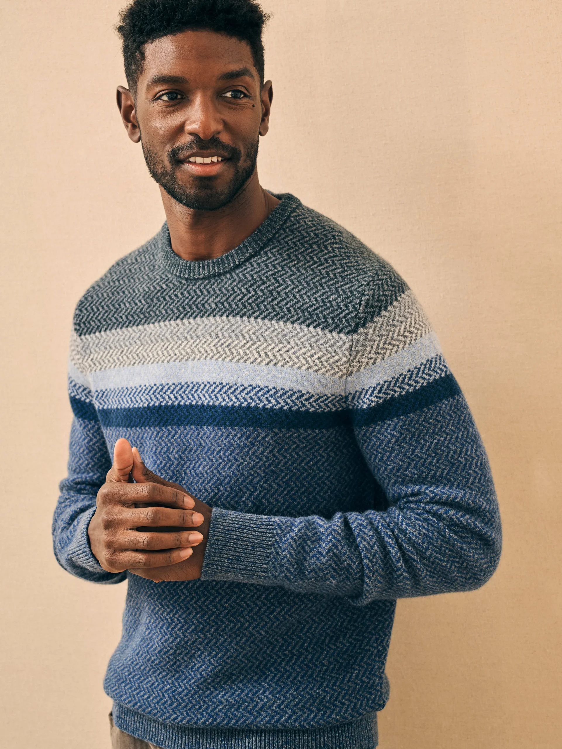 Our crewneck sweater features a herringbone knit ombre pattern (inspired by a vintage find from Mike Faherty) that elevates it far above the ordinary sweater. In 100% extrafine Merino wool, its soft and relaxed fit is perfect for layering, without the extra bulk. Wear it with cords for an everyday look or dress it up over a button down with chinos to get you through any holiday event.