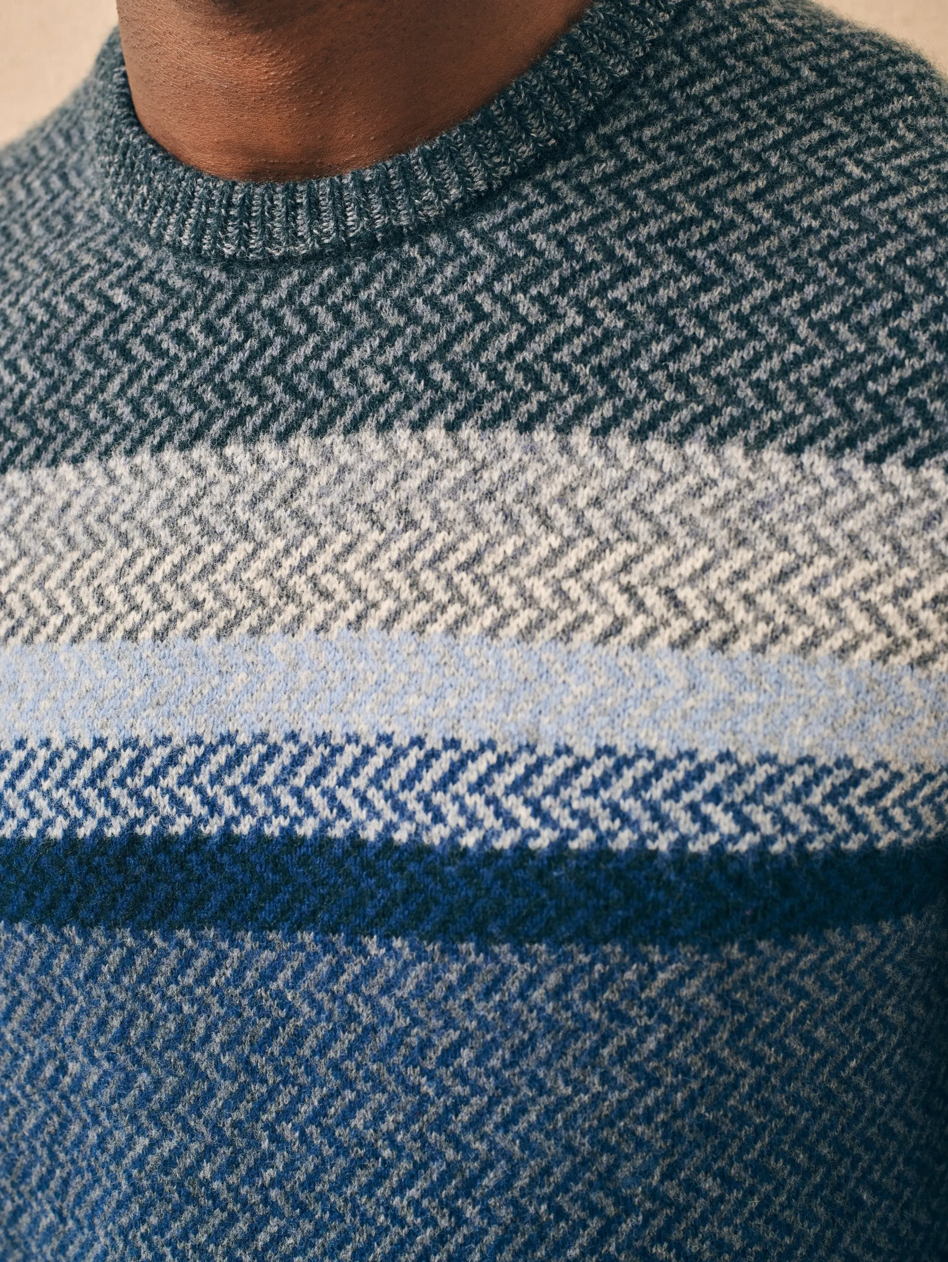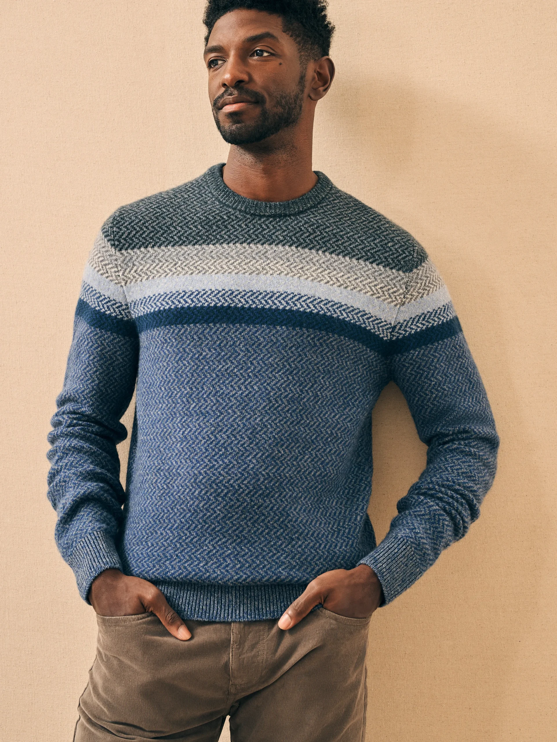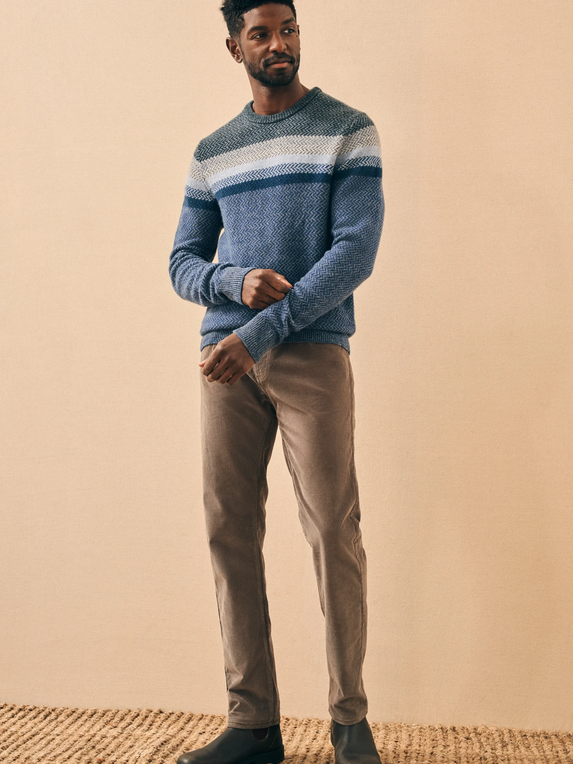Our crewneck sweater features a herringbone knit ombre pattern (inspired by a vintage find from Mike Faherty) that elevates it far above the ordinary sweater. In 100% extrafine Merino wool, its soft and relaxed fit is perfect for layering, without the extra bulk. Wear it with cords for an everyday look or dress it up over a button down with chinos to get you through any holiday event.