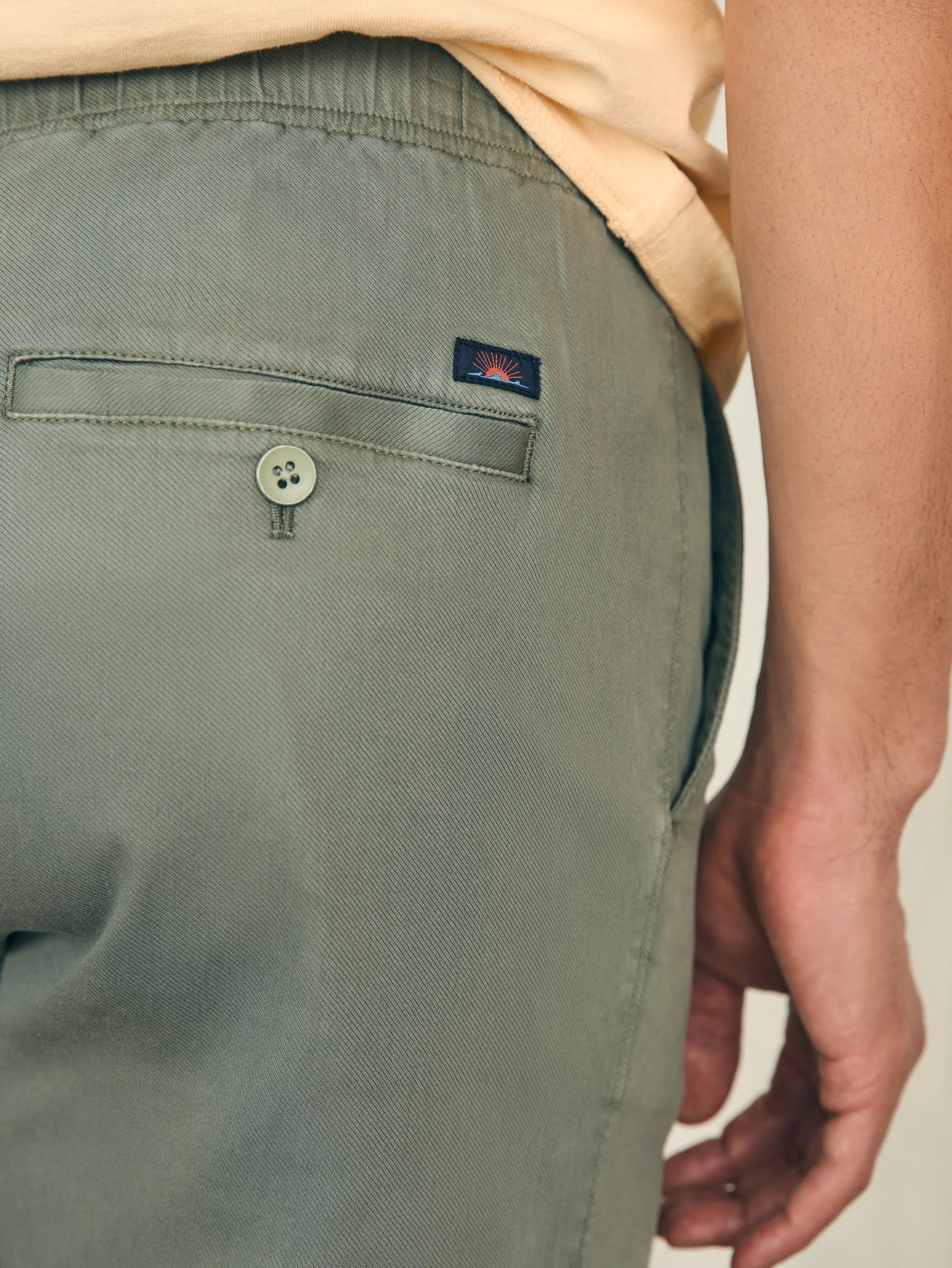- Detail: Elasticated waistband with drawcord. Two front slash pockets. Back welt pockets with button closure at the wearer’s right