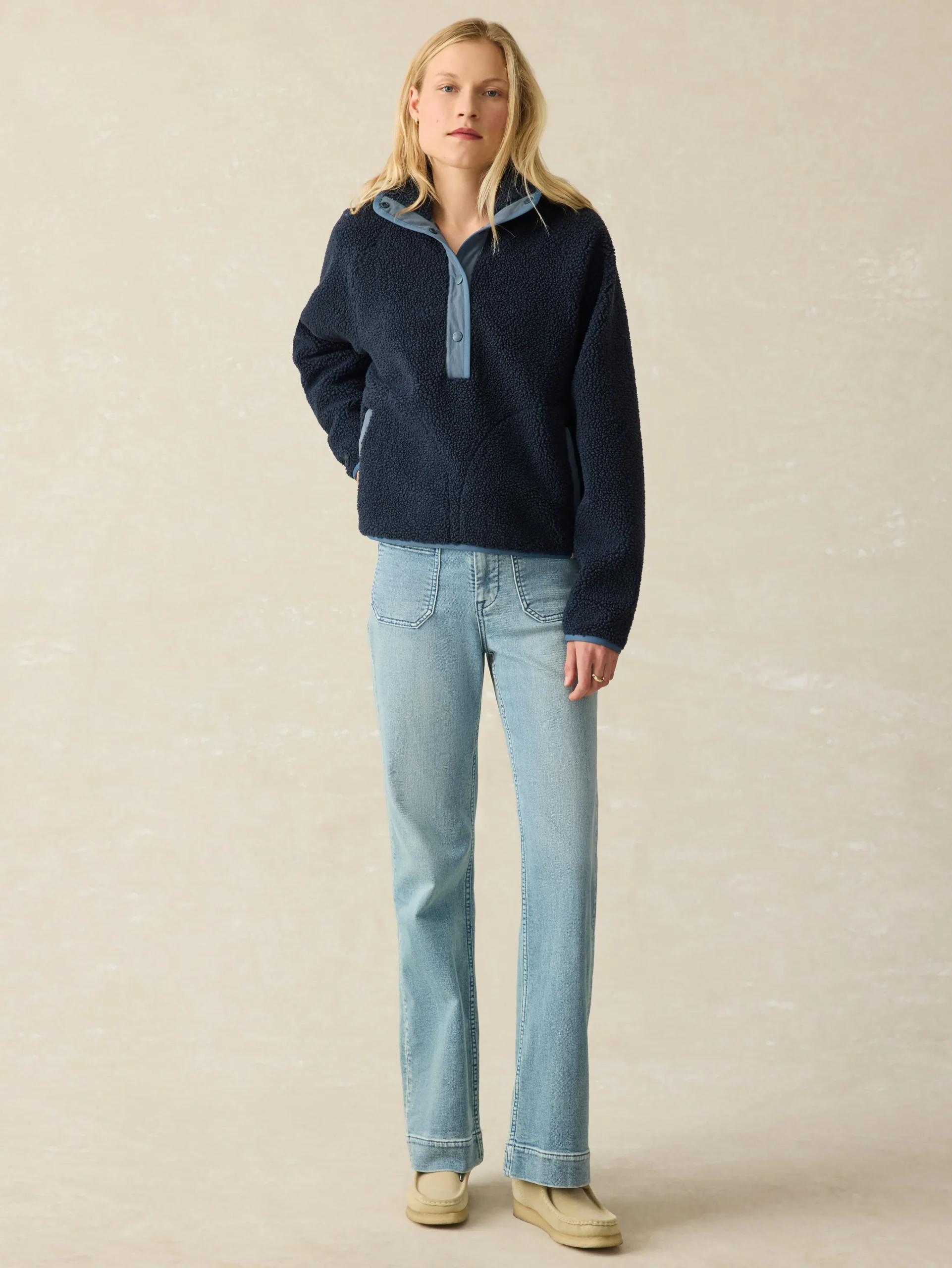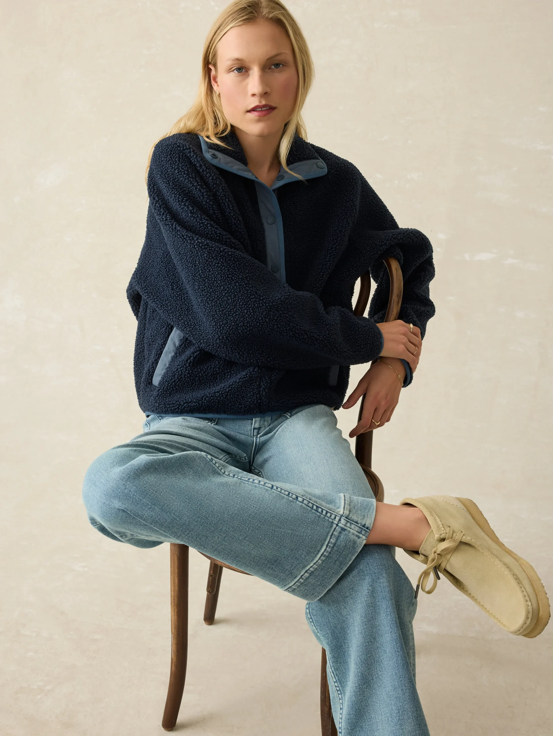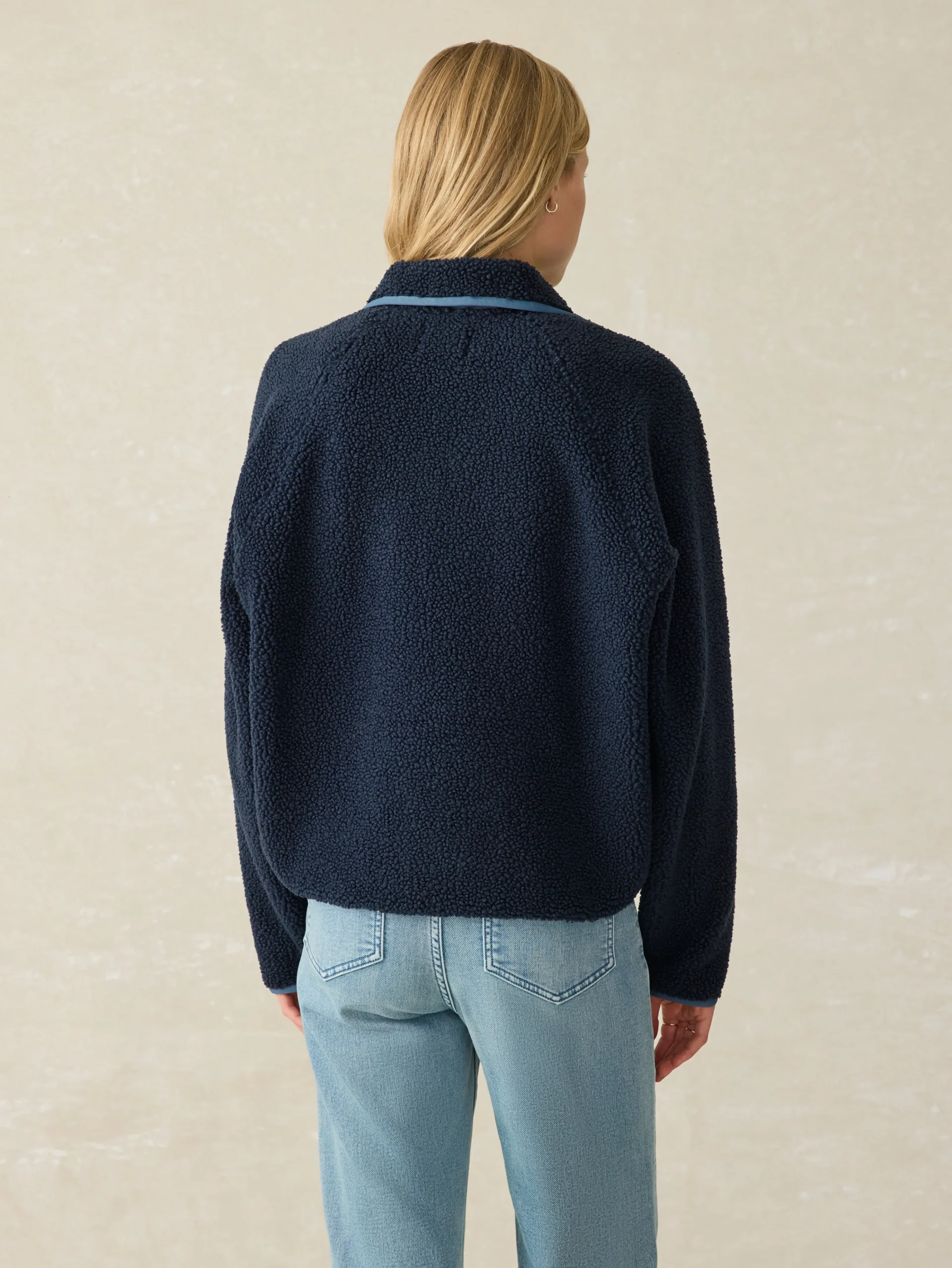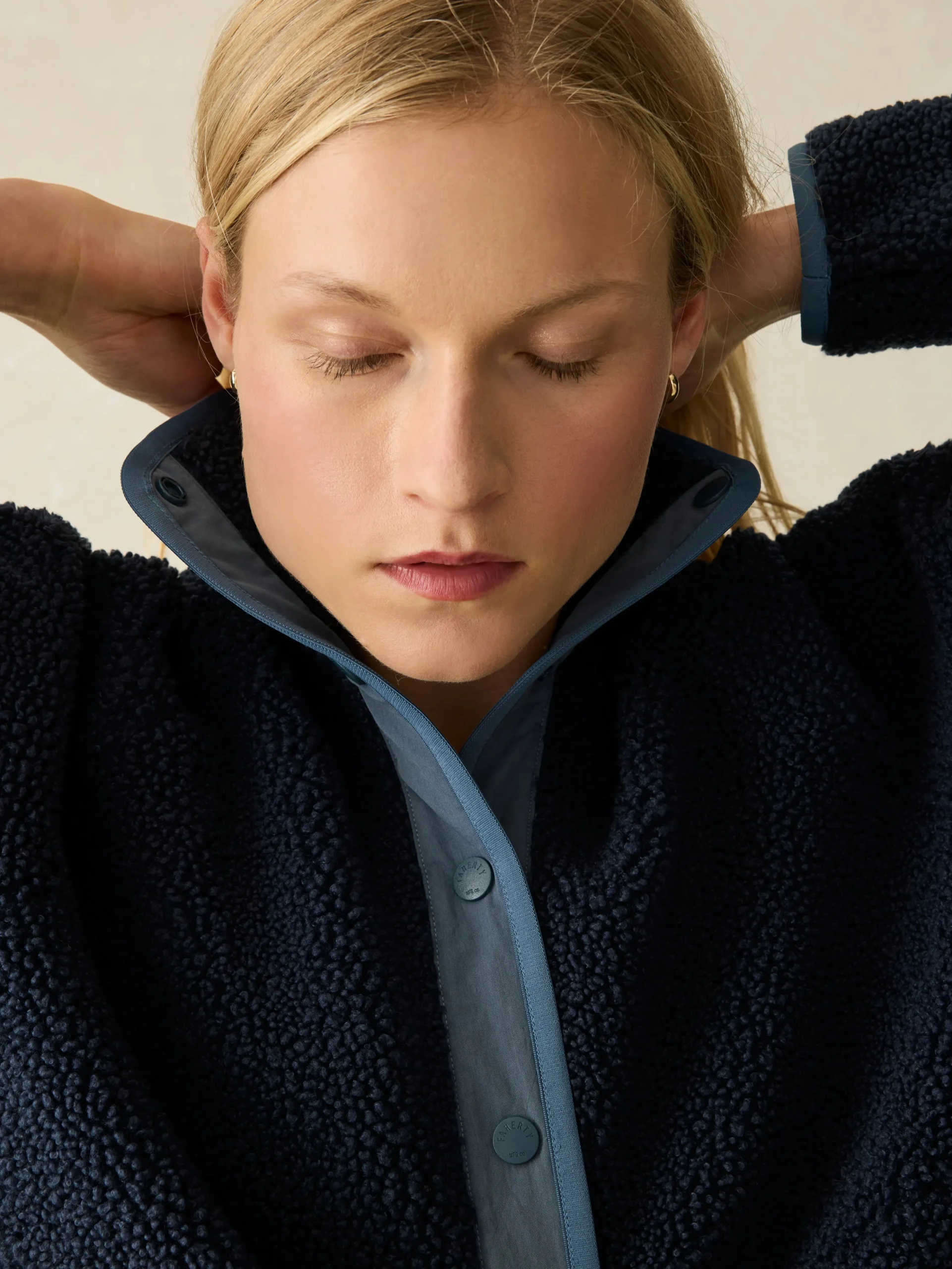 - Detail: Stand collar faced with fleece. Quarter-length snap placket. Pockets with interior snap closure. Elastic binding at sleeve opening and bottom hem. Clip label at hem.