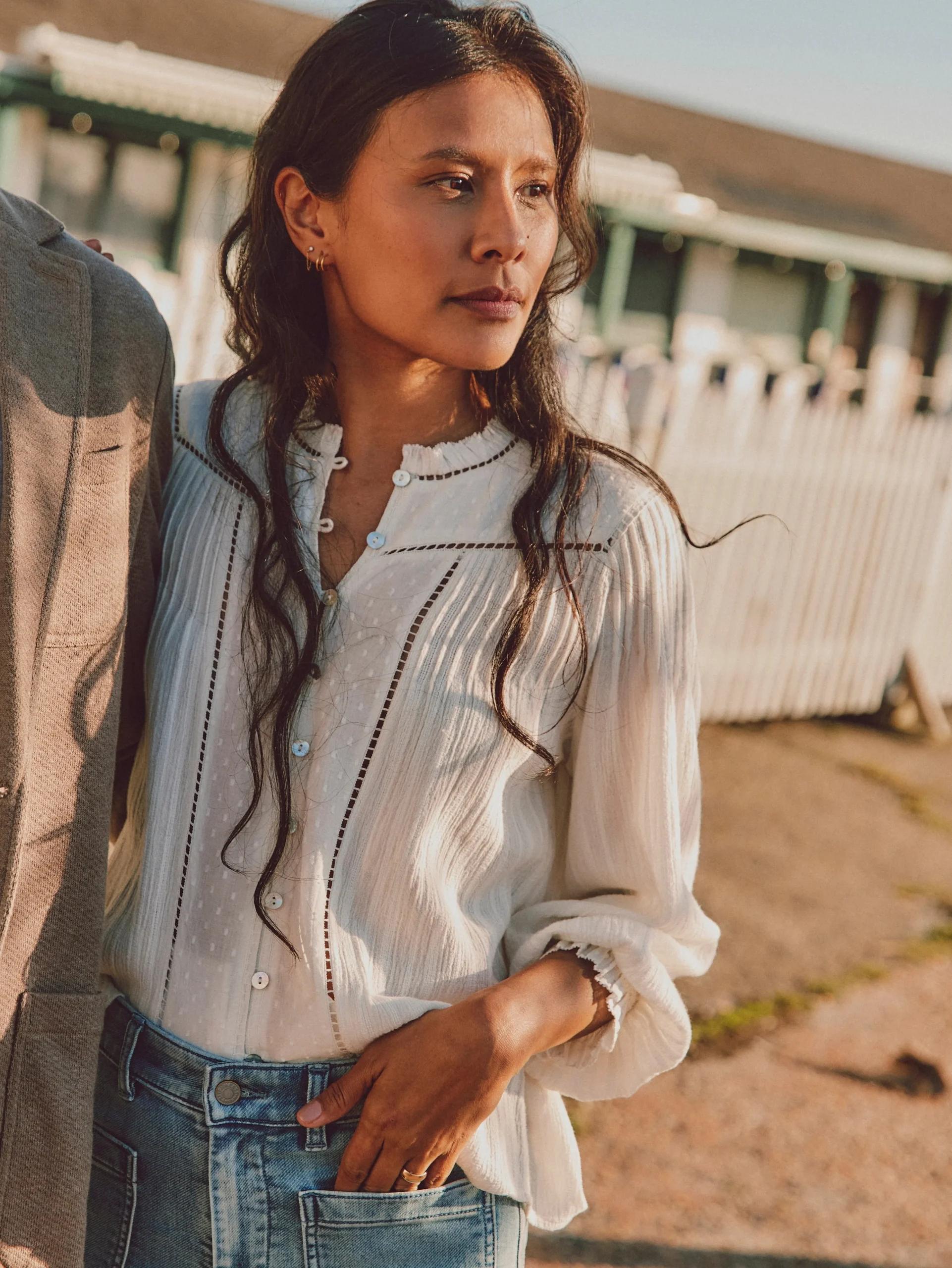 Our new fall top flows like a dream with artisanal details that elevate it from the everyday. With delicate pintucks at the bodice, charming ladder trim inserts, and a cotton dobby combination fabric that gives a lovely ruffle, this blouse exudes a low key romantic charm. Balance the look with your favorite jeans for an outfit that’s perfect for just about every meetup.