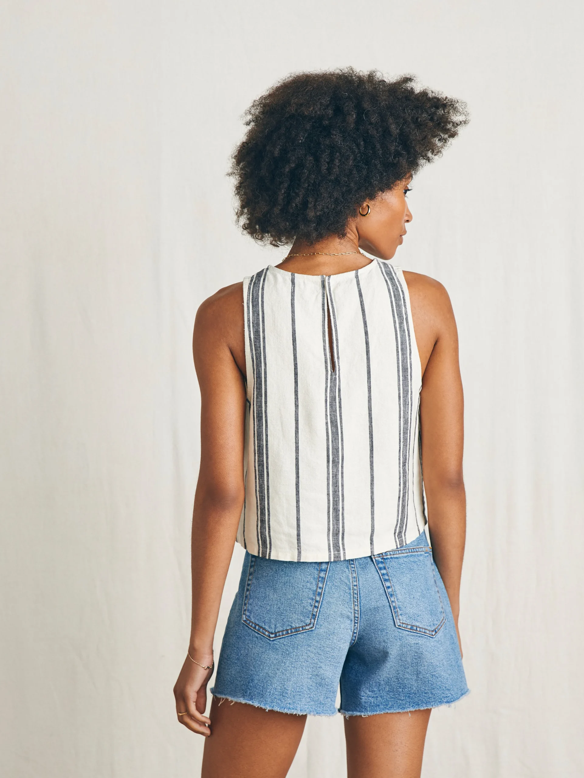 - Detail: Sleeveless shell top with keyhole at back.