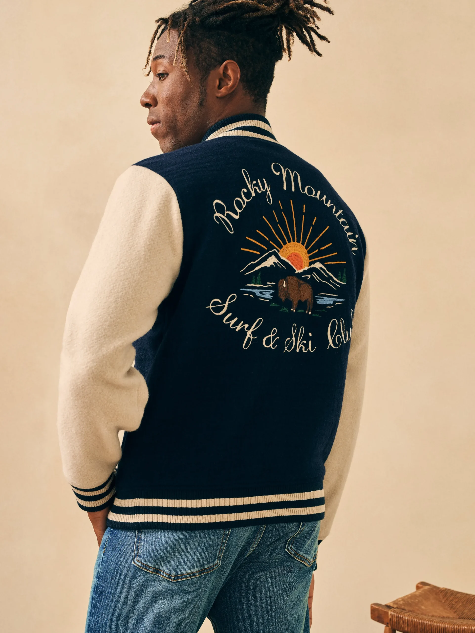 An oldie but a goodie – this throwback varsity jacket has all the classic sporty stylings you remember, updated with a Faherty touch inspired by the great outdoors. From the front chenille patch to the back which features a large embroidered panel of custom Rocky Mountain-themed graphics, this is the unexpected layer that pulls together any outfit with that casual cool character.