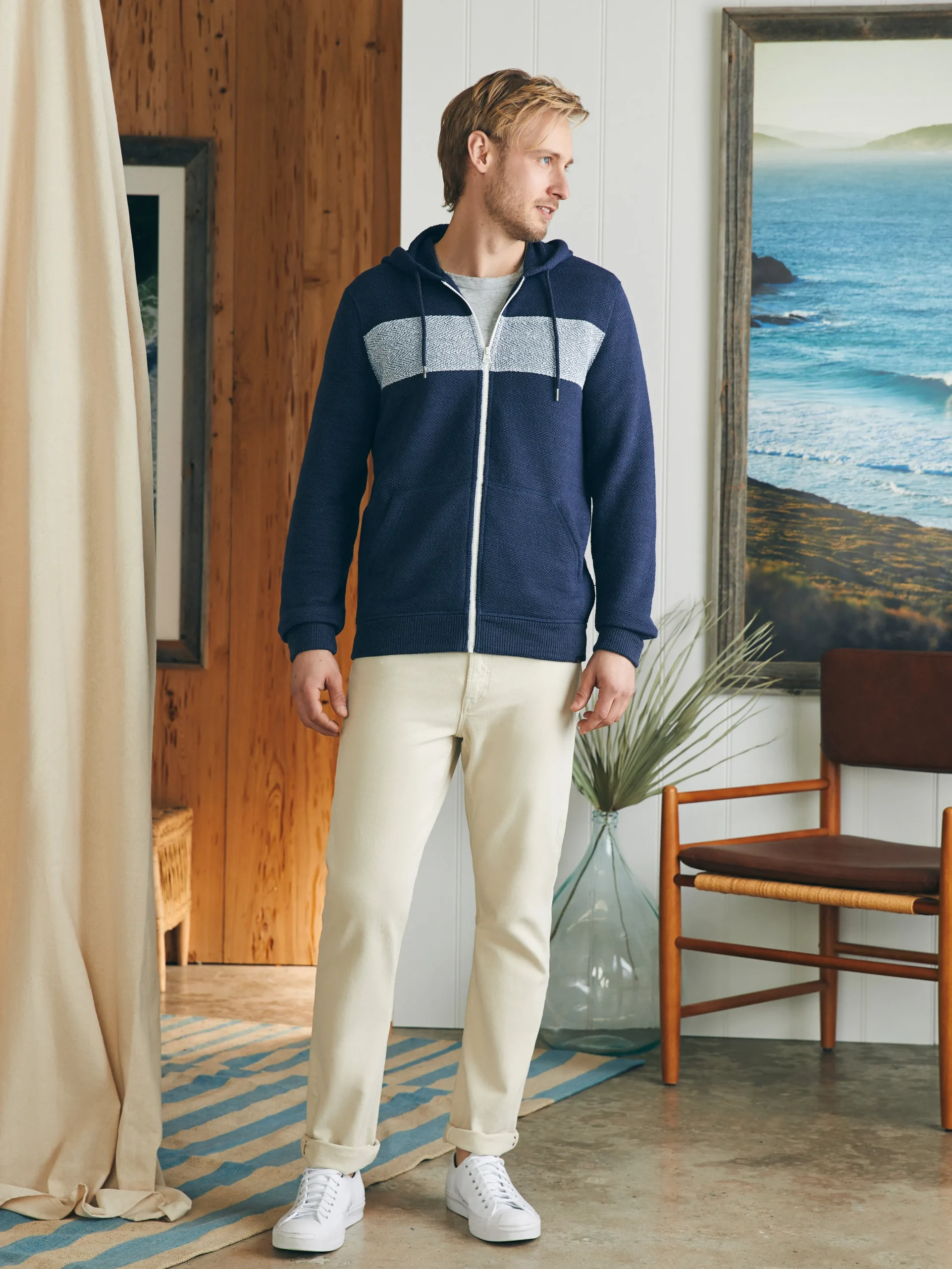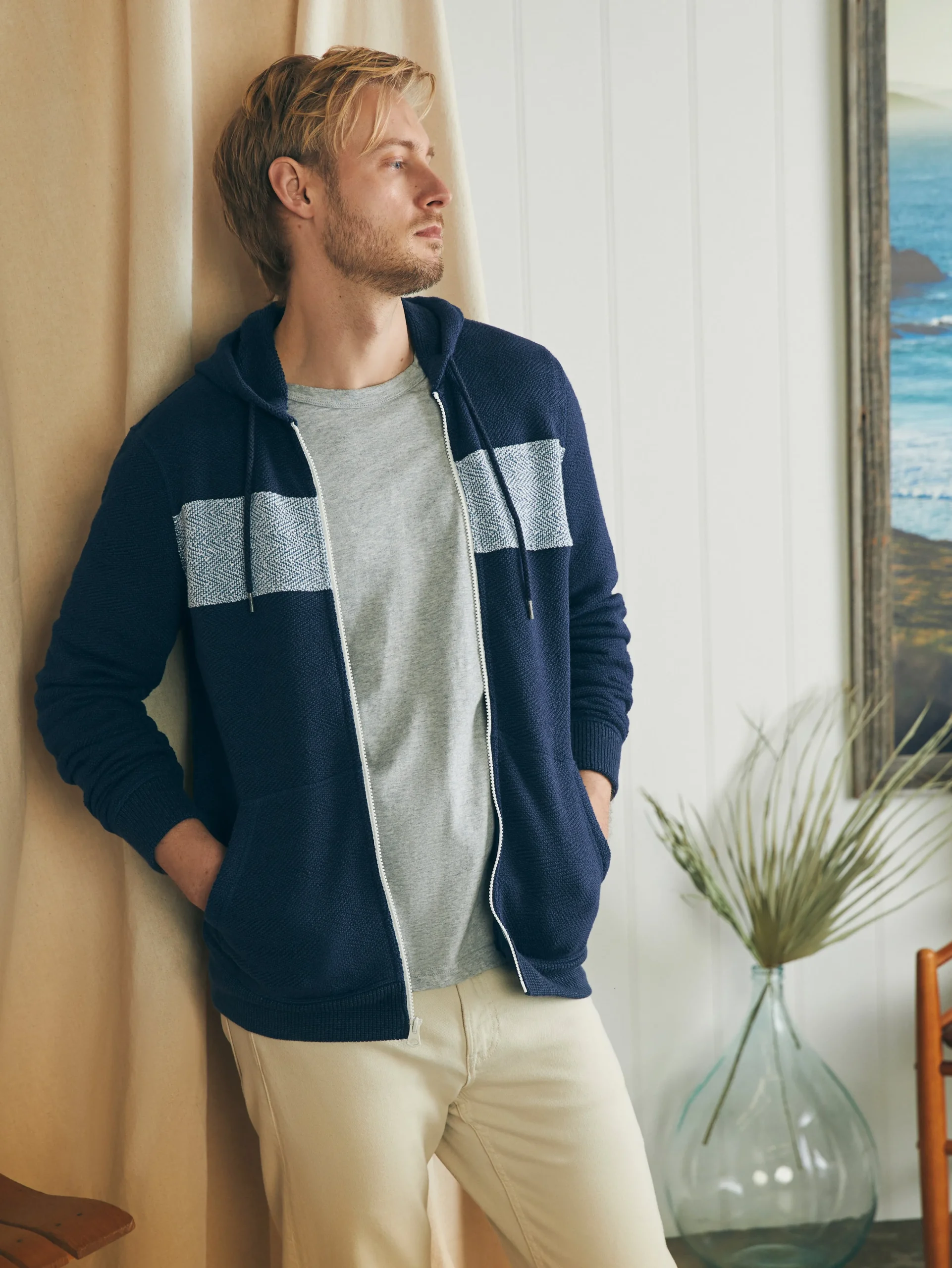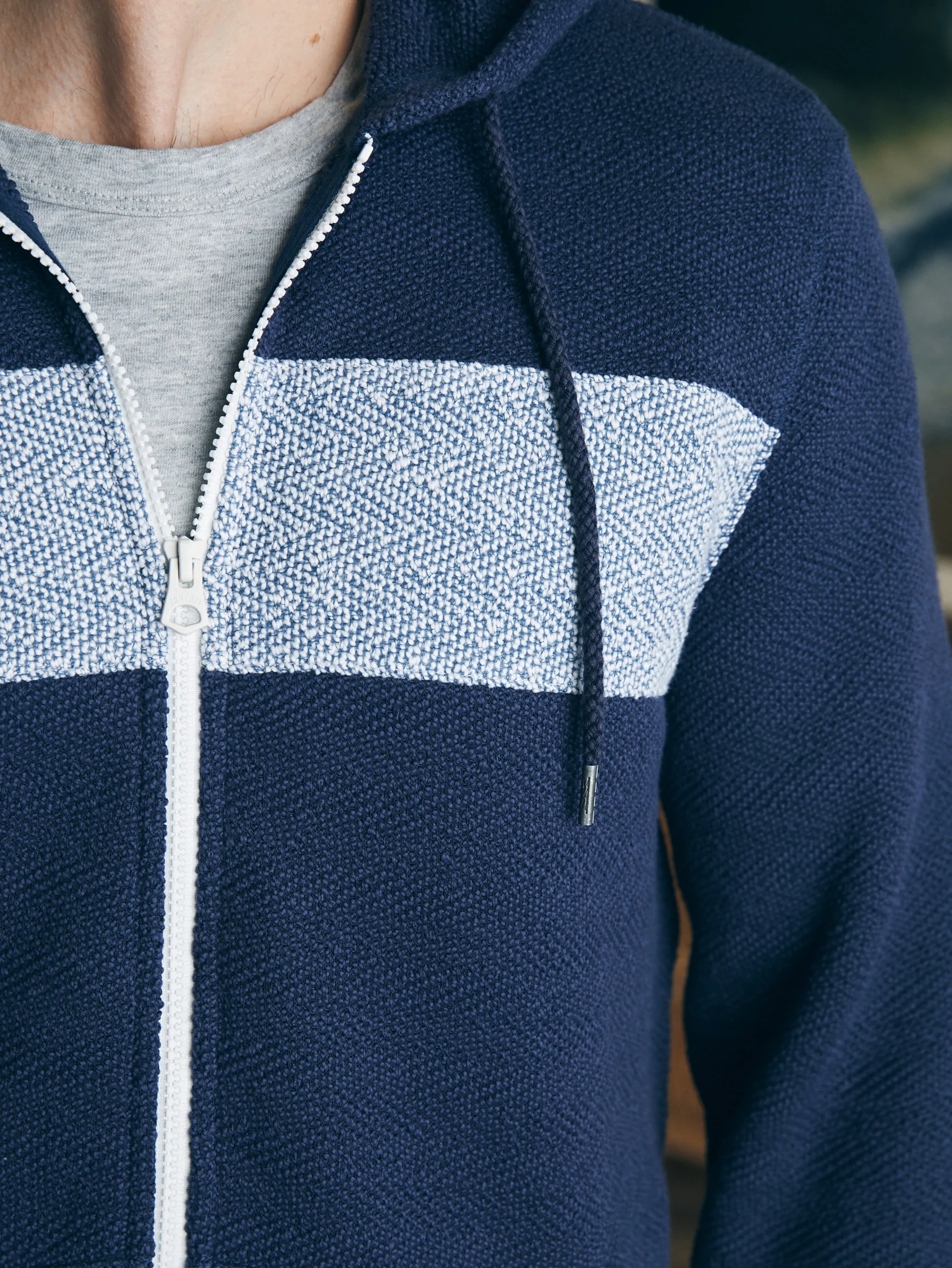 - Detail: Zip up style. Knit rib cuffs and bottom band. Hood with drawcord. Hip pockets. Pieced stripe across chest.