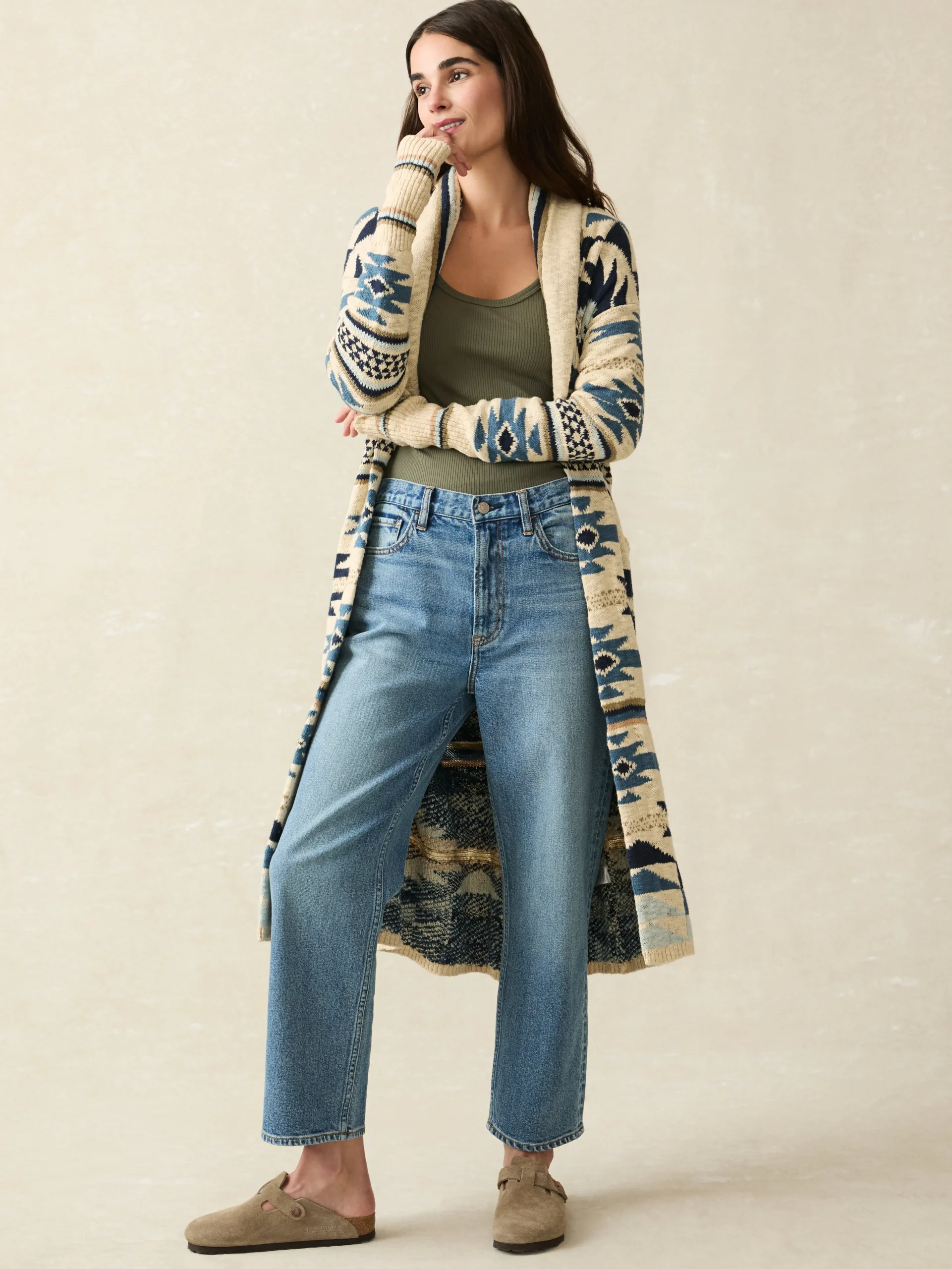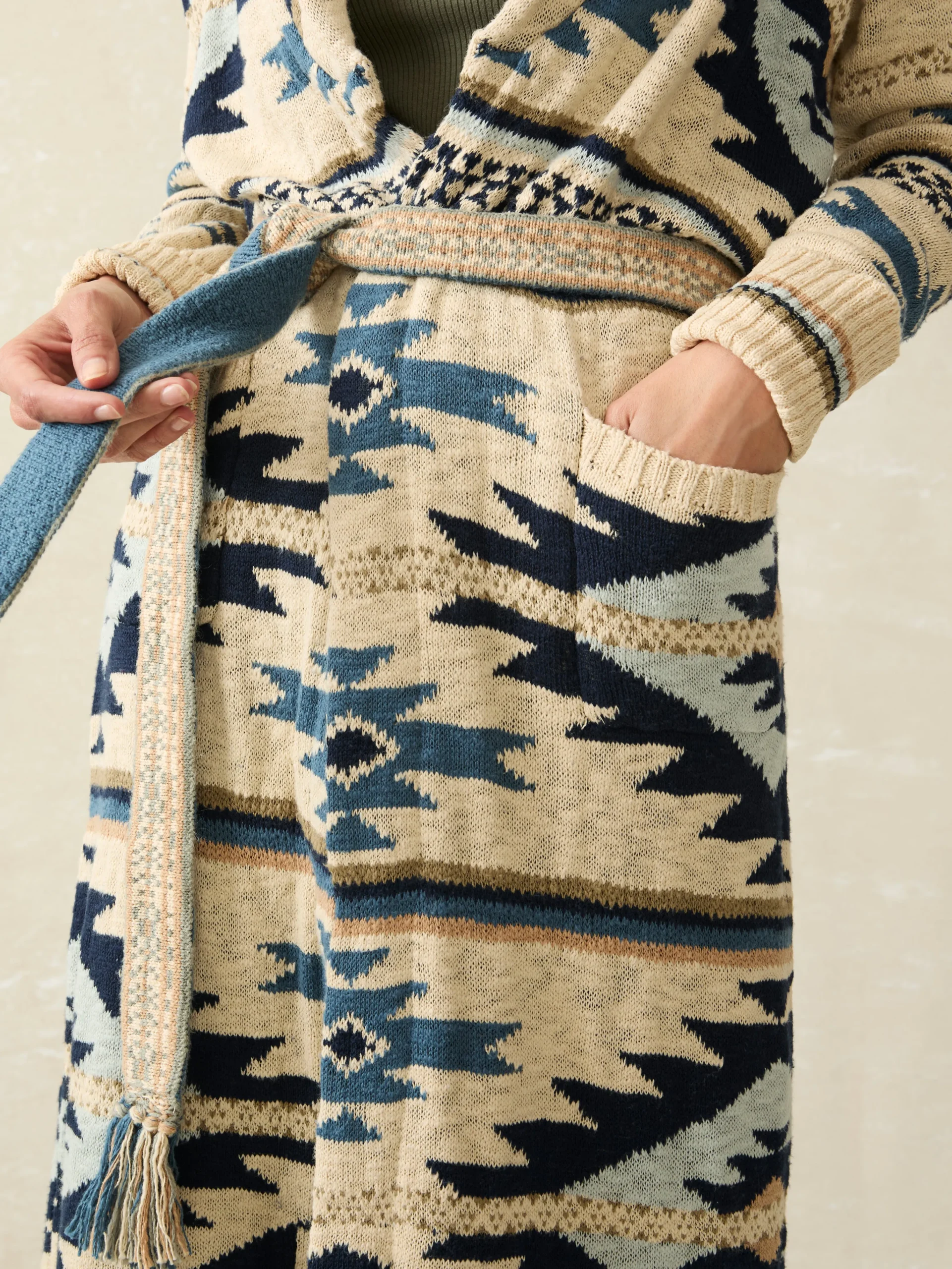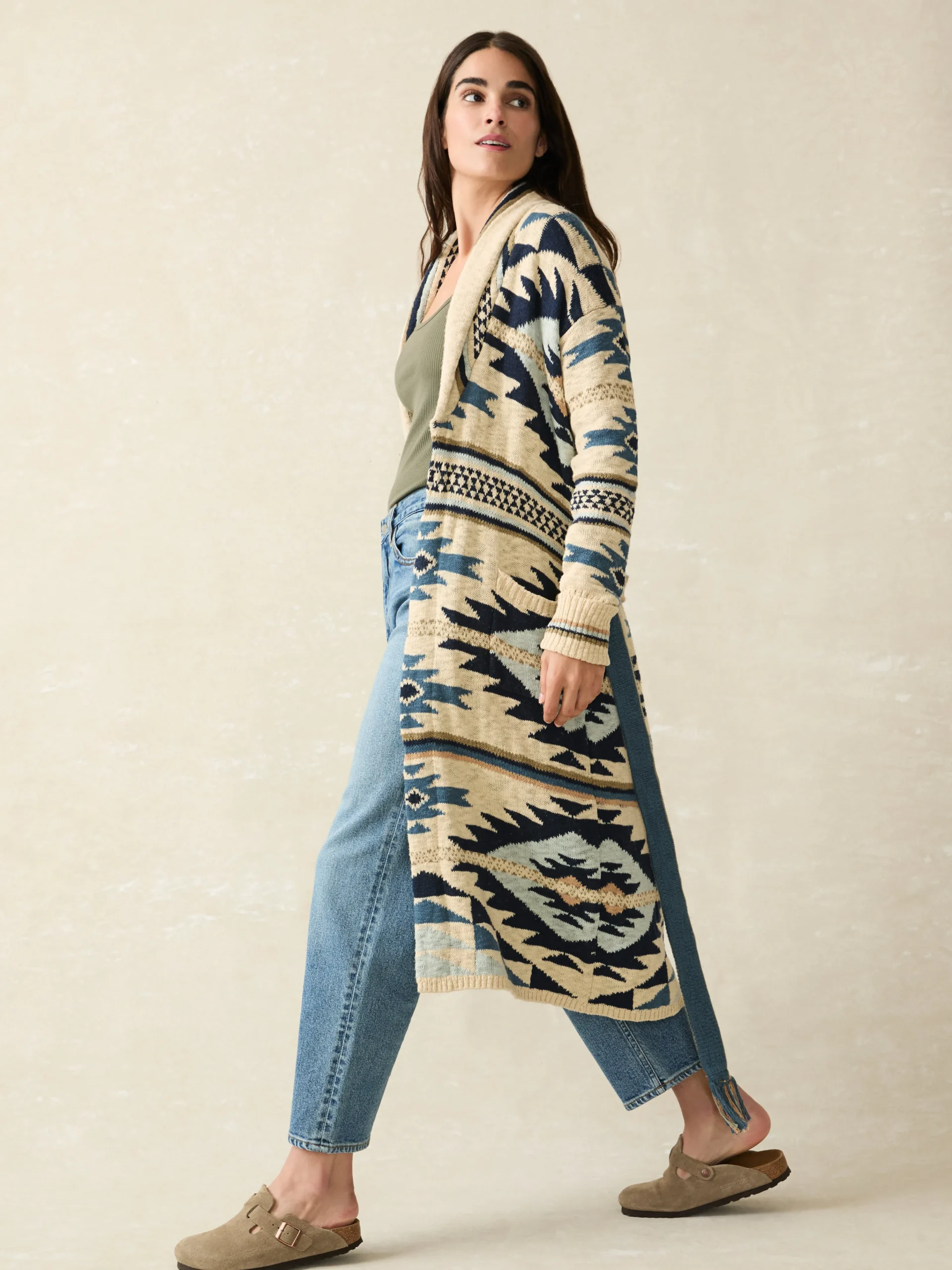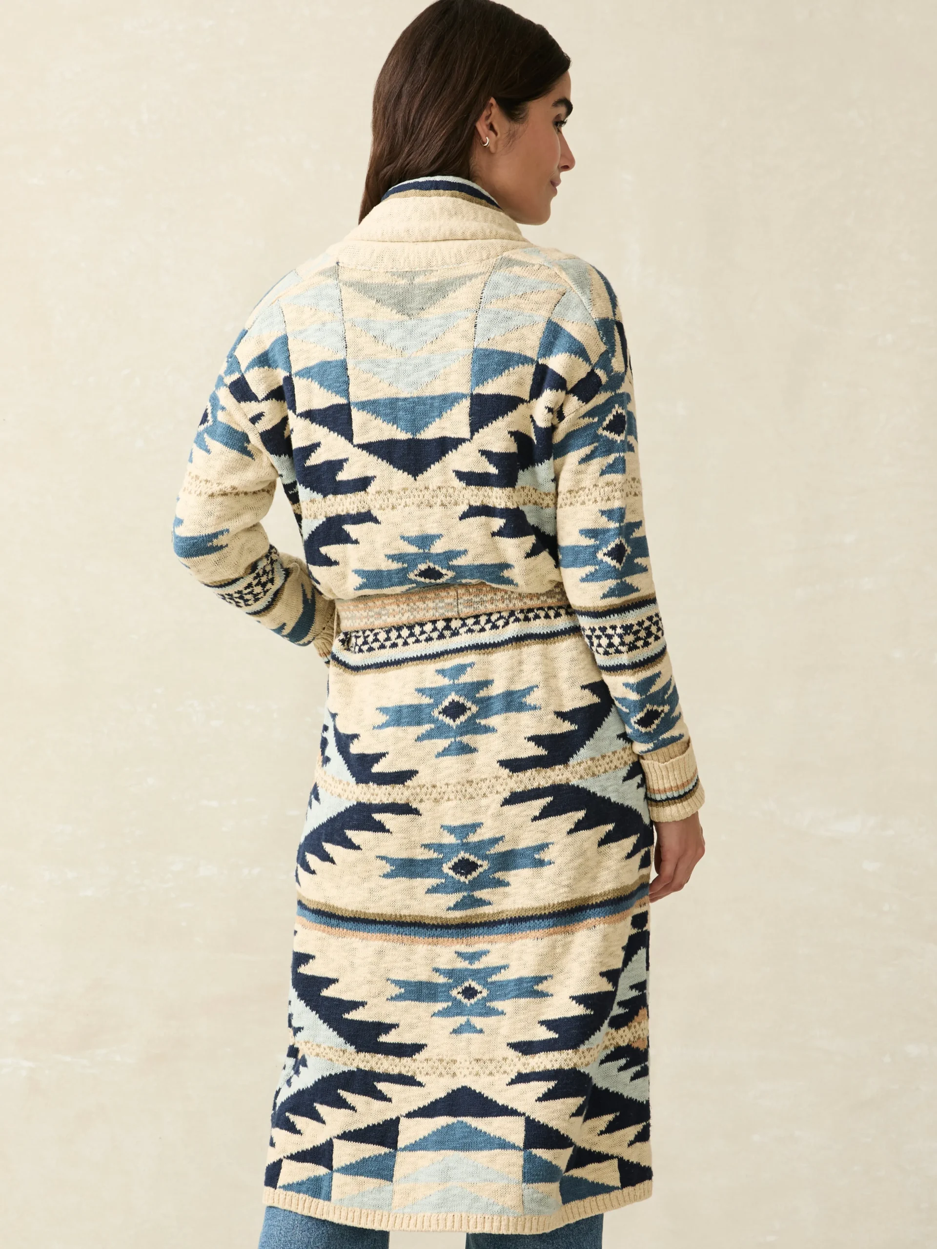 A true one-of-a-kind, the Paloma™ is crafted from cozy, lightweight, 100% organic cotton jacquard that’s perfect for any climate. The vintage vibe of this bold piece is underscored by a shawl collar and removable belt, radiating a casual-cool that makes it the perfect layer to wear with everything from pants to dresses. This style features designs inspired by the landscapes and homelands of the Northern Cheyenne and Crow Nations. Created by artist Bethany Yellowtail, the intricate motif elevates the wearability of the cardigan — it’s our go-to layer over any and everything. Bethany Yellowtail is an LA-based fashion designer and CEO of B.YELLOWTAIL. Bethany is originally from the Crow Nation and an enrolled member of the Northern Cheyenne Nation in southeastern Montana.