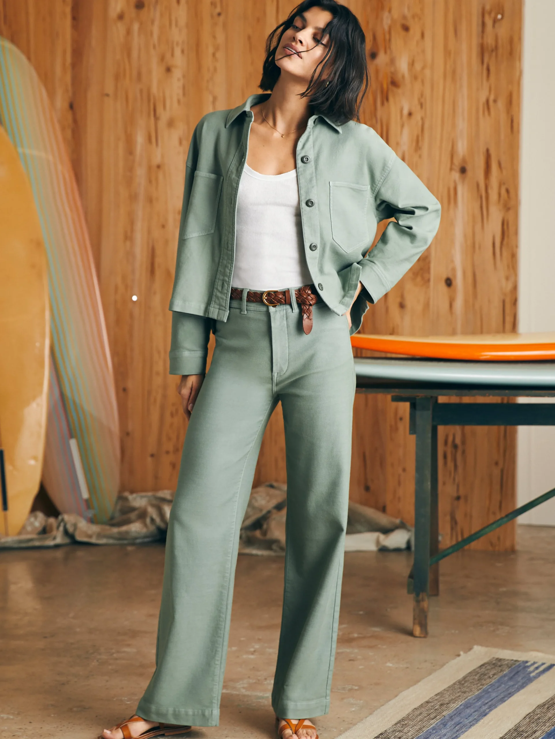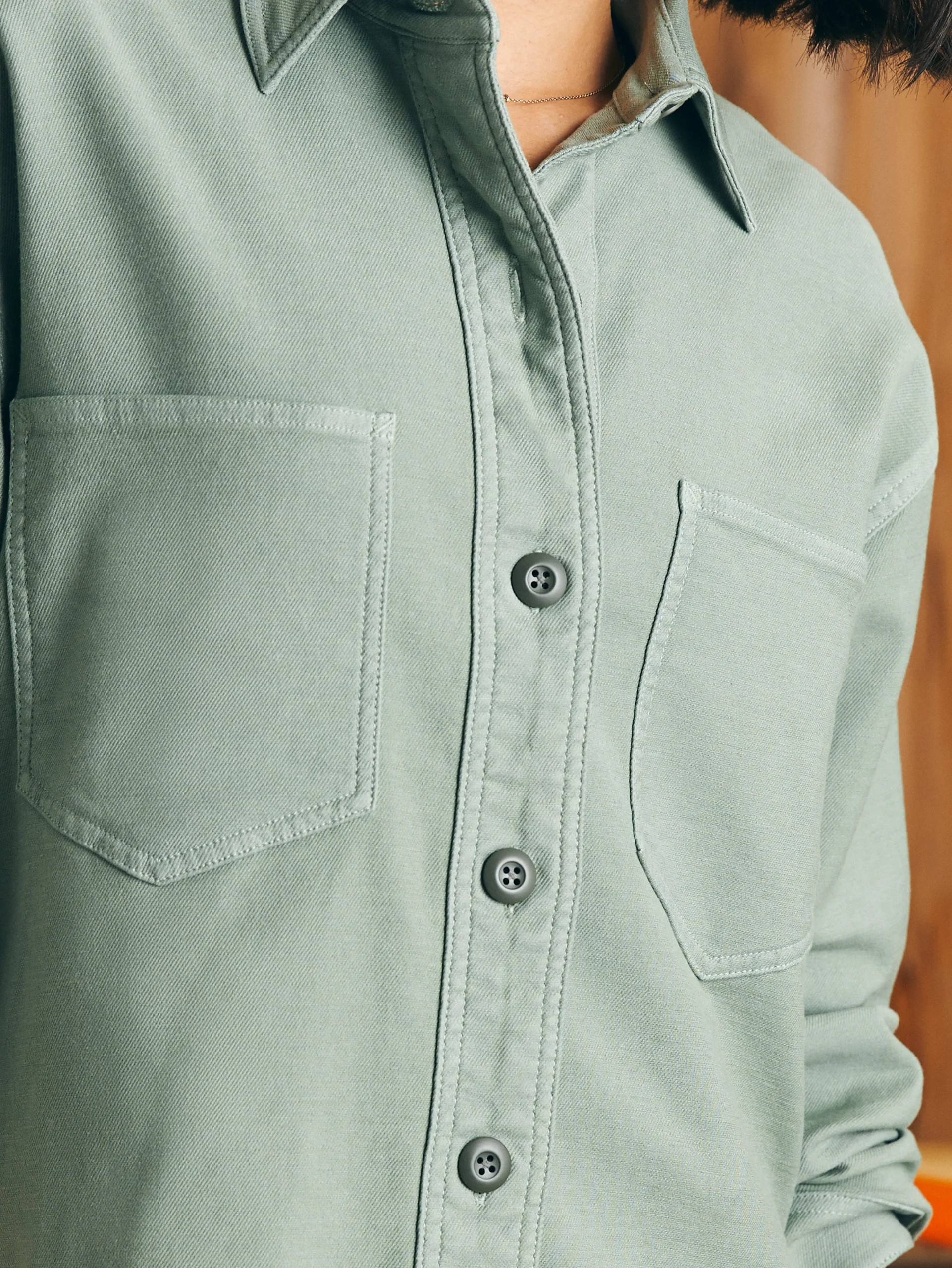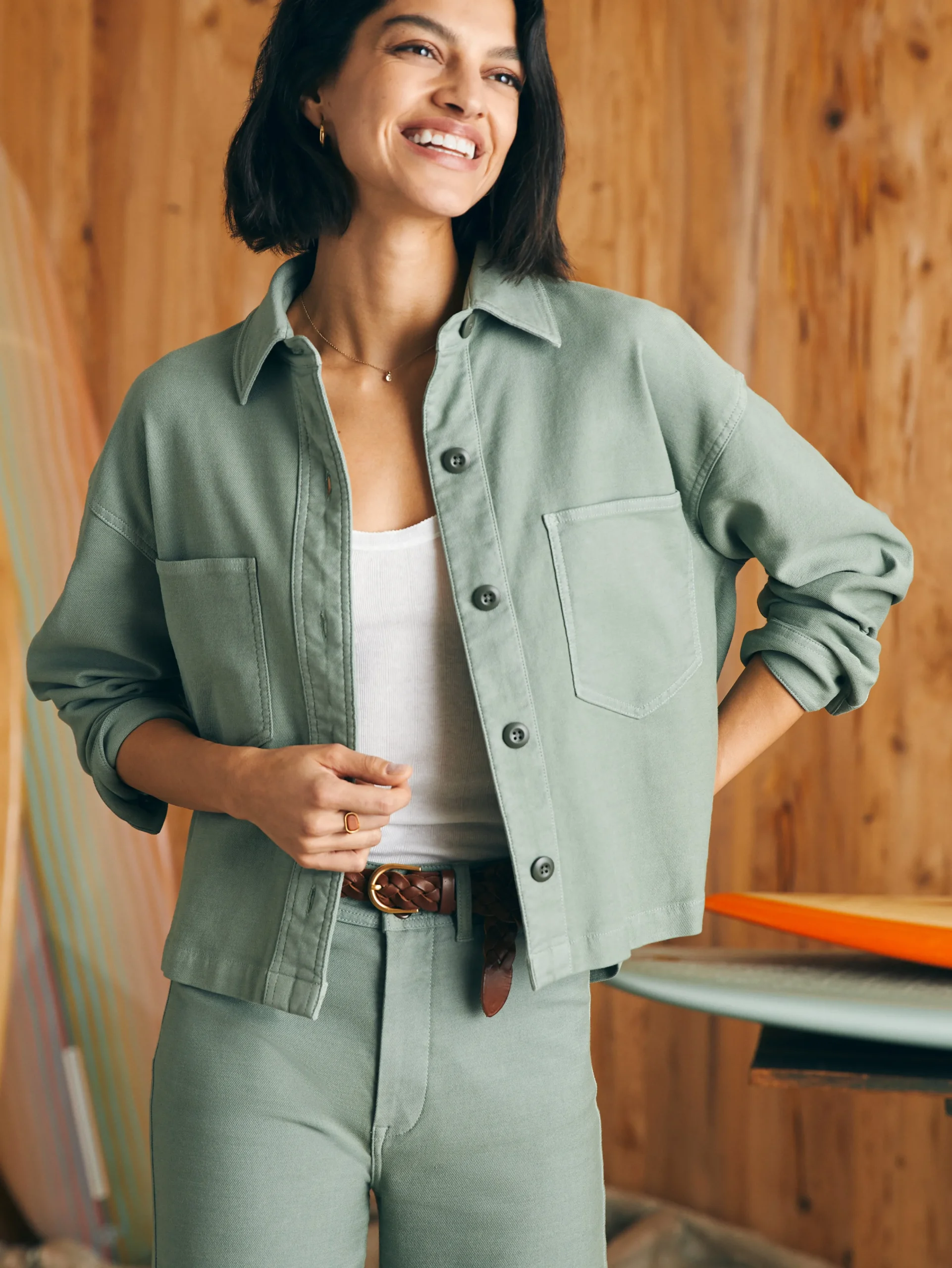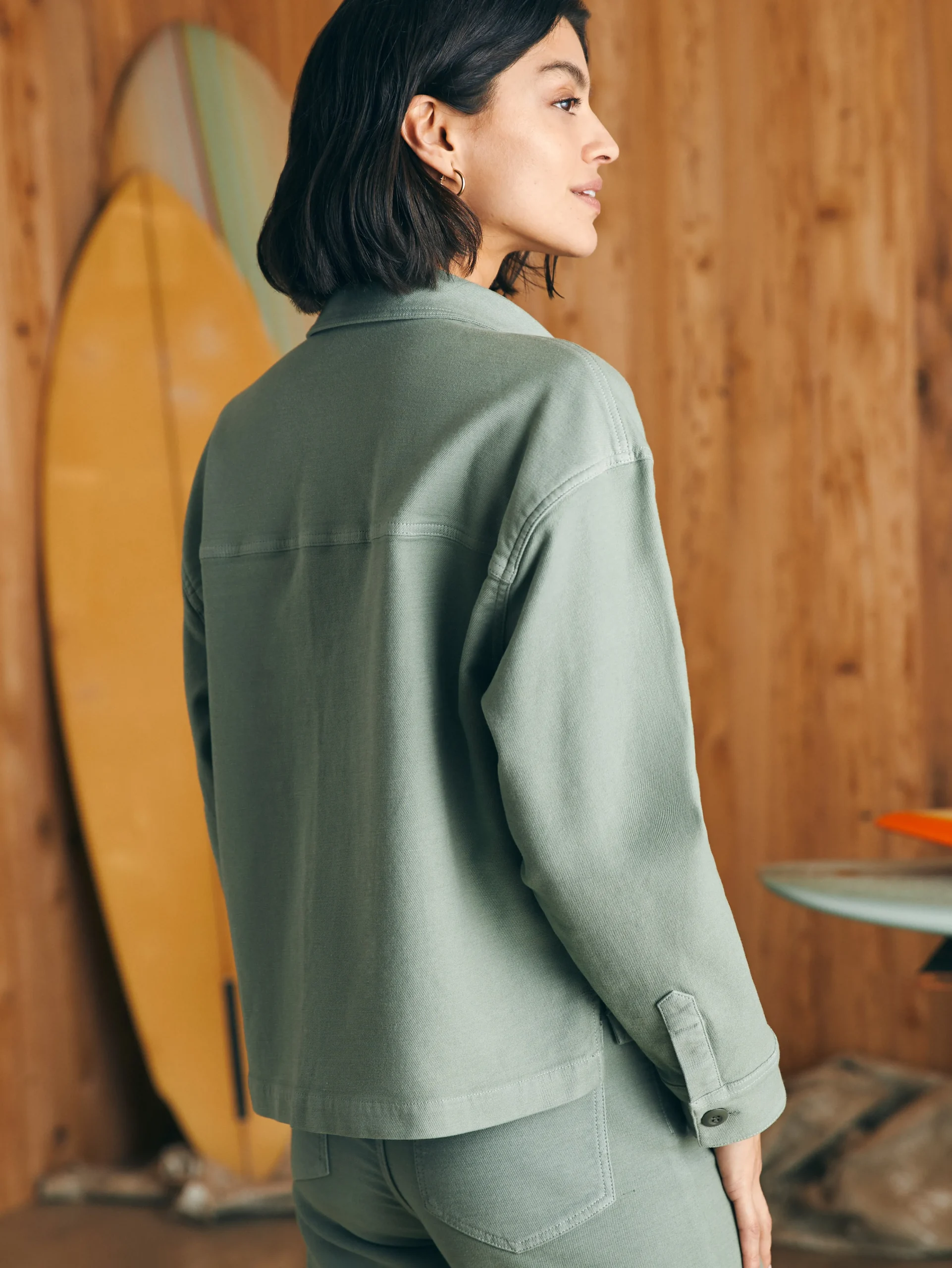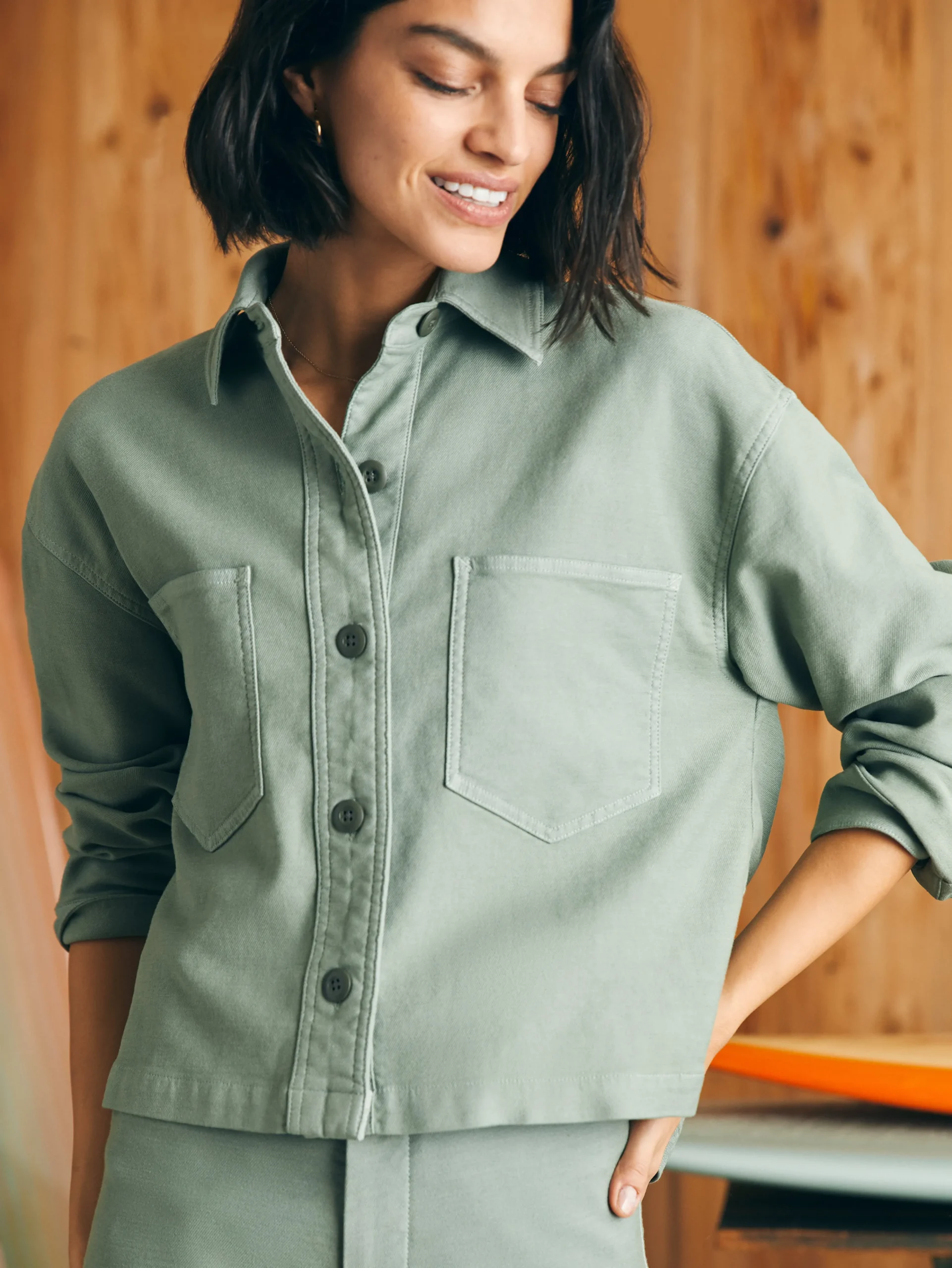 This classic utility-inspired shirt jacket is crafted from our signature Stretch Terry (looks like denim, feels like sweats) and works over any outfit with just enough stretch and a slightly oversized and boxy fit. Perfectly washed in sun kissed colors, it feels like you’ve had it forever.