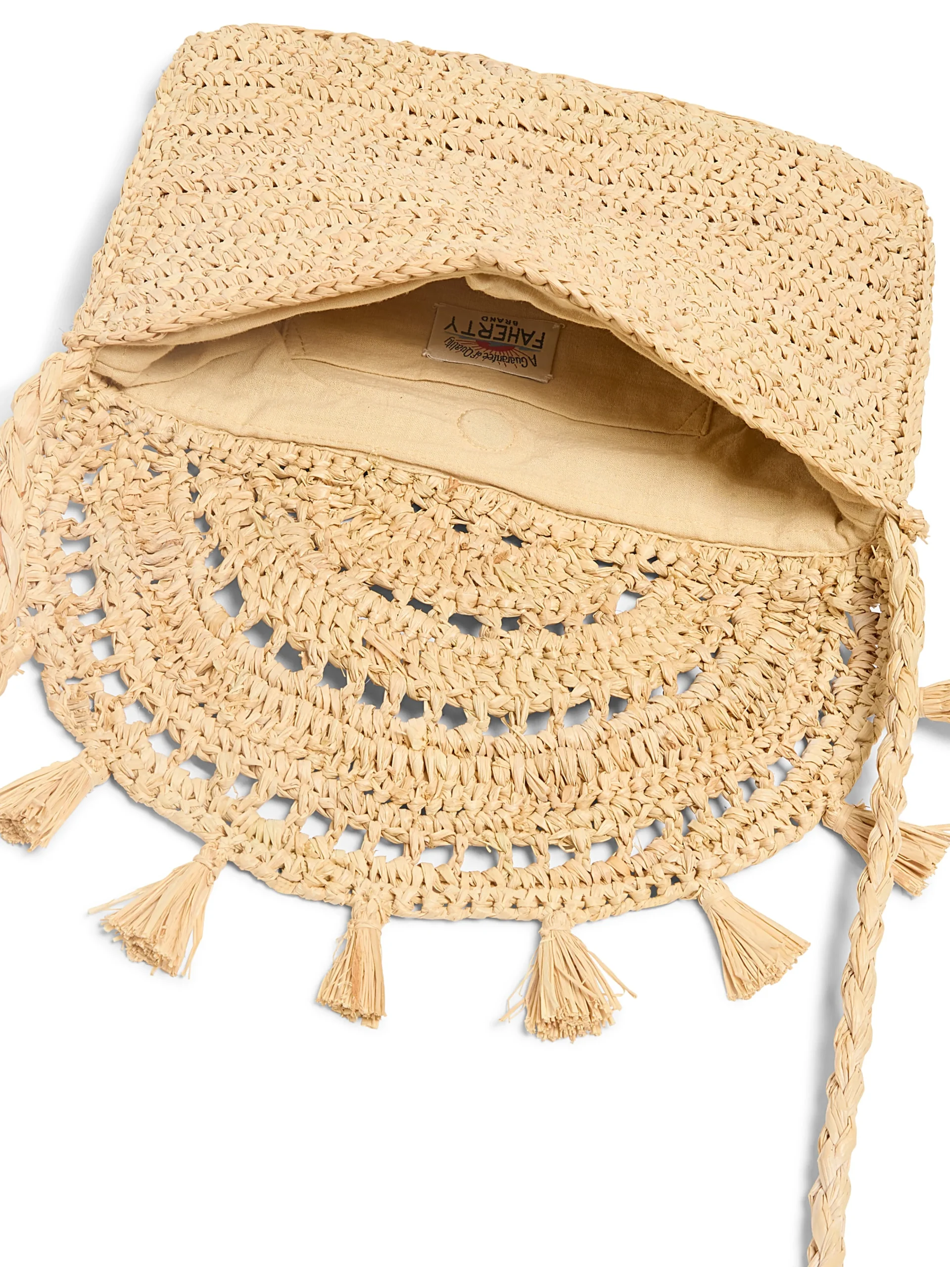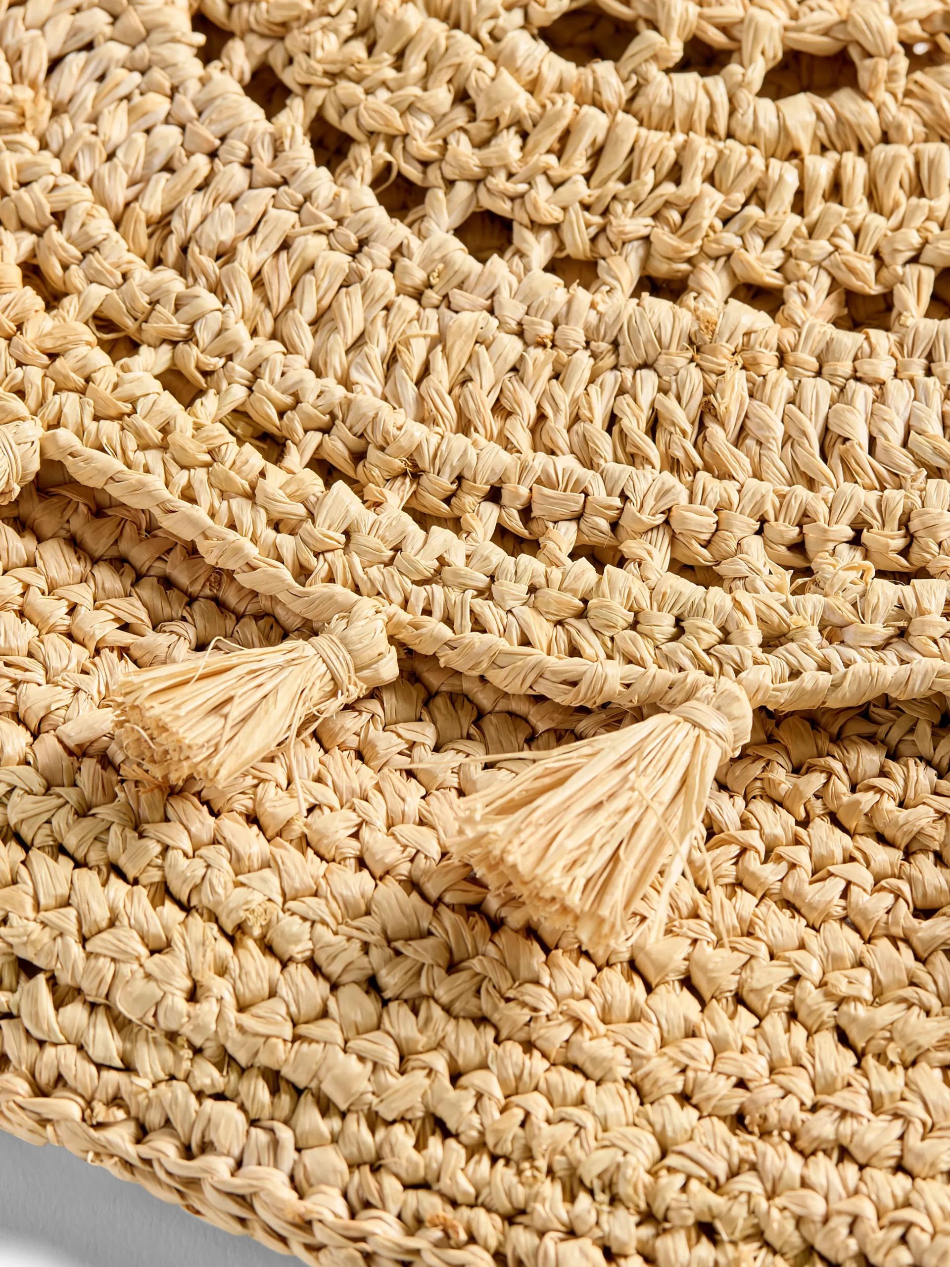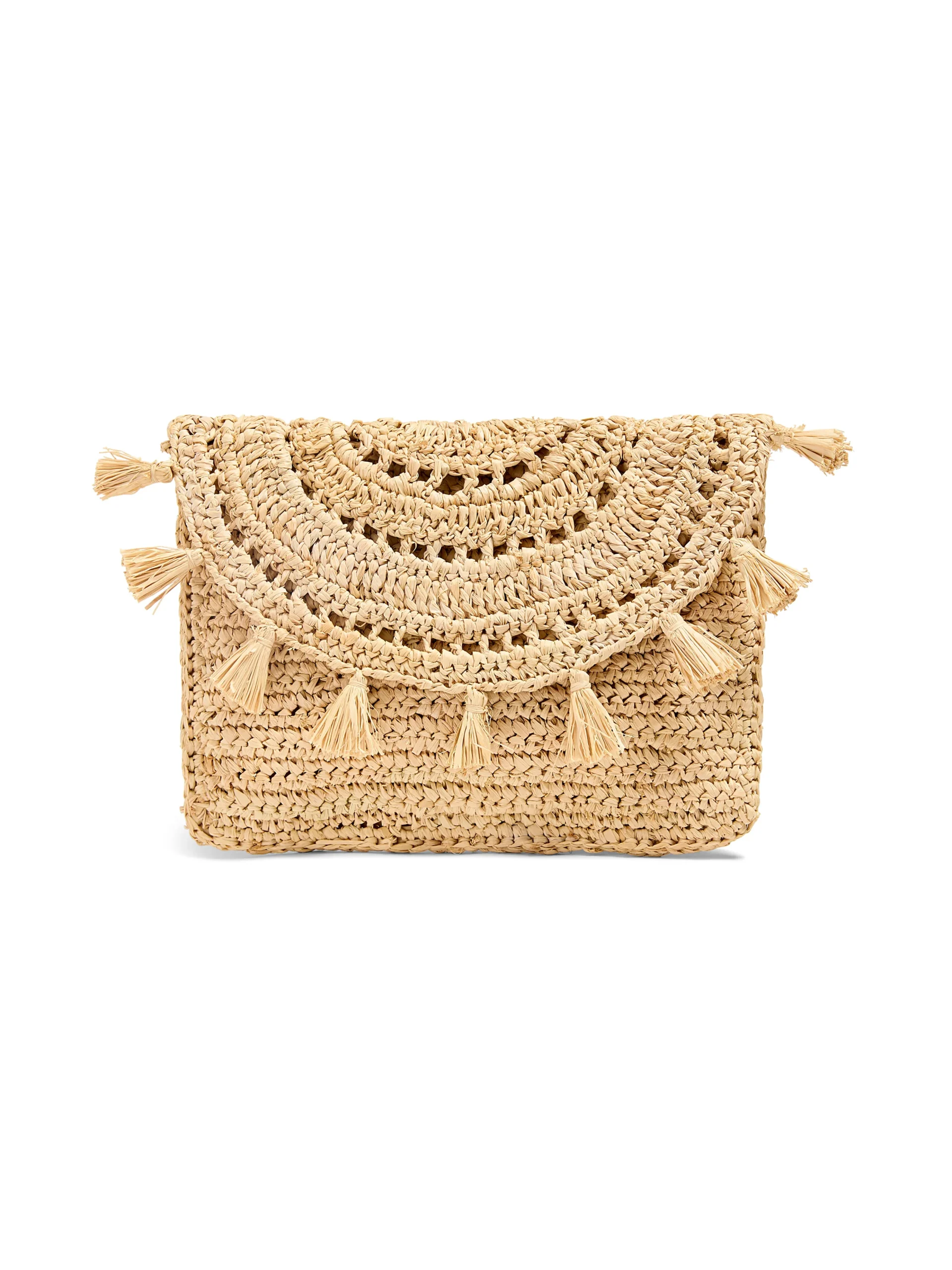 Playful tassel trim gives this hand-crocheted raffia bag a fun-in-the-sun attitude whether you wear it crossbody for day trips or as a clutch for summer weddings.