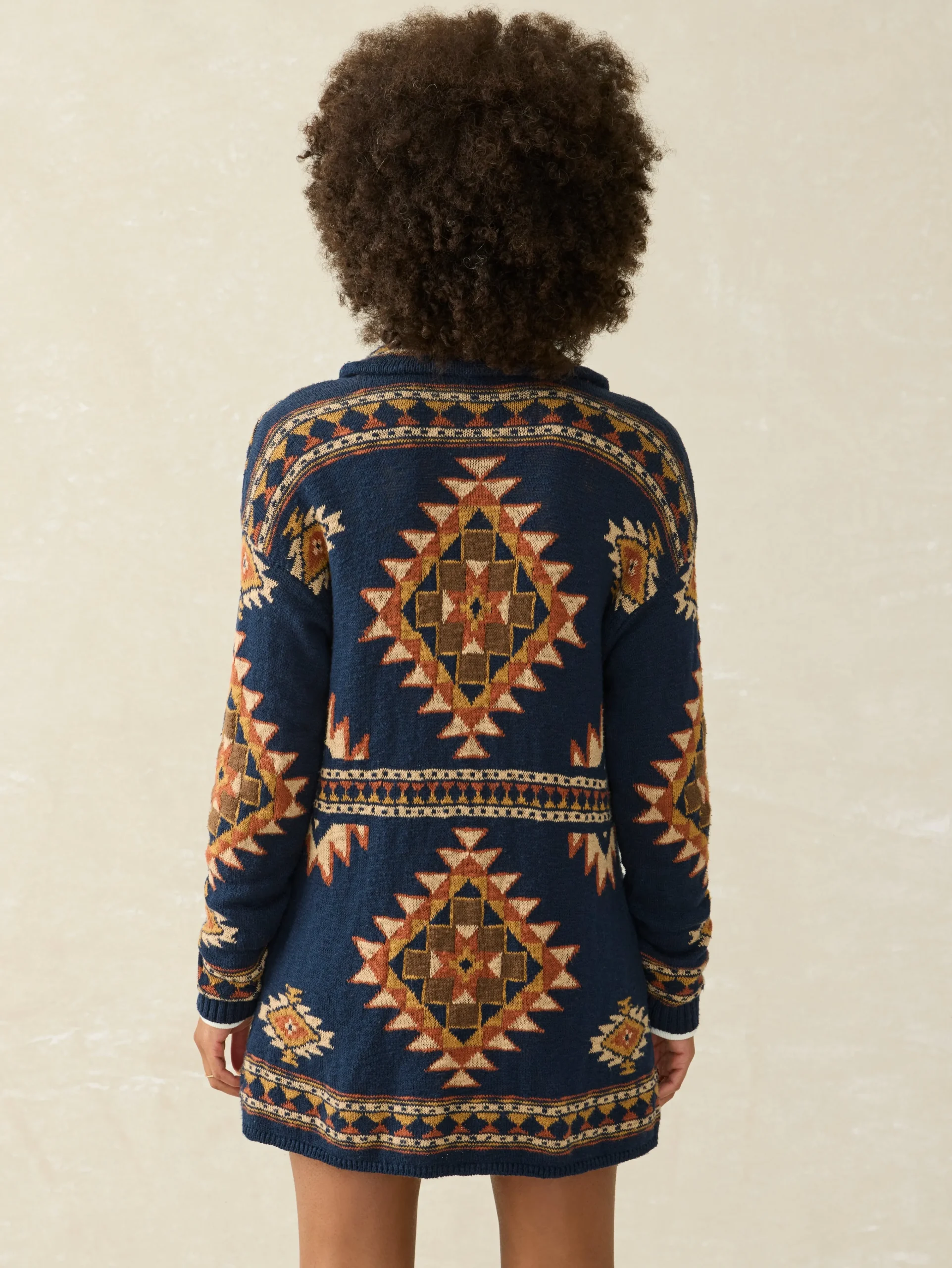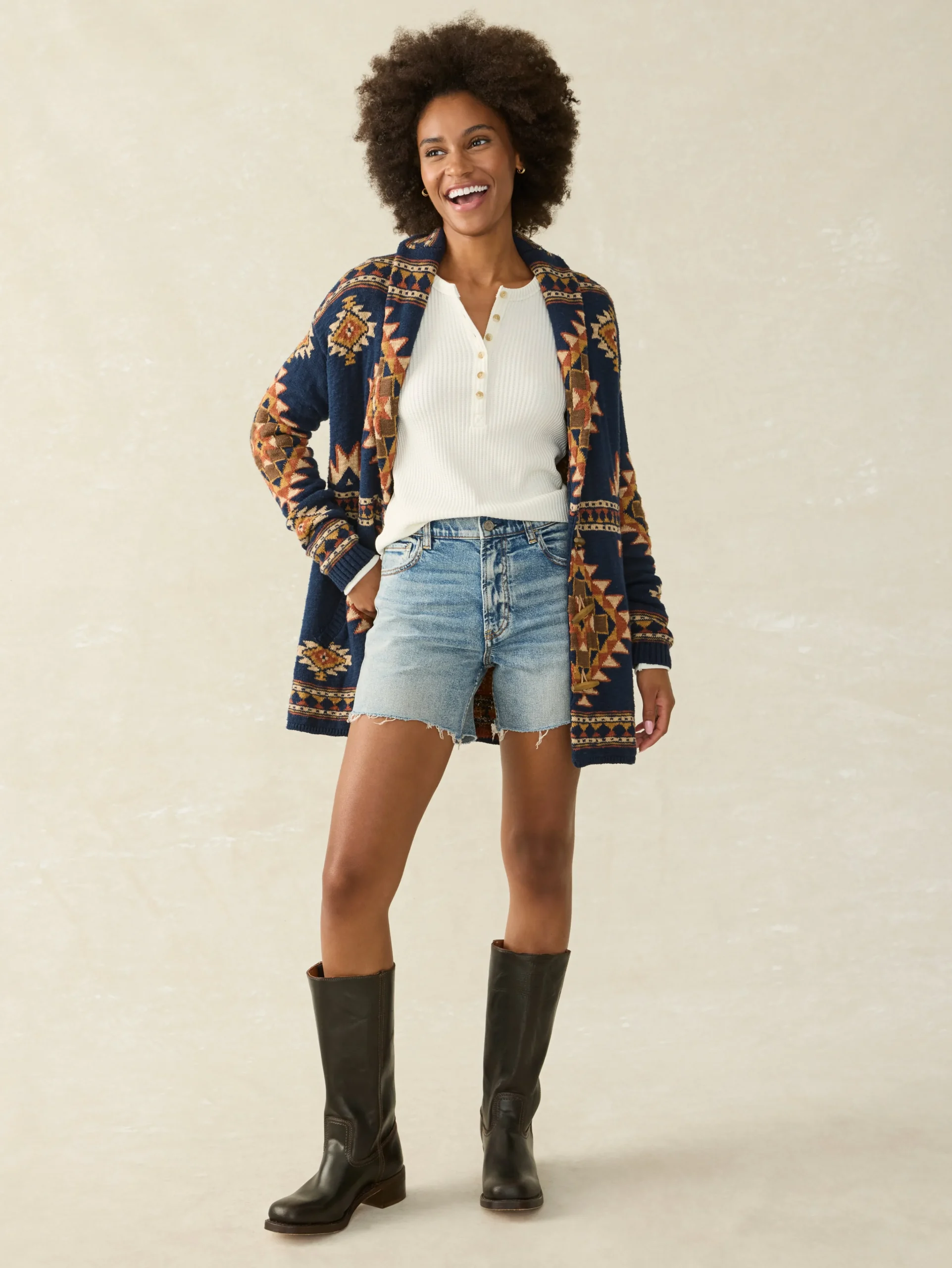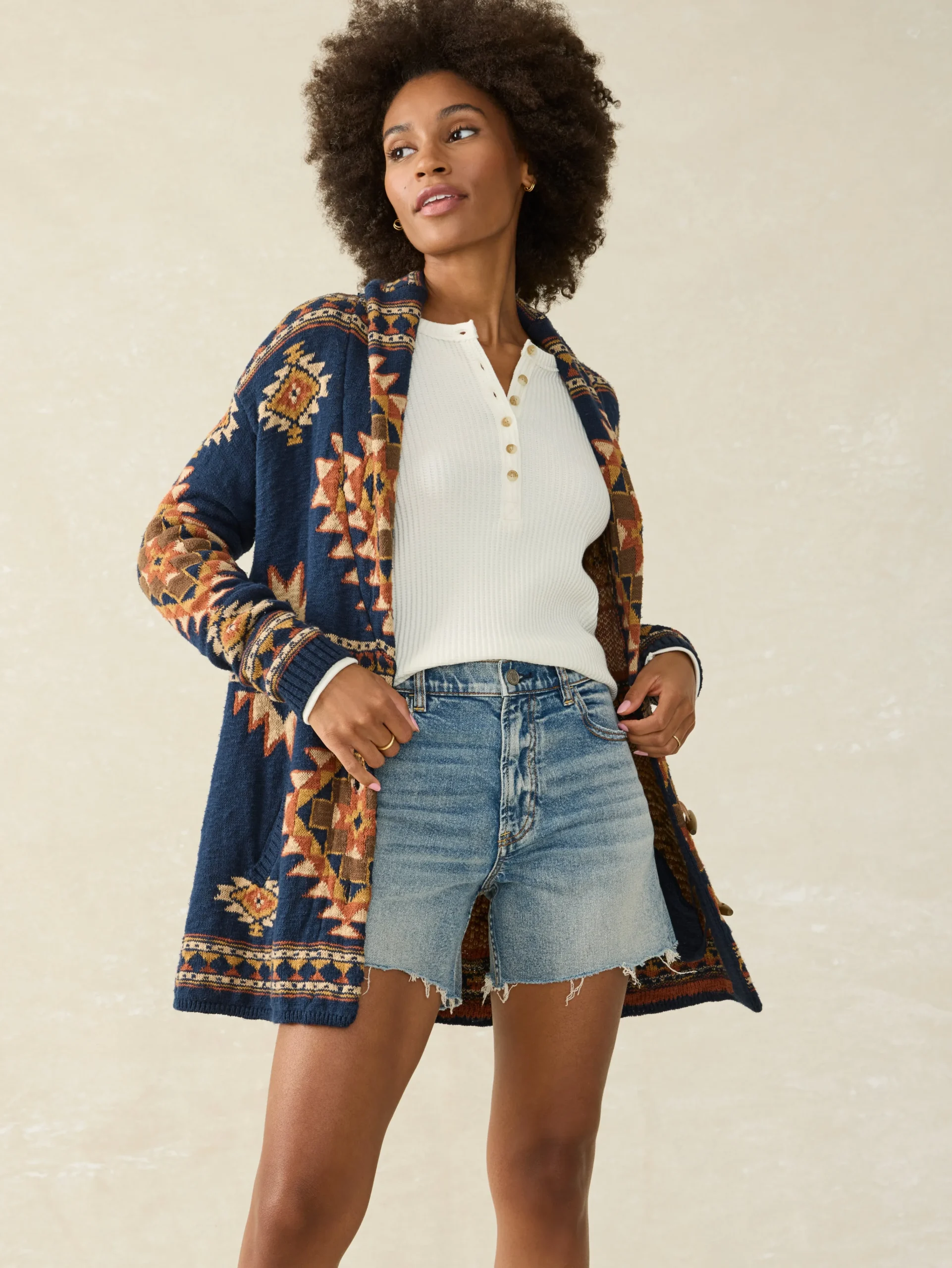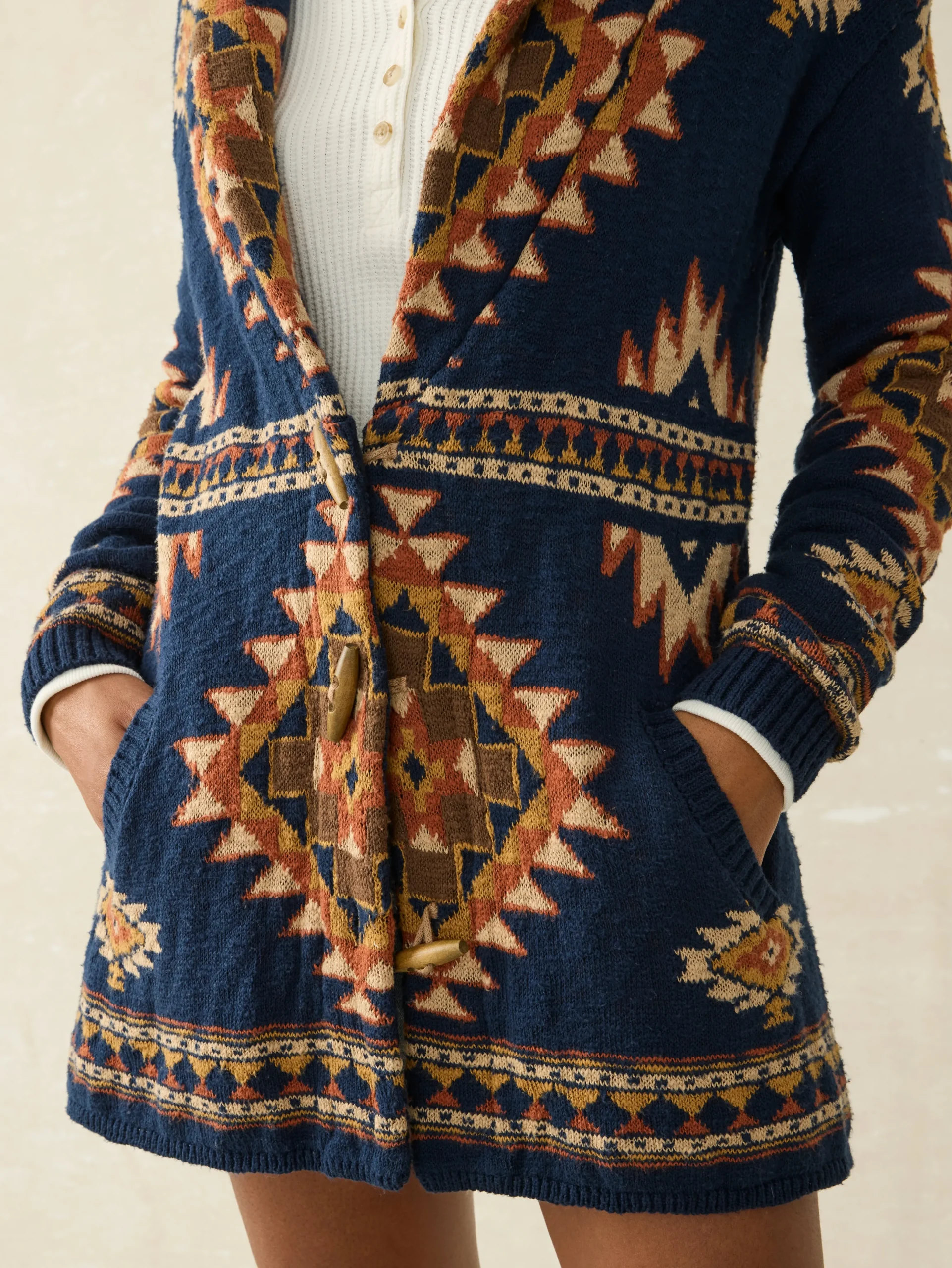 Designed by Native artist Bethany Yellowtail and knit in soft organic cotton, this relaxed sweater is our cozy go-to this season. Conjuring brisk walks and warm open fires, the easy cardigan shape features classic styling details like a shawl collar and faux horn wooden toggle closures.