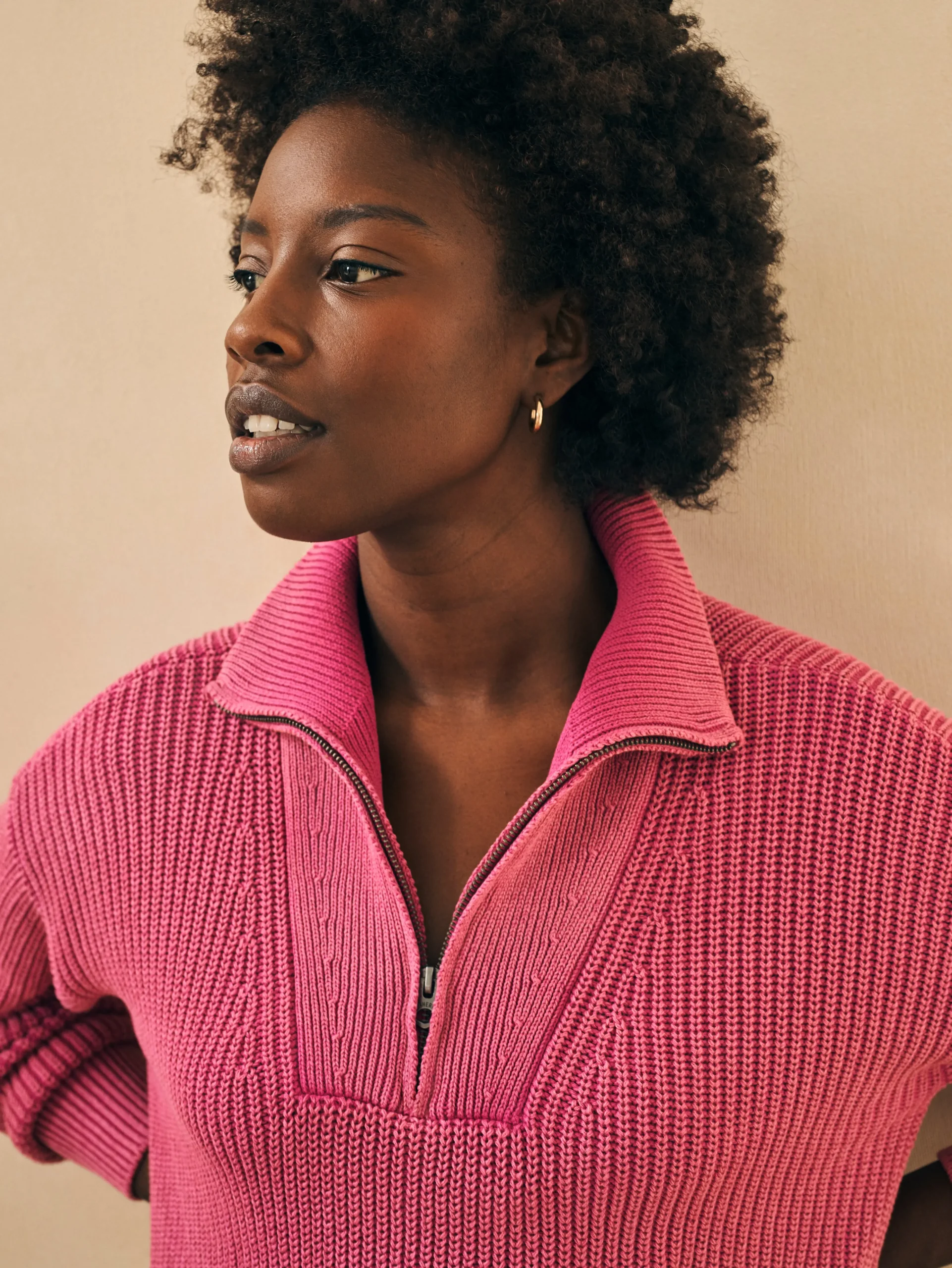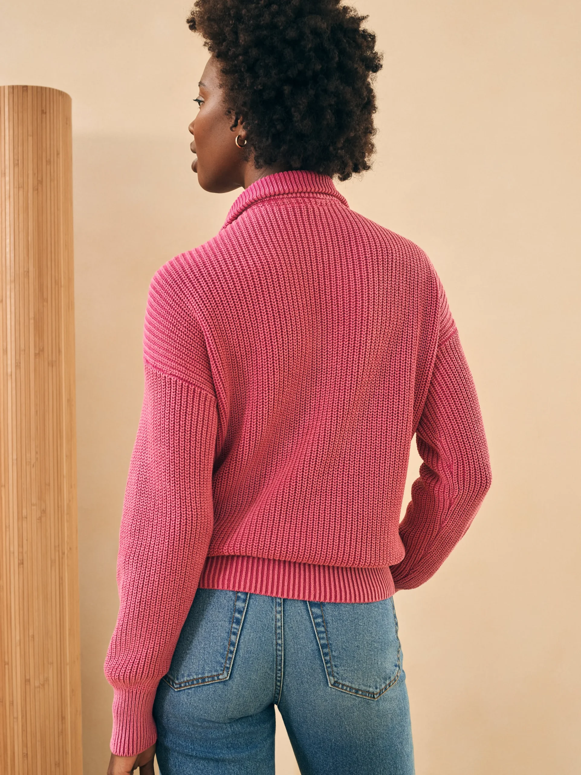 Inspired by the lived-in look of our favorite beach sweaters, this breathable, lofty knit has an appealing weight that makes it one of our most elevated offerings. Chunky, cozy, and soft, it’s designed with a half-placket zip that gives it a laid-back sweatshirt look for a casual but chic attitude.