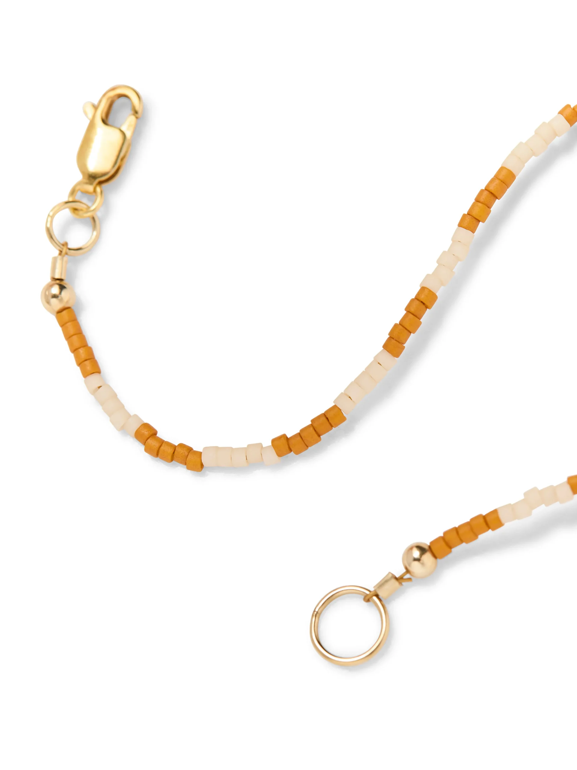 - Material: Ivory and Ochre glass seed beads with gold-filled accent beads and gold-filled clasp