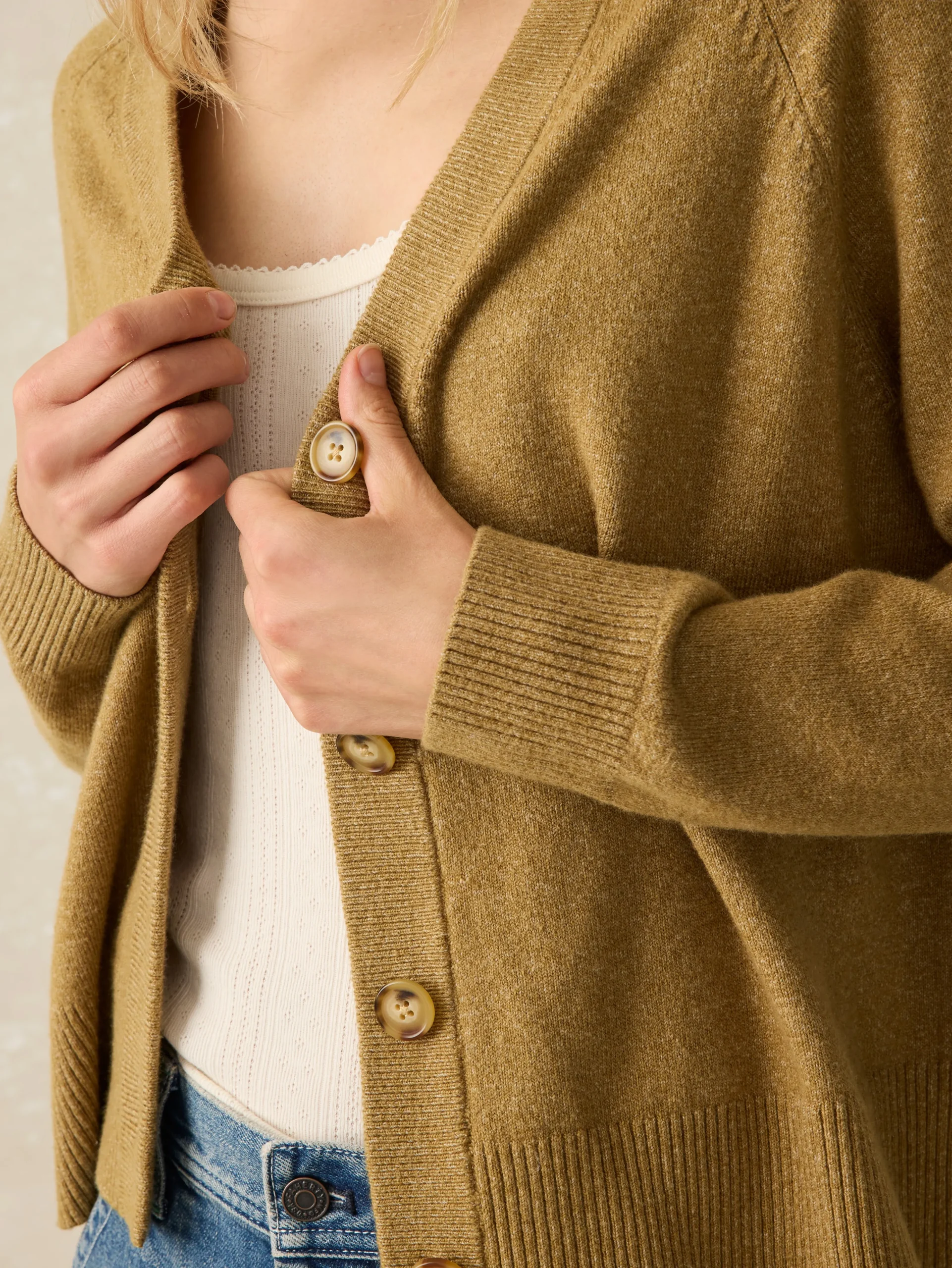 - Detail: V Neck Cardigan with horn button front closure and rib trim details.