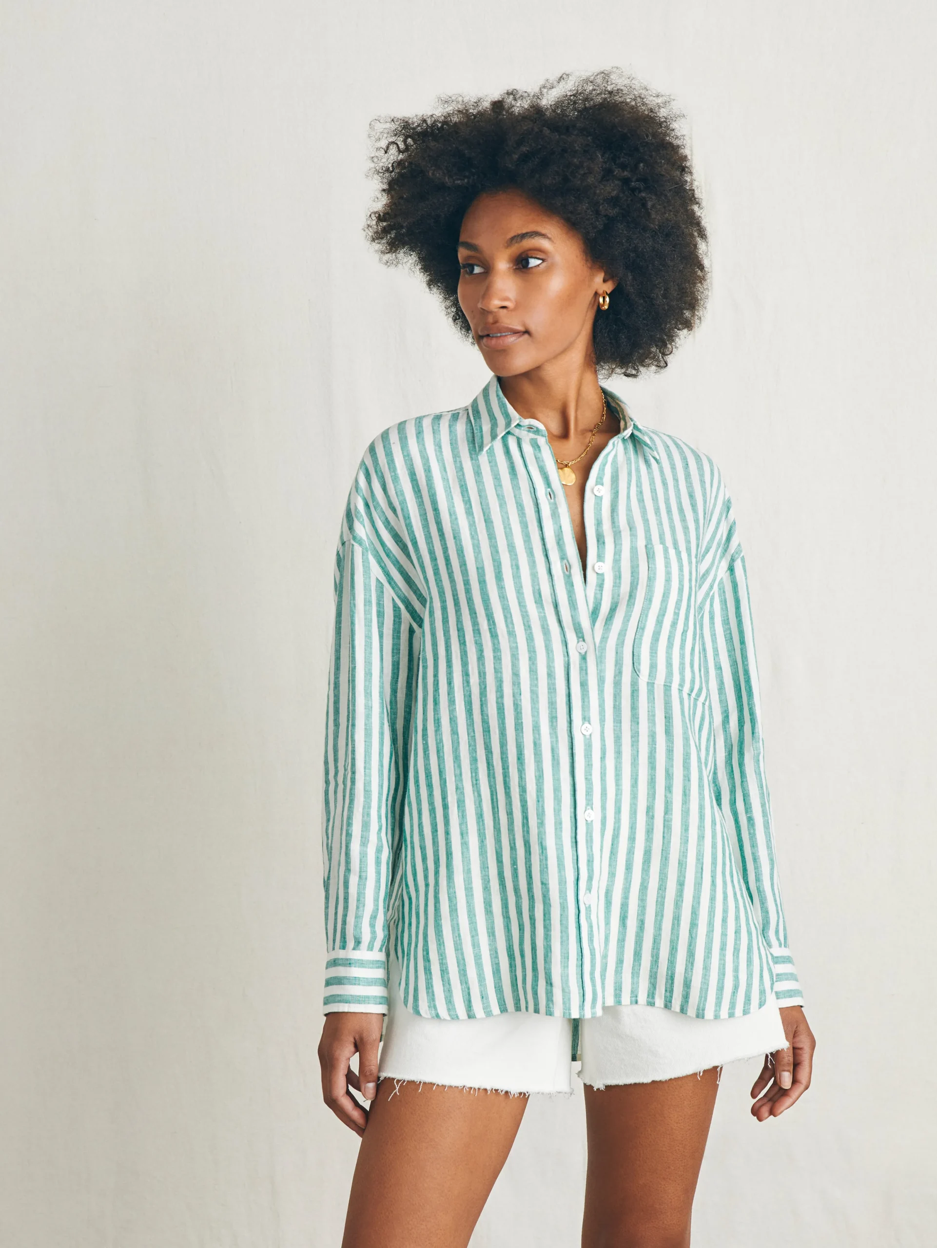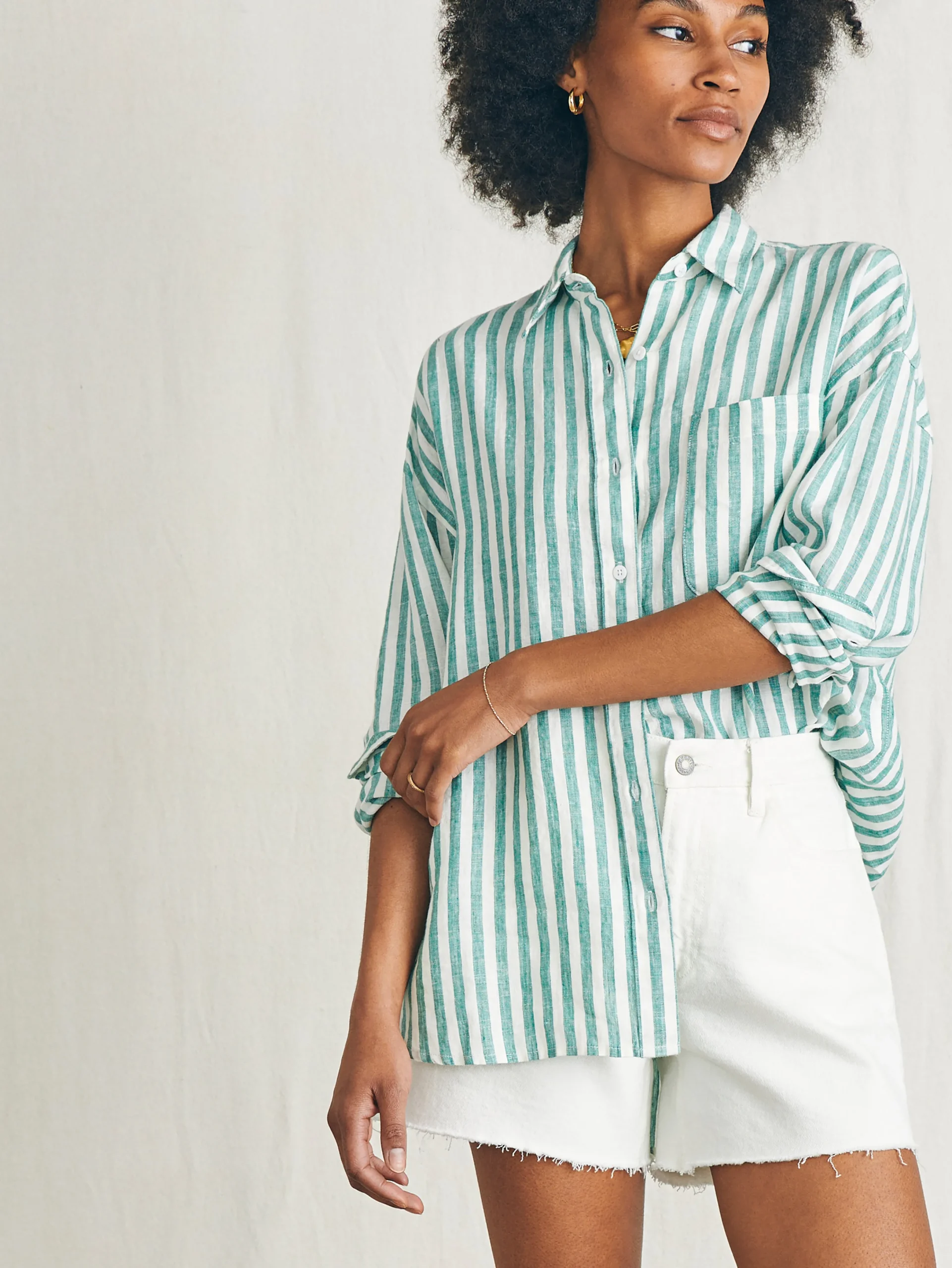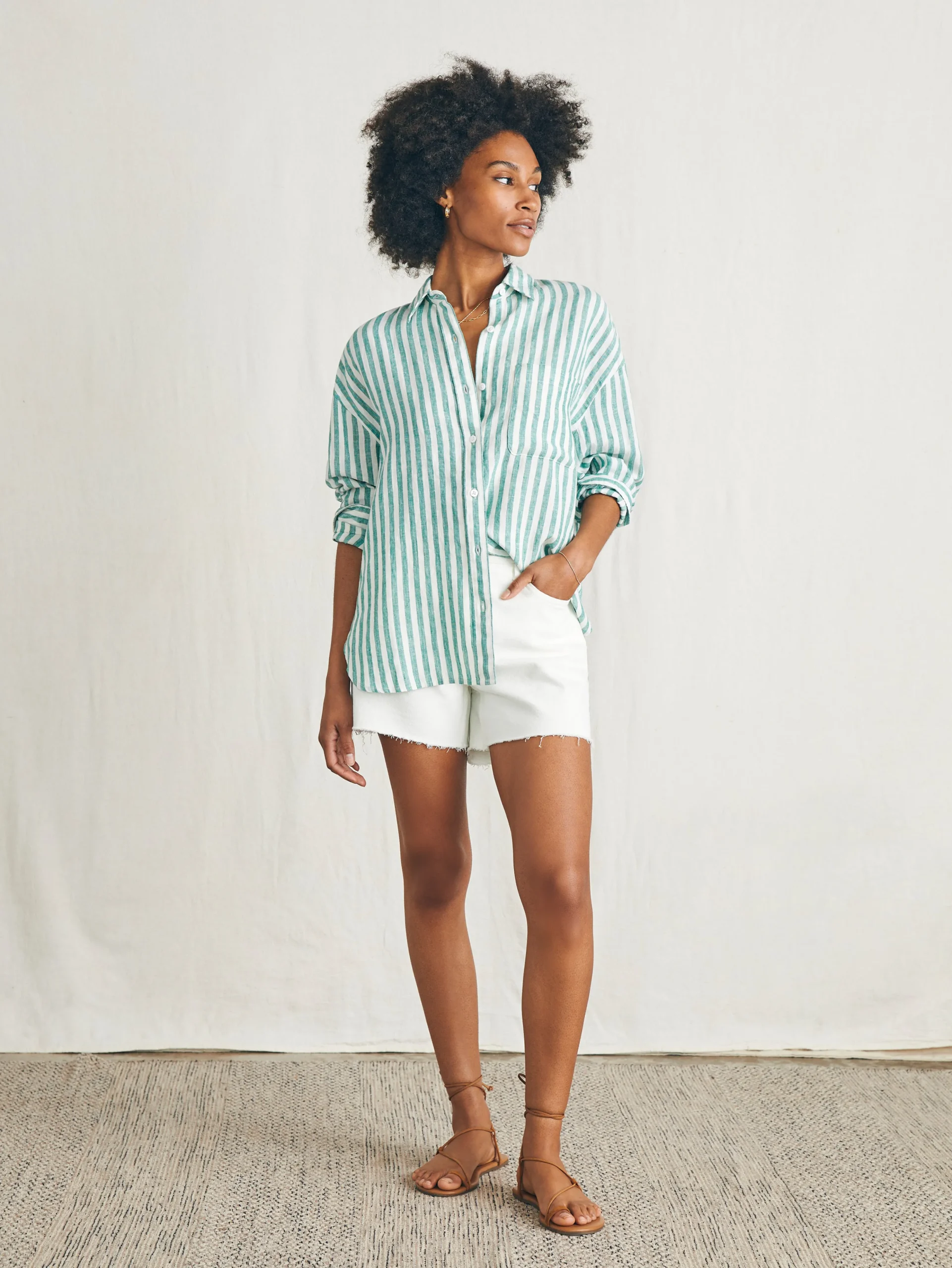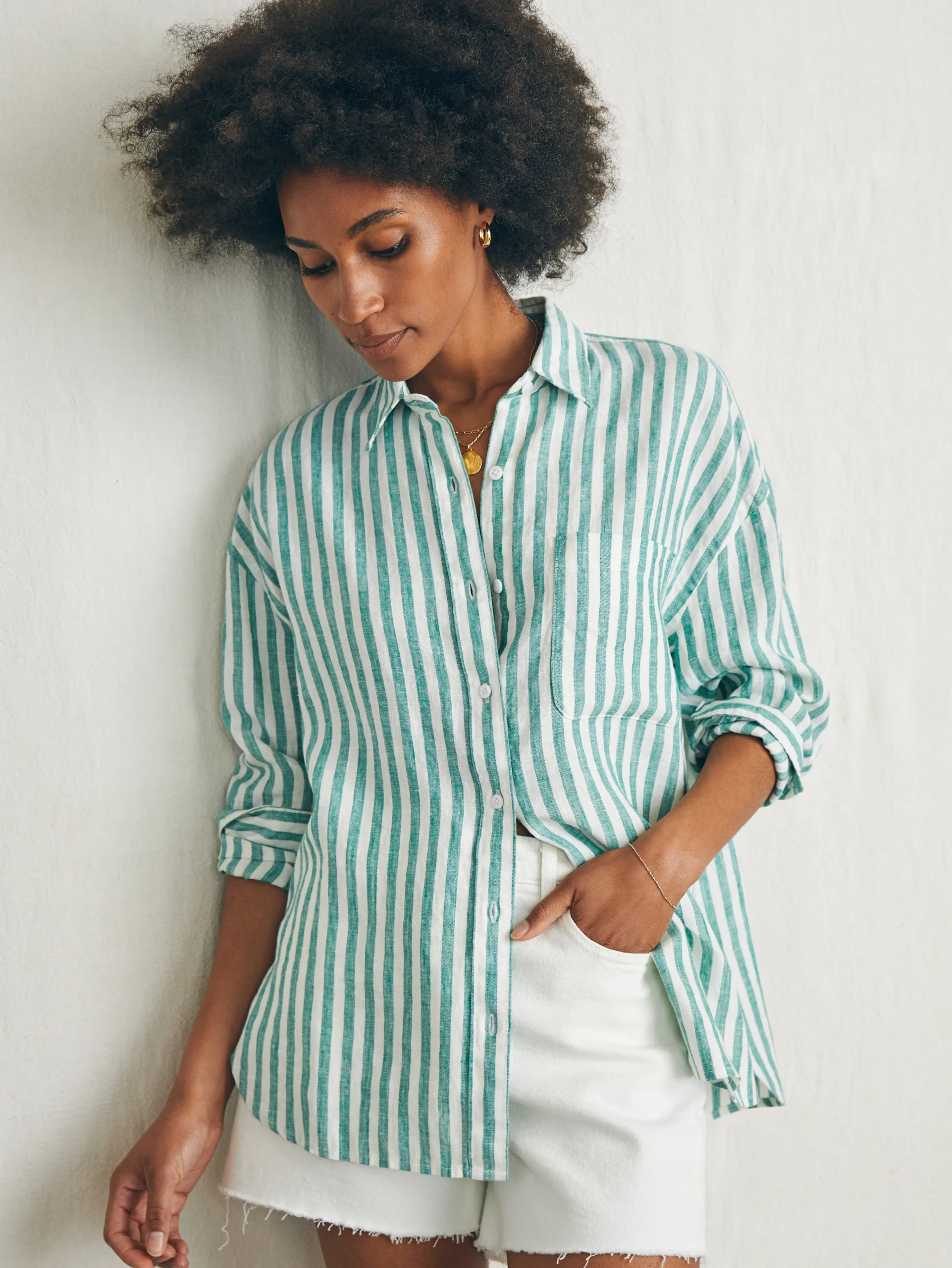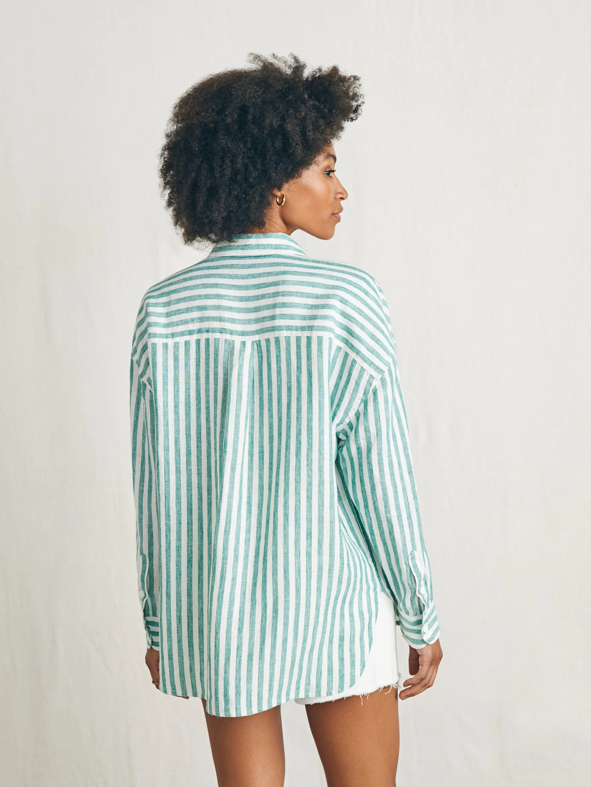 Naturally cooling, lightweight, and washed for incredible softness, this premium linen button up is an iconic summer staple. The loose, relaxed cut is ideal for versatile styling options – tie in a knot or wear open with a tank for that carefree summer mood.