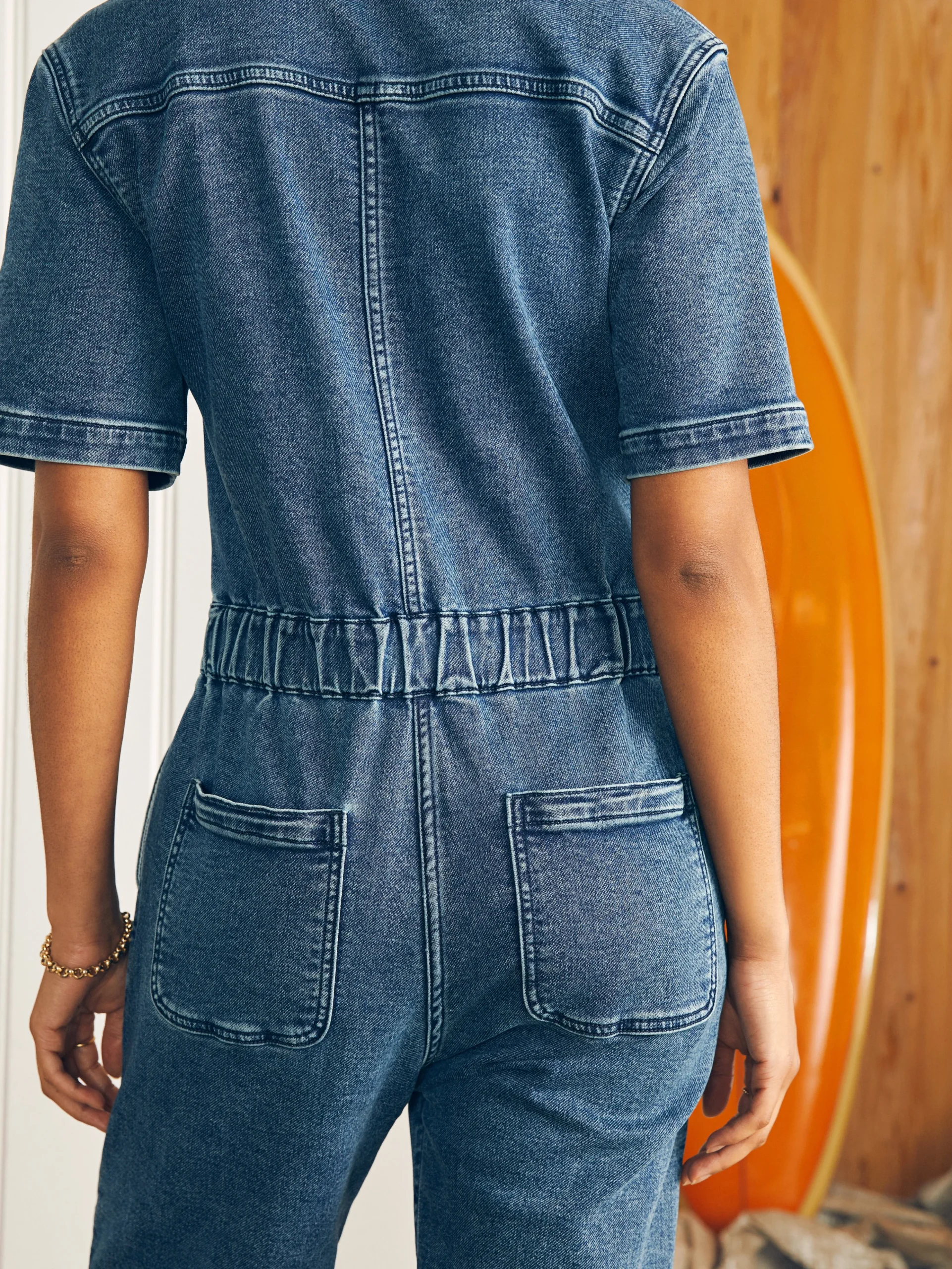 - Detail: Indigo stretch terry jumpsuit with short sleeves, patch pocket at chest and back. elastic back waistband.