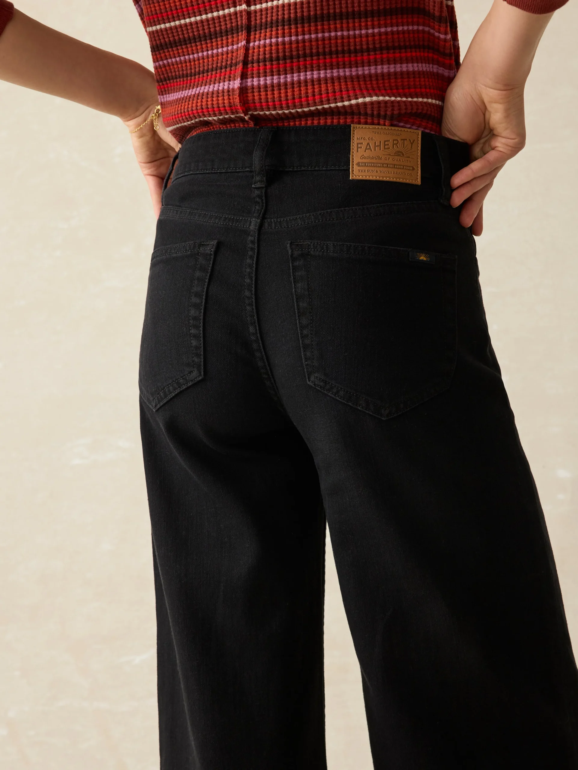 - Detail: Denim 5 pocket highrise wide leg jean. super soft, drapey, light weight stretch denim fabric. Dark black wash.