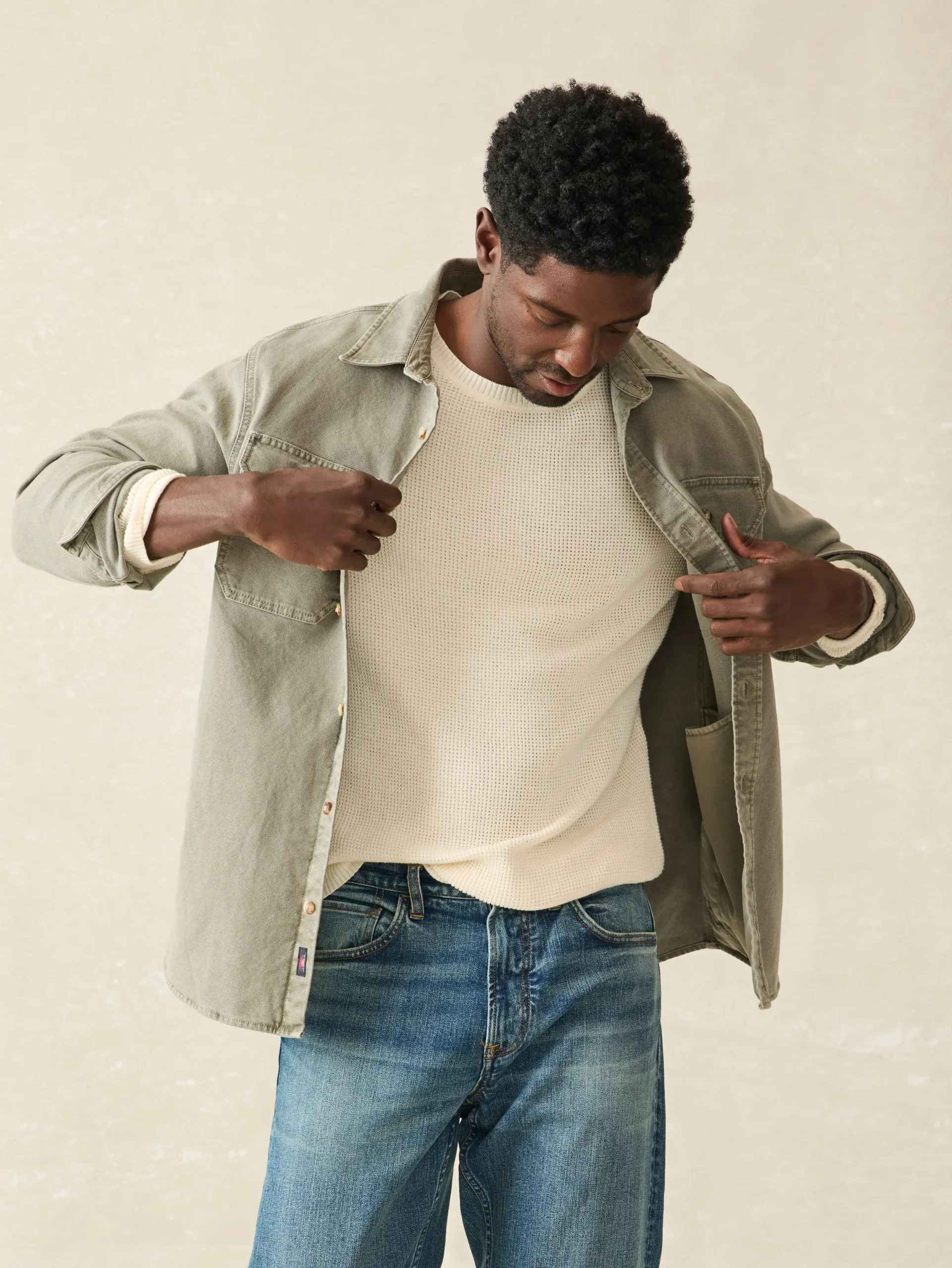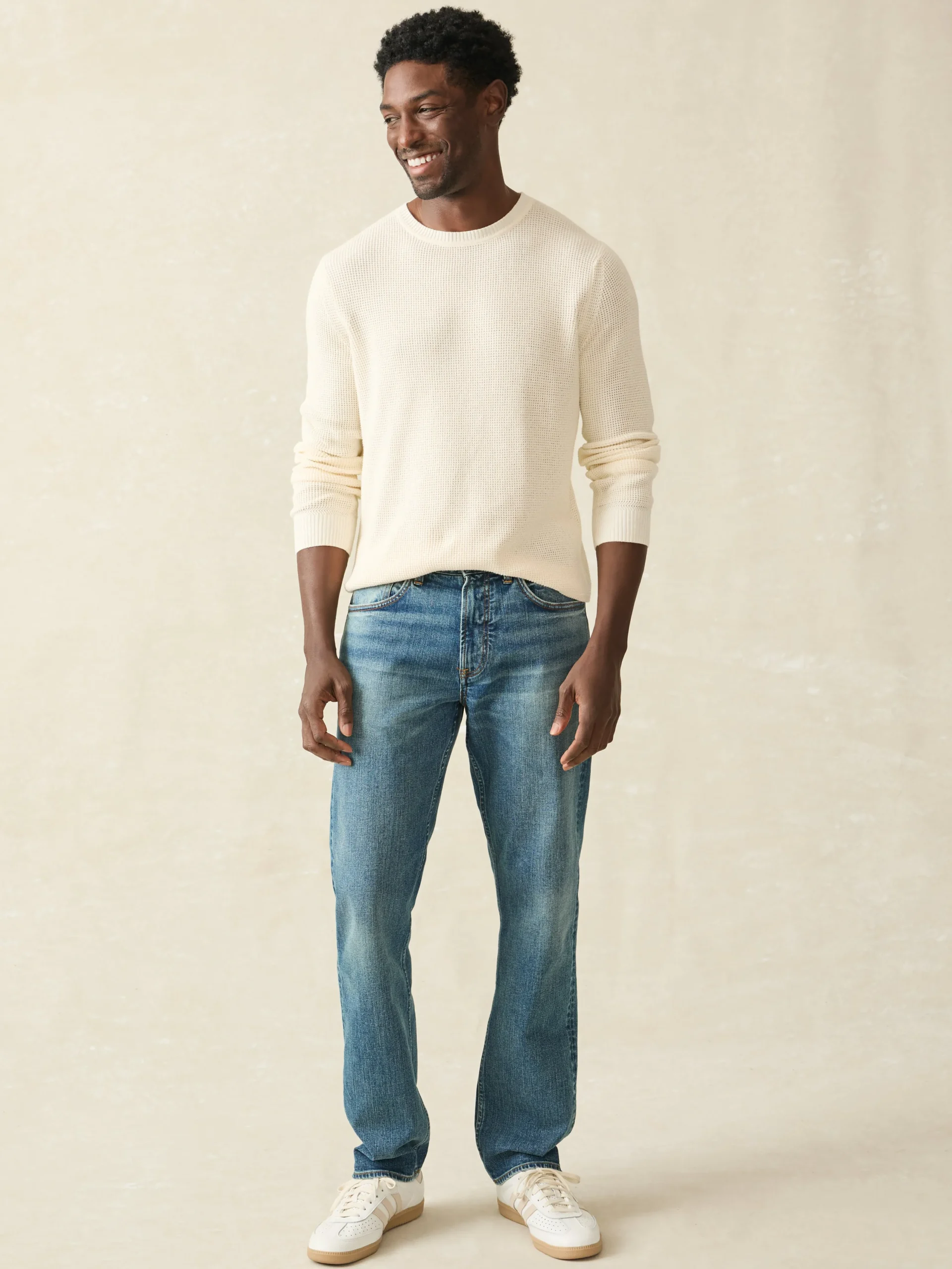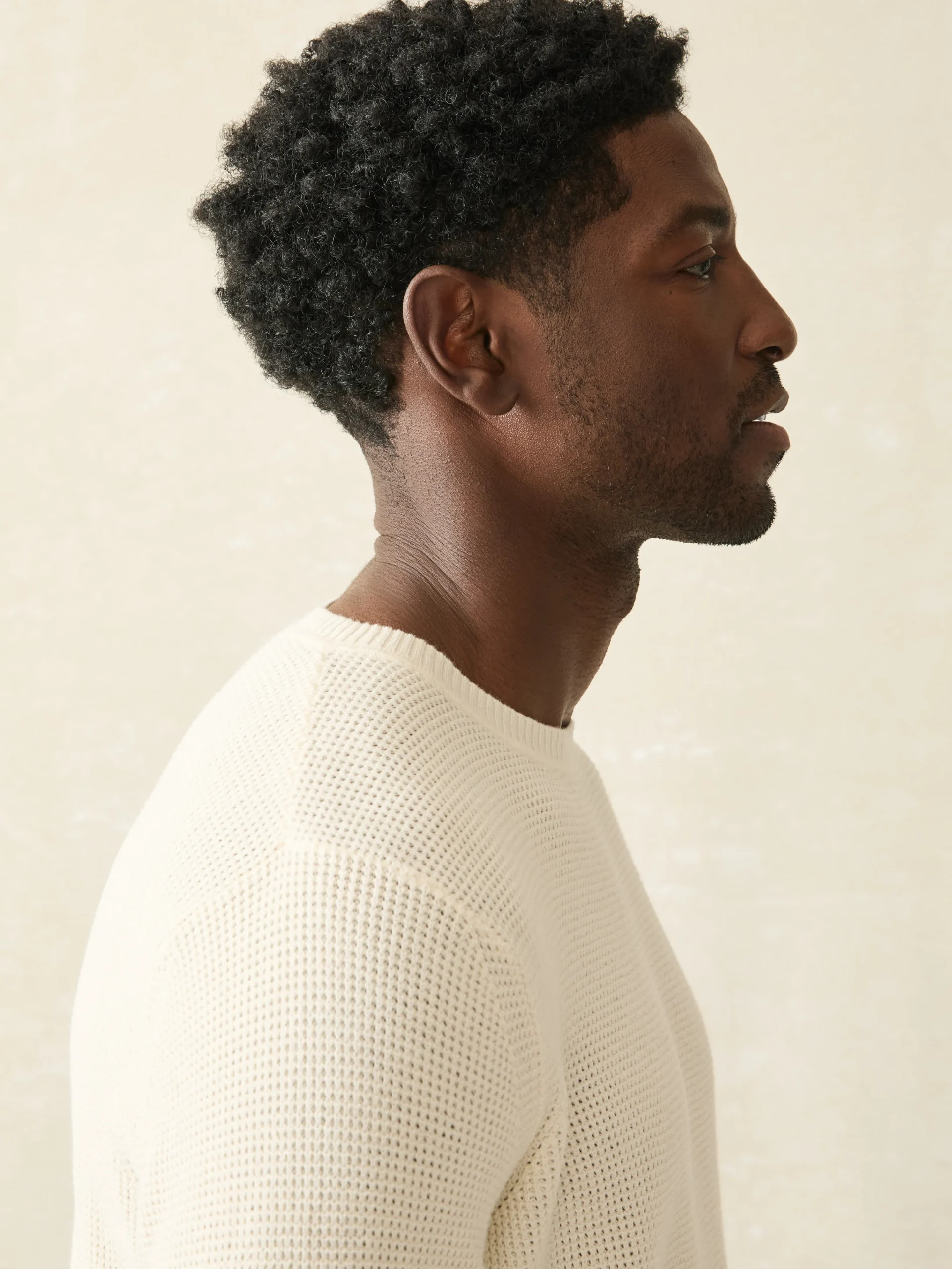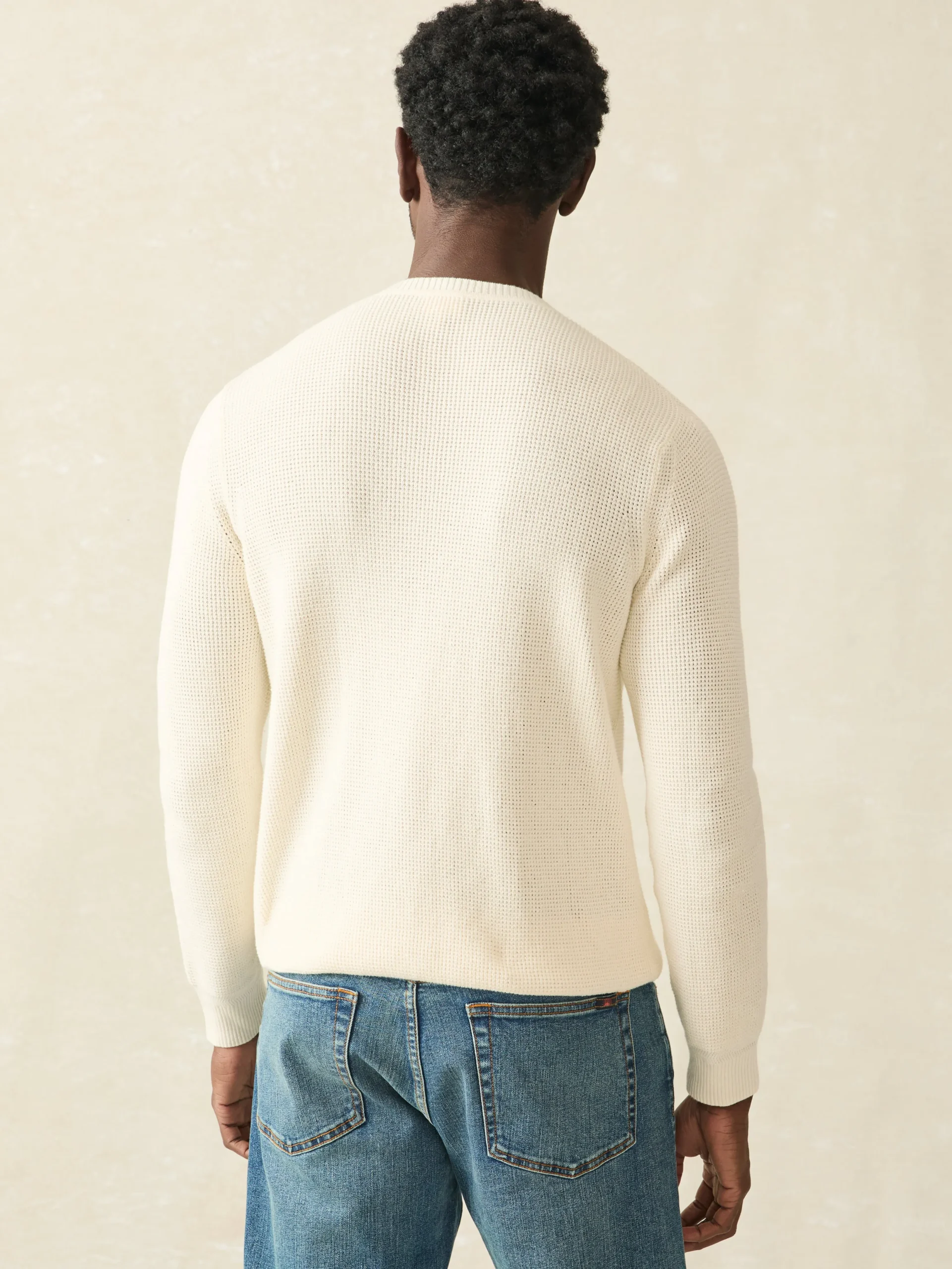 Designed as an easy to wear, transitional sweater., this will be your go-to year-round crew. Our cotton yarn is super soft but not overly warm and knit in an airy, waffle stitch giving the sweater dimension and texture. It’s then garment-dyed and washed for a lived in, vintage look and feel that’s casually cool for any occasion.