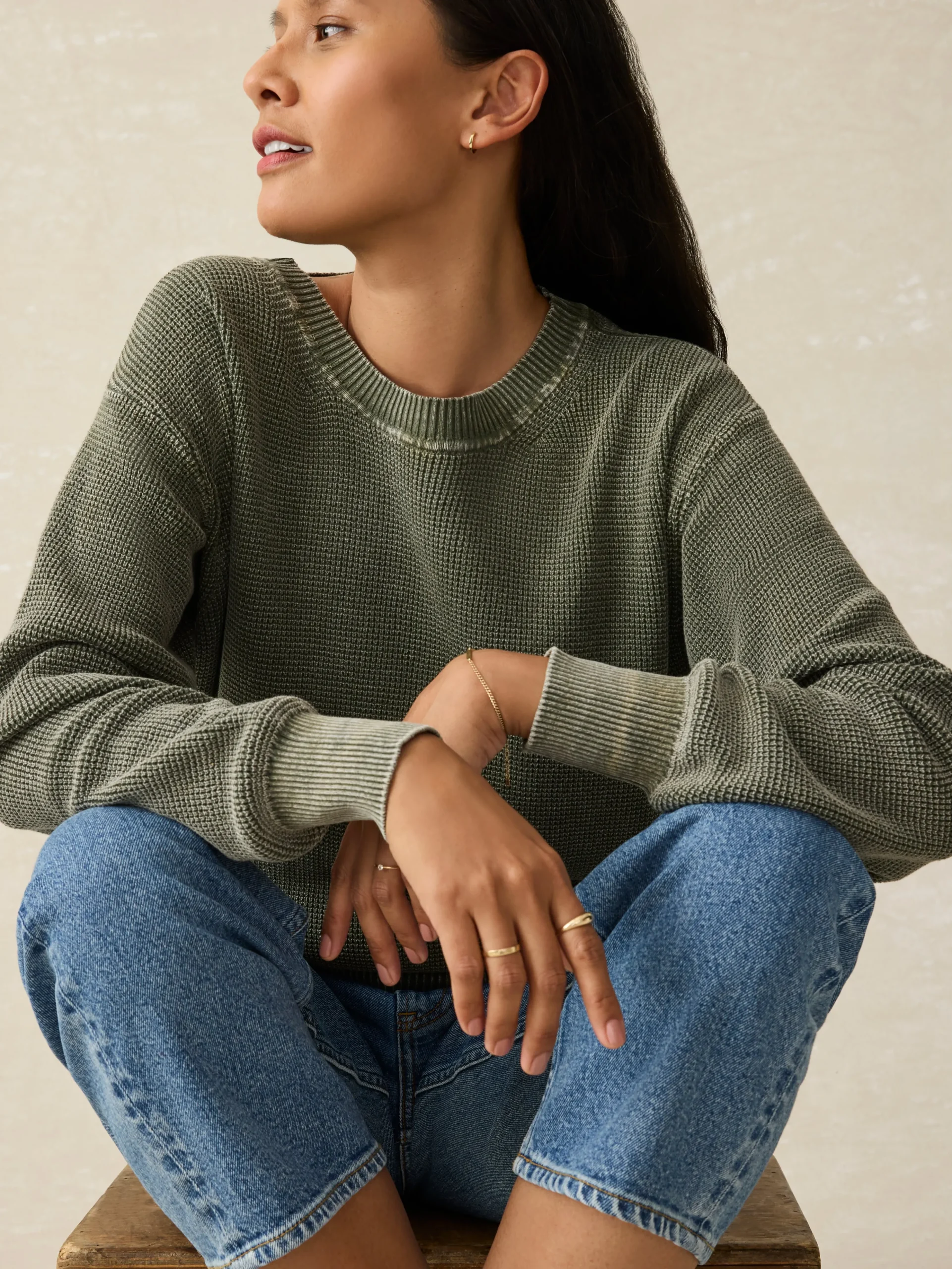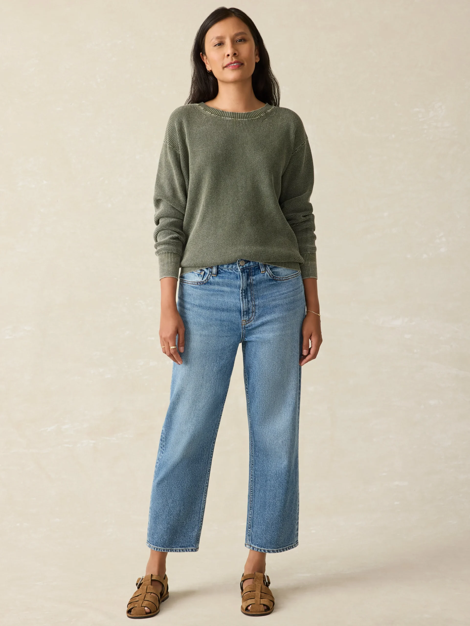 Our 100% organic cotton sweater was designed for those tricky transitional moments –when it’s getting chillier but you’re not ready for a full-on chunky knit. This waffle-textured knit has a lofty and airy feel that’s complemented by a relaxed fit and lived-in, sun-faded colors.